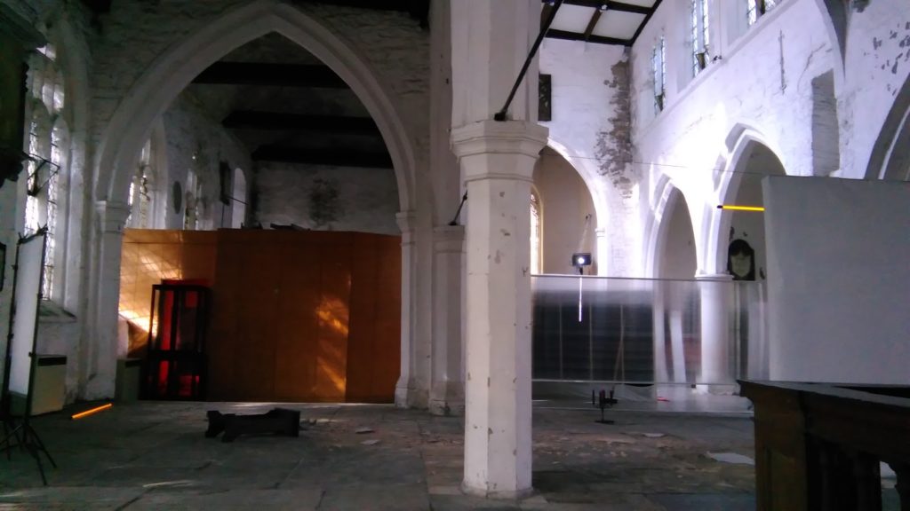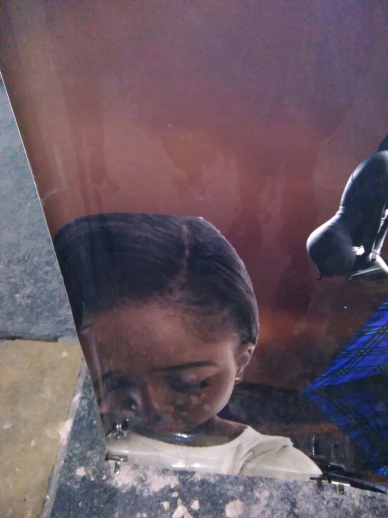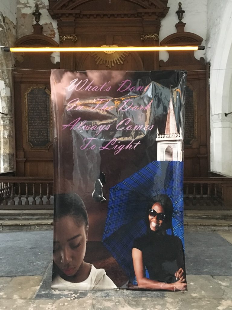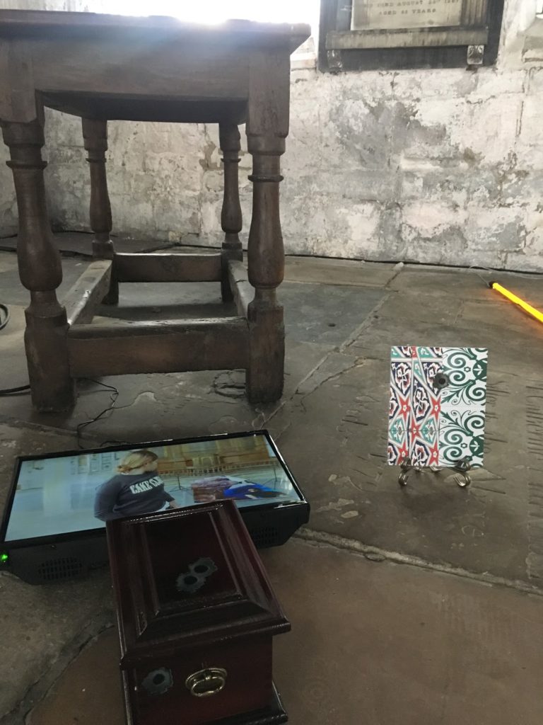 An icy-cold 11th century church might seem like an unlikely location for Brandon Covington Sam-Sumana’s first ever installation. Located in the Northern English city of York, the Fayetteville-based artist’s Life is… Grand centres around Lyric, the heroine of writer Mesha Mesh’s e-book trilogyJus’ Wanna Leave This Ni**a (IJWLTN) who struggles in her marriage to abusive womanizer Ty. The work was on display in The Stained Glass Centre of St Martin-cum-Gregory, as part of theYork Mediale 2018, which ran September 27 to October 6, 2018. Hosting gestures to Covington Sam-Sumana’s often-opaque though highly evocative imagery, sounds, enactments and samples, the staging of the exhibition confounds visuality by playing with scale. There’s a video soundtracked by Melanie Fiona’s 2009 RnB hit ‘It Kills Me’ playing on a tiny screen on the stone floor. Large format photos of ‘book covers’ resembling those of the digital pulp genre hang suspended in view of a small, bullet-ridden casket. It looks like an aftermath.