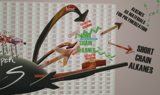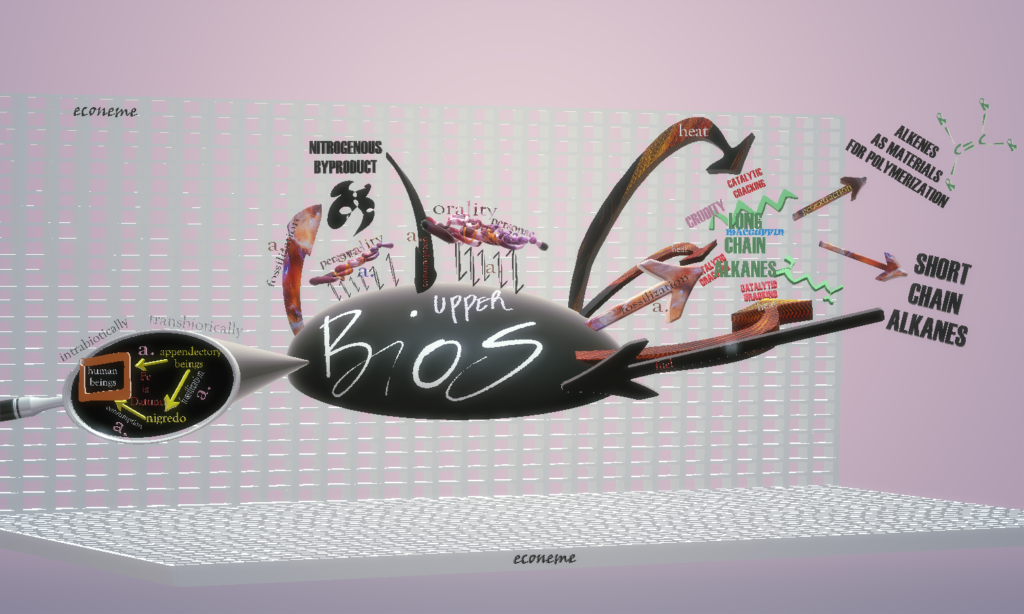 The chart itself associates death, degradation, and fossilization with eugenic terror, digitality, crudity, and abstraction by examining the process of catalytic cracking that is integral for the refinement of crude oil. It presents energy production as being totally reliant on fossilization and death for the creation of nitrogenic byproducts that are then meant for the enrichment of both soils and air, which feed the biosphere as a whole. Something important to note is that these nitrogenous byproducts aren’t gesturing strictly to dead, decaying bodies. They are as much compost bins, sewage, and earthworms as they are ghettoizations, gentrifications, and genocides. ‘Shithole McGuffins’, through its direct reference to the invented term ‘econeme”, aims to characterize these processes as being largely automated… and like any automation, it means that these processes had a start, and when the infrastructures constituting them fail or become obsolete, they will face an end.