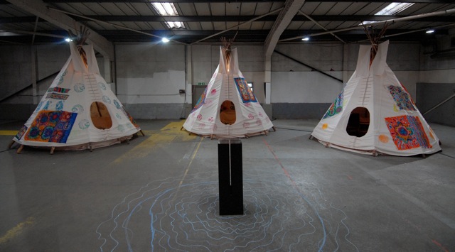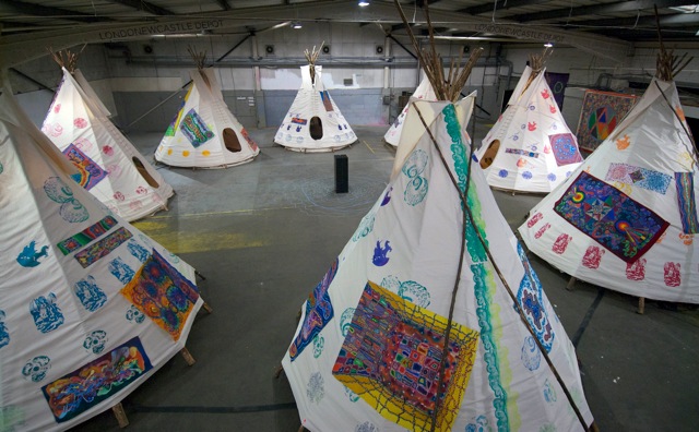 It essentially is a makeshift indoor village made of a circle of 8 tepees decorated with colourful paintings and stencils. Each contains a different environment saturated in Reid’s own aesthetic: a projection room, a printing room, a smoking room, even a bedroom. The many stabs at corporate culture and capitalism are sharing the stage with references to pre-colonial cultures and more abstract, colourful elements. It’s beautiful to look at but the fun really starts when you realise that this does not have to be approached in the same way you would approach a Turner landscape at the National Gallery.