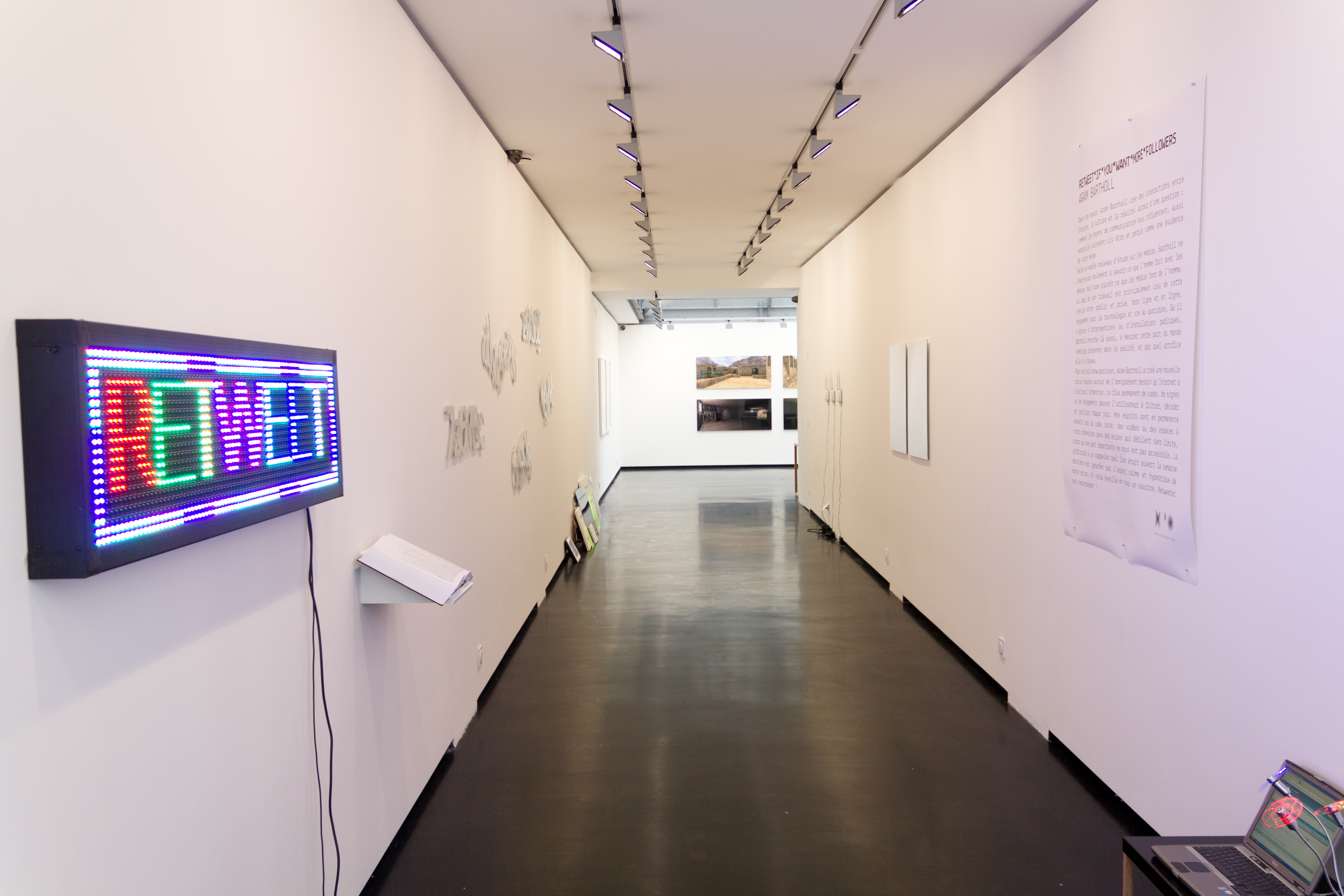 If contemporary internet-based art is anything to go by, the world-renowned German artist Aram Bartholl could be qualified as a ‘conscientious objector’ of web 2.0. Indeed, right from his start in 1995, and later through his collaboration with the The Free Art and Technology Lab (F.A.T.), he skilfully forewarned people of the coercive power of technology, media and, to some extent, social networks. The exhibition ‘Retweet if you want more followers’, a title that reads like a daily mantra for any surfer, is an examination of the issues of interaction between the virtual world, reality and their collusion.