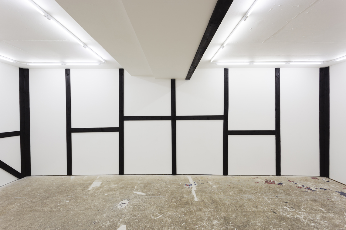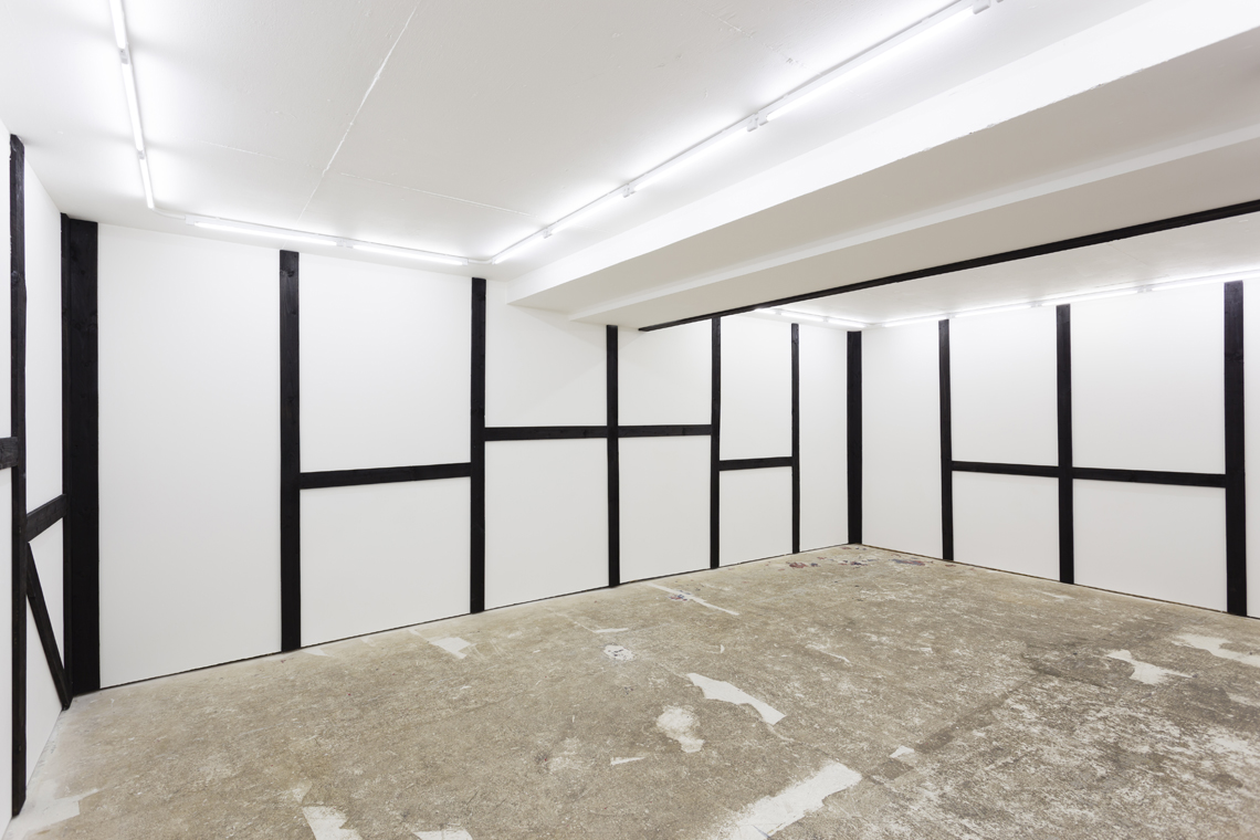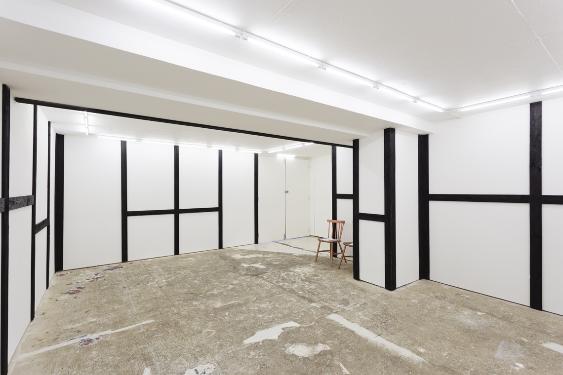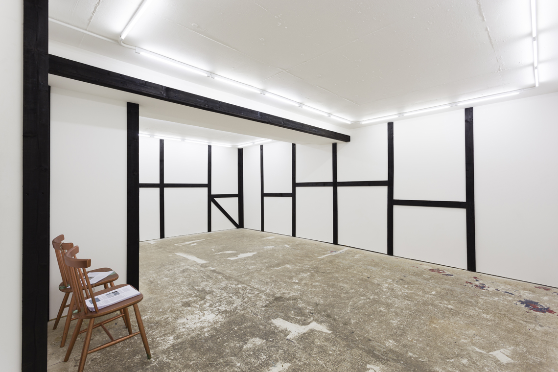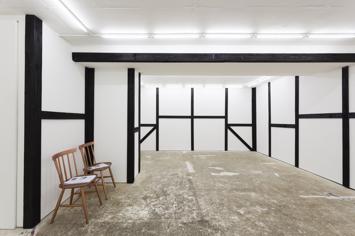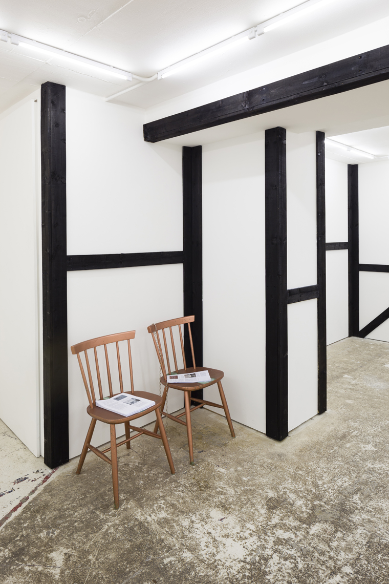 In L.I.B.E.R.T.Y. Morag Keil has transposed the mock Tudor facade of the department store into the gallery. Each wall is decorated with strips of black half-timbering – appropriately treated, carefully cut and professionally attached. It’s a slightly disorientating experience, the framing exists as a relief whilst shifting the reading of the entire space with its specificity. We’re suddenly enclosed within a form that suggests an exterior – the facade of Liberty is wherever you look. We are trapped outside, inside, with no way to access what’s behind the walls.