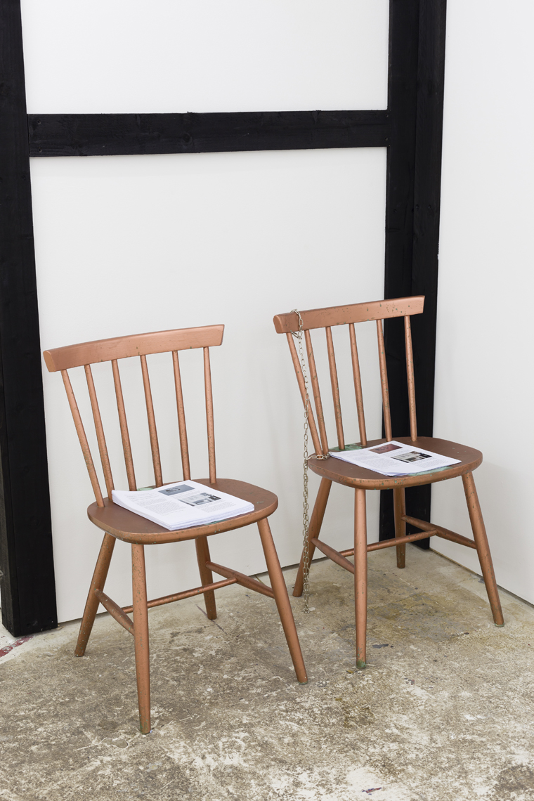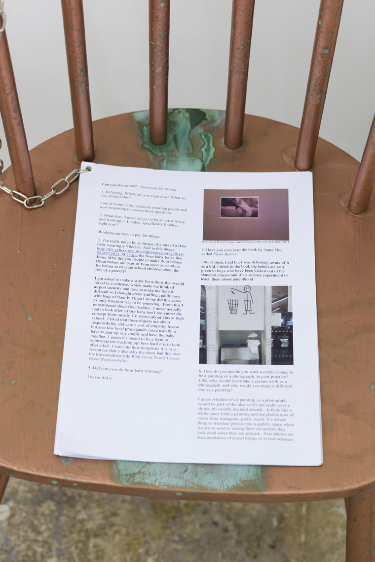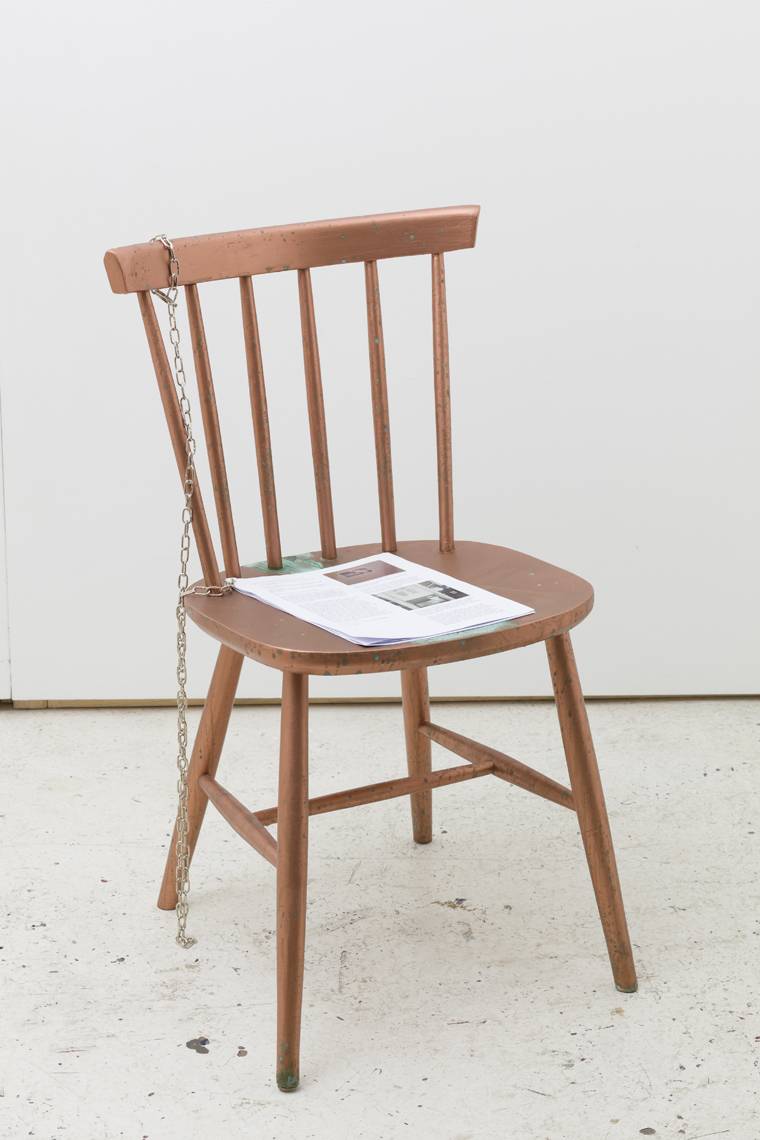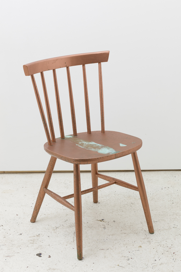In the corner of the gallery are two Windsor chairs painted with copper paint and splashed green with oxidation. Arranged like in a waiting room they hold copies of the exhibition text – an interview with Keil by Harry Burke. Titled Can you live in art? it’s conducted in a 20-questions format, like an unedited magazine lifestyle interview, informal but professional. They discuss Keil’s recent work, as well as her approaches and ideas on the art world and the state of contemporary living. One answer is conspicuous in its absence, there’s simply blank space in response to, “Do you have a social art practice or a formal art practice?”