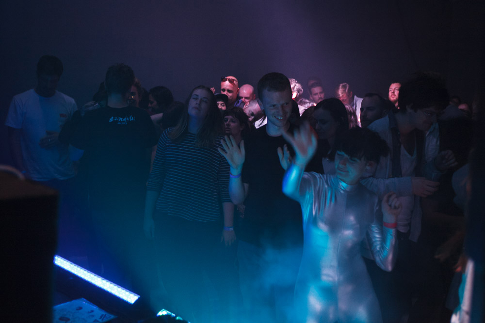 Later on, Hannah Sawtell’s performance was an immersive and disorientating experience. Lit only by a powerful strobe light, she filled the room with dark synths and distorted drum hits, layering harsh waveforms to staggering effect. At times it was a dense attack on the senses, the sharp highs cutting through the rolling bass sequences. The modulators seemed to be running at multiples of the tempo of the strobe, making the performance encompassing and physical. As it ended after a brutal 30 minutes, one staff member muttered “thank fuck”. Long after the performance I was still mentally emerging from the experience – the outside world seemed to move with more fluidity, and to be a little quieter.