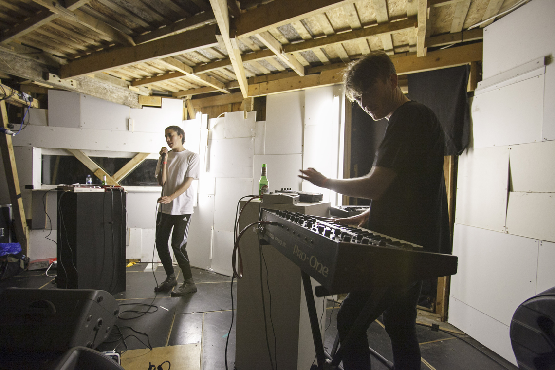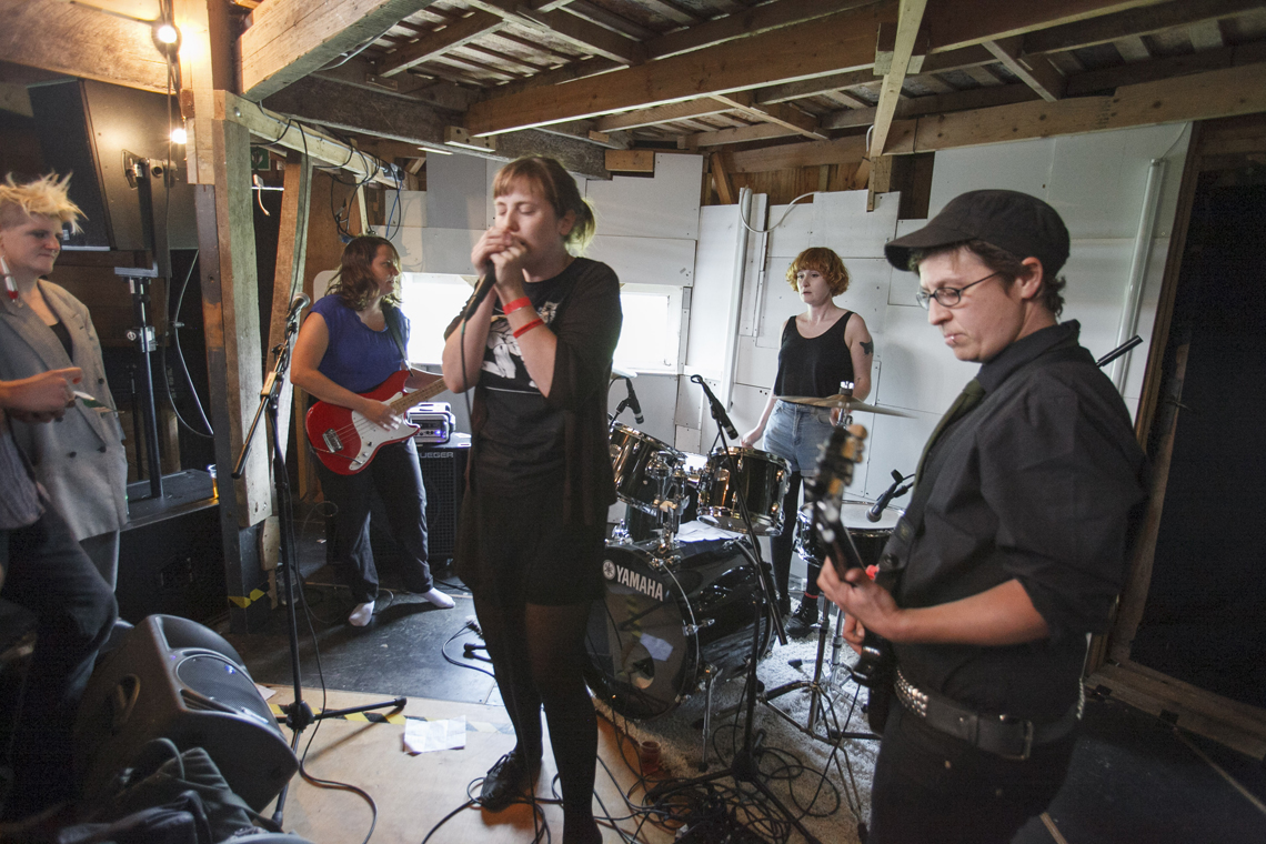 I make it on time for Ravioli Me Away, whose theatrical costumes, post-ironic 3D estate agent porn and smoke machine camp make me think I’m in for some knowingly artsy music hall moment until they start playing. They’re hard. And tight. And funny, and angry – though I can’t hear the lyrics very well, but what I make out sounds like pissed-off parafeminism with a dose of fuckit-whatever. Smashing out a hard beat on the tom and snare, Sian Dorrer – dressed in a silver hentai jumpsuit – can really sing, and does, all while holding down the rhythm with such a fierce energy it’s impossible to stay unmoved. Alice Theobald, a performance artist in her own right, is on the keyboard synth and second vocal, sardonically intoning half-spoken ripostes that provide a sort of affective texture to the narrative of the beat. Rosie Ridgway smacks out throbbing basslines like a frenetic punctuation of glottal stops, simultaneously soft and hard and round at the edges. Dance? I nearly died.