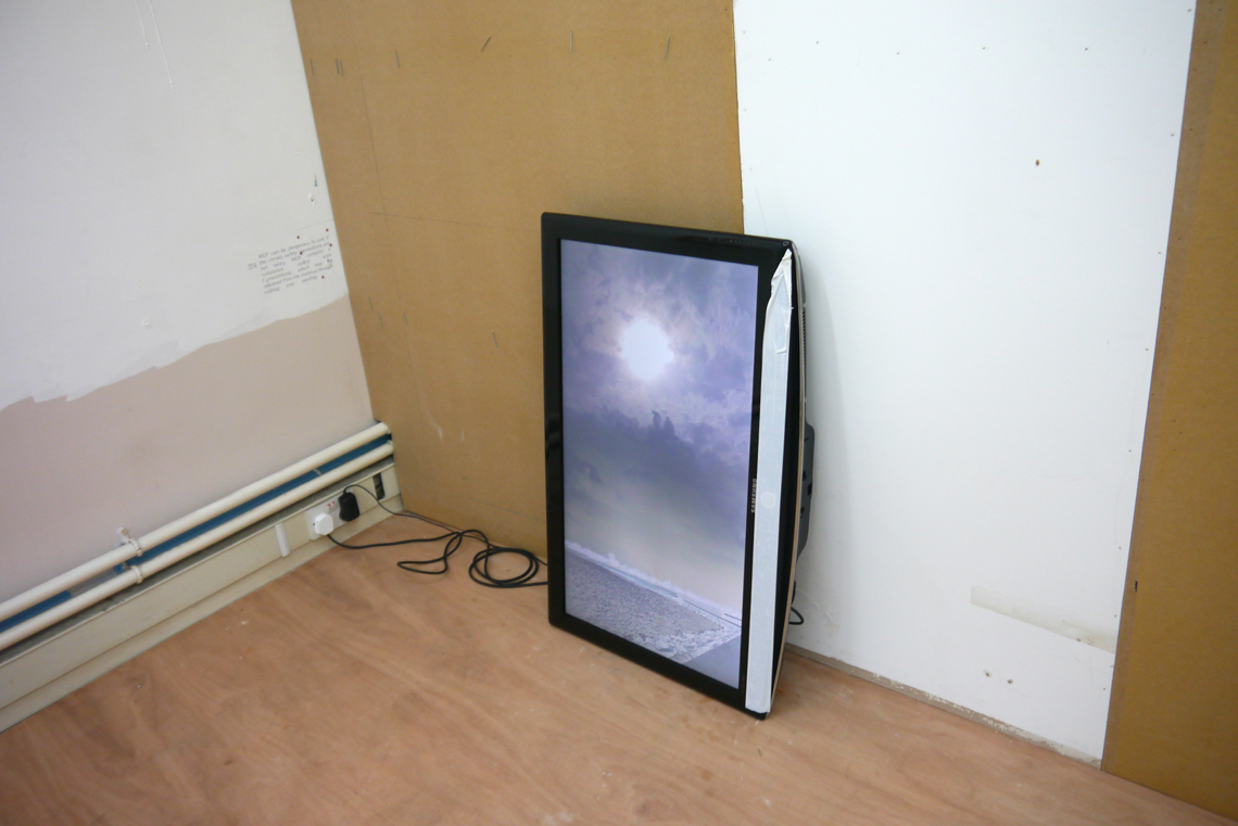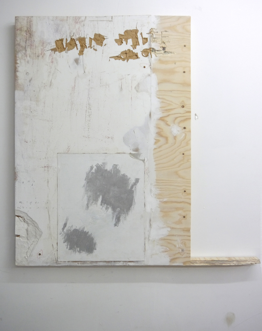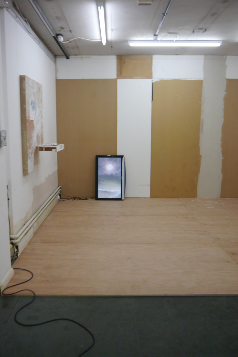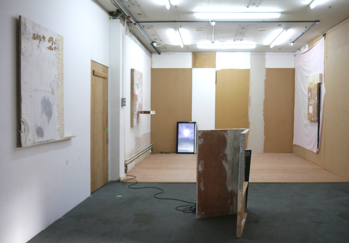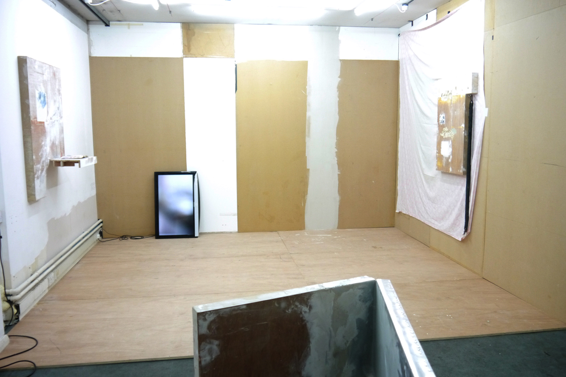 WASH is the inaugural show at Happy Times, the gallery space in Milcote House, and the walls are still raw in places. A thick seam of plaster runs down the far wall to the floor and disparate panels of rescued wood and board form an impromptu collage on one side. This, it seems, all part of the installation; a series of composite or material collages, Takeshi Shiomitsu’s paintings throw the patchworked space into relief and lend the provisional build – perhaps itself a product of Happy Times curator Matt Welch’s aesthetic – a formalistic quality. Two screens stand on their ends on the floor (the portrait-aligned screen is fast becoming a Shiomitsu trademark) playing the same loop in rough sync. It’s an anxious supercut of close-ups and wide-shots; the former read as compulsive and the latter as alienated, like walking through a place you know you don’t belong. There is sound: a breath, a wave, a series of beeps like a heartrate monitor, the life signal: affirmative. The beeps are steady and then they’re not; one falls out, hush! And it all falls down for a second, uh. Like holding your breath, or a heart that skips a beat. When the ambient noise of a crowded bar comes through, it’s too loud, overwhelming; the accompanying footage a blur of lights and what might be bodies. Moving through – to silence. Beep. And the slow glow of an ocean.