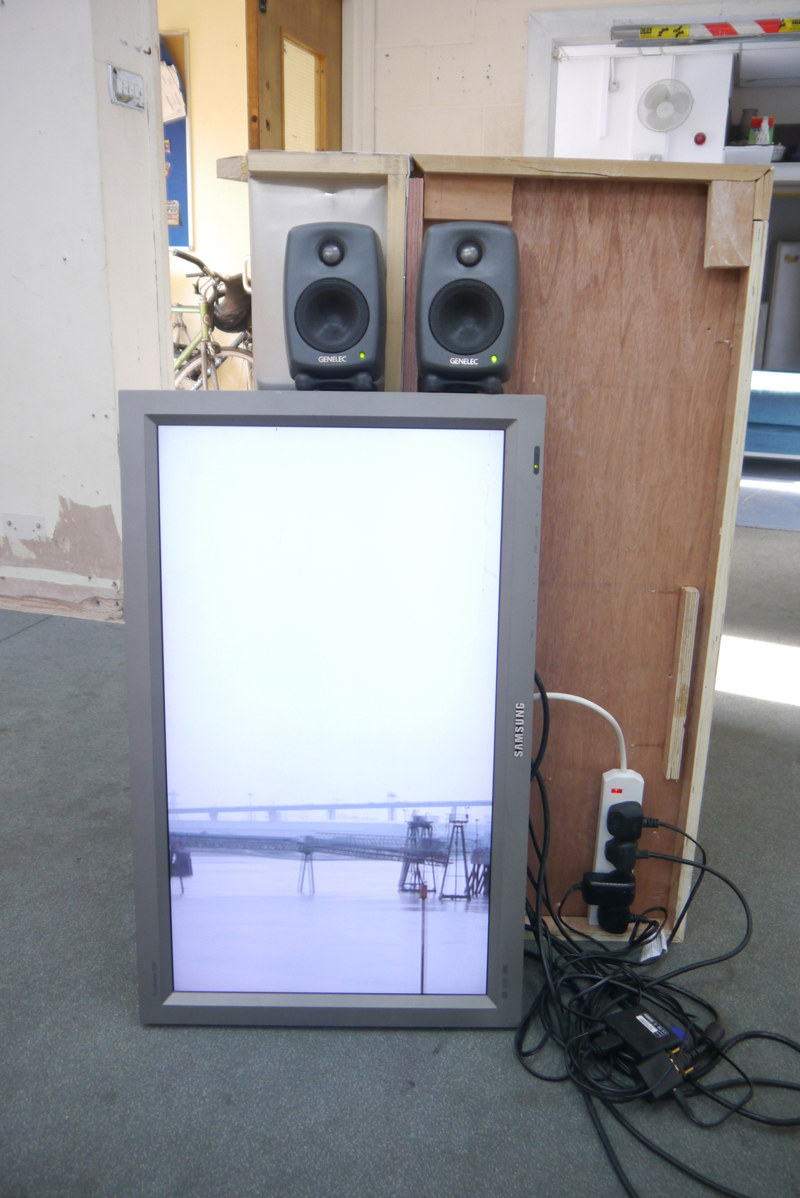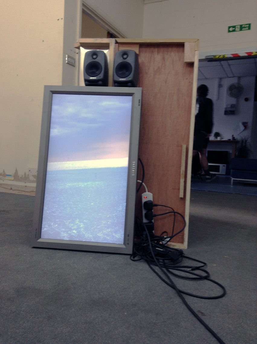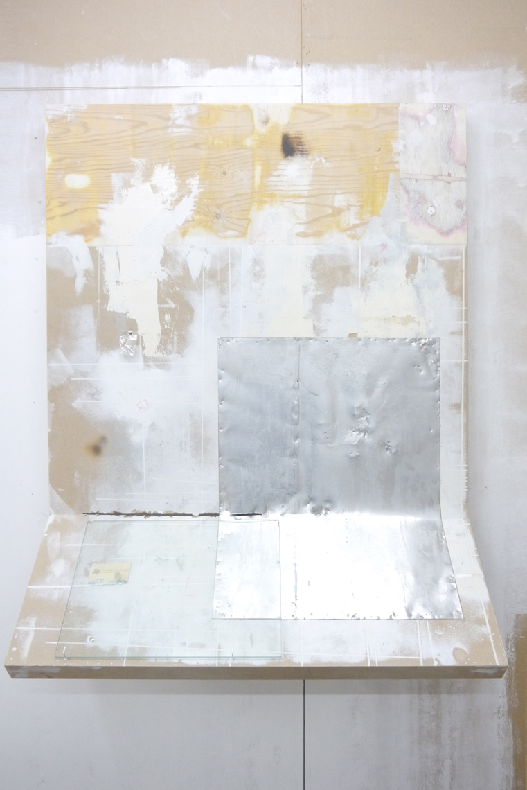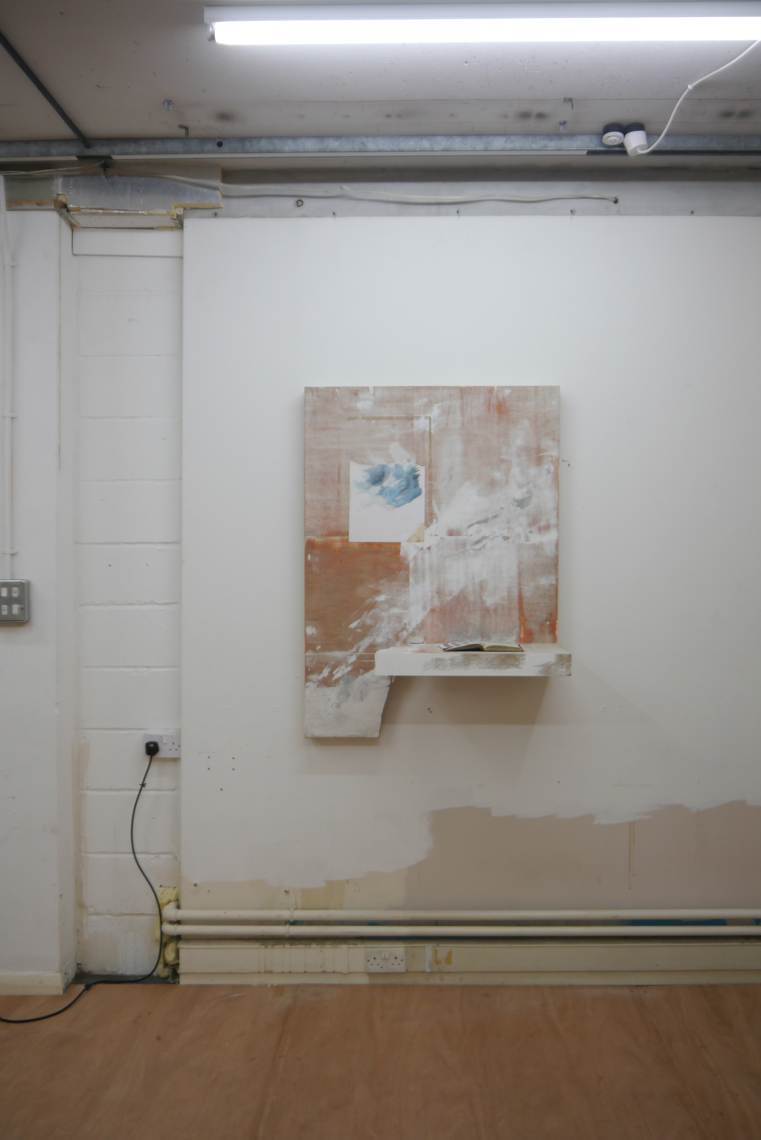 WASH is the inaugural show at Happy Times, the gallery space in Milcote House, and the walls are still raw in places. A thick seam of plaster runs down the far wall to the floor and disparate panels of rescued wood and board form an impromptu collage on one side. This, it seems, all part of the installation; a series of composite or material collages, Takeshi Shiomitsu’s paintings throw the patchworked space into relief and lend the provisional build – perhaps itself a product of Happy Times curator Matt Welch’s aesthetic – a formalistic quality. Two screens stand on their ends on the floor (the portrait-aligned screen is fast becoming a Shiomitsu trademark) playing the same loop in rough sync. It’s an anxious supercut of close-ups and wide-shots; the former read as compulsive and the latter as alienated, like walking through a place you know you don’t belong. There is sound: a breath, a wave, a series of beeps like a heartrate monitor, the life signal: affirmative. The beeps are steady and then they’re not; one falls out, hush! And it all falls down for a second, uh. Like holding your breath, or a heart that skips a beat. When the ambient noise of a crowded bar comes through, it’s too loud, overwhelming; the accompanying footage a blur of lights and what might be bodies. Moving through – to silence. Beep. And the slow glow of an ocean.