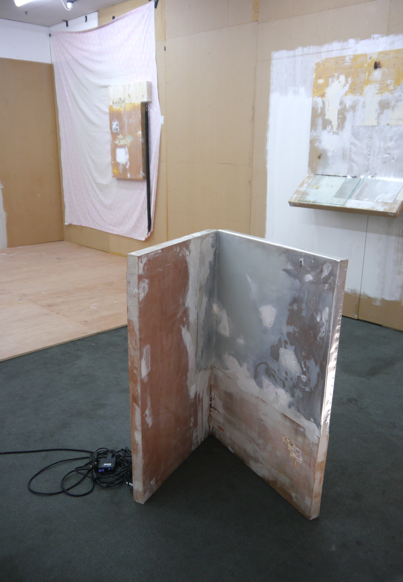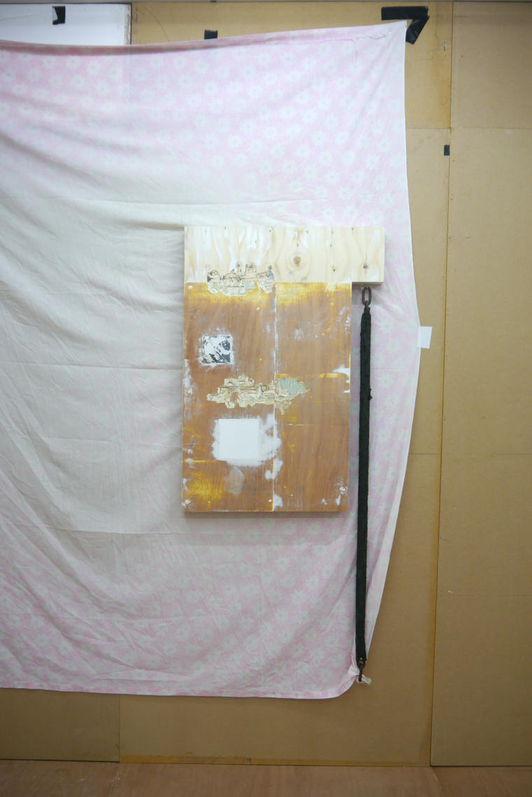 A long chain, hooked into a little eave in one of the purpose-built panels, runs down alongside; it’s attached at one end to the floral paisley sheet that functions as a backdrop, which is the single domestic (you could say feminised) object in a room full of hard edges and construction materials. The chain evokes the oppression of the familial, the weight of lives lived, and the whole center of the sheet has been worn pale and floral-less by the bodies that once slept there. Here, the whiteness – such as it is – is a cumulative result of time and washing, thousands of skin cells, the entropic compounds of sweat: the very opposite of unmarked.