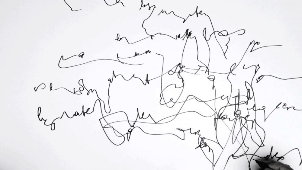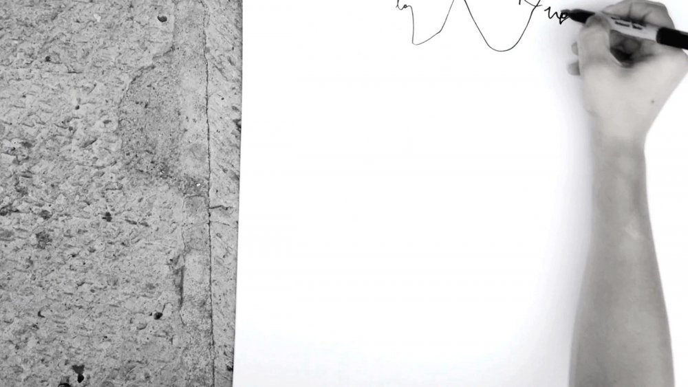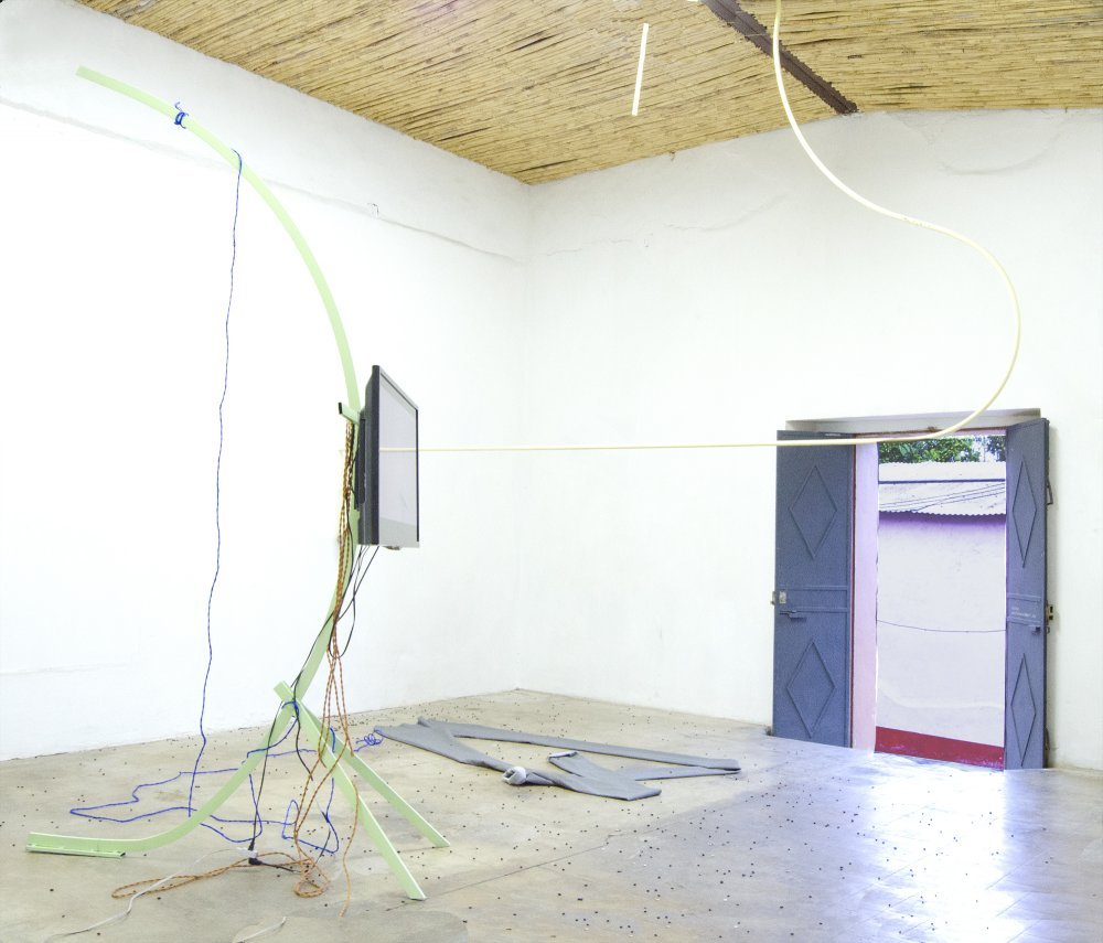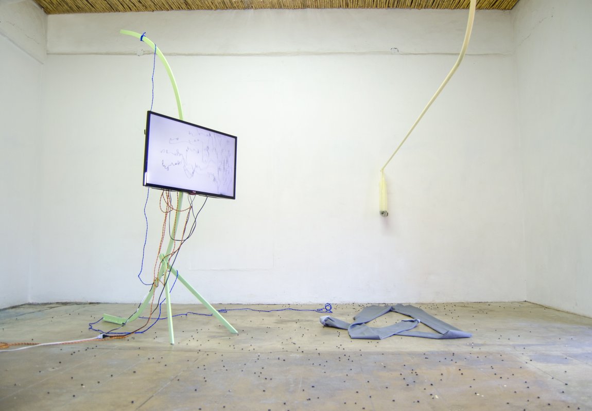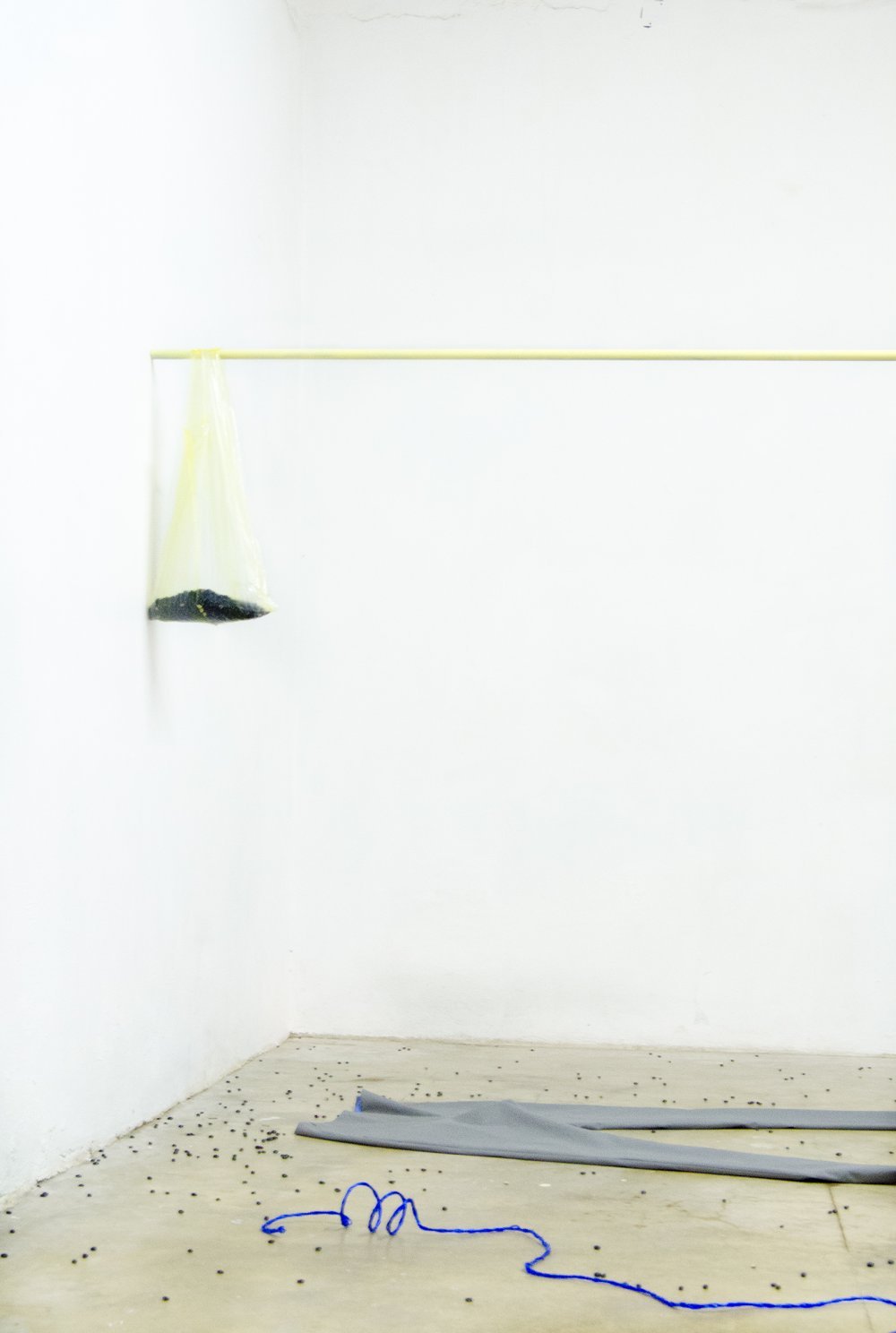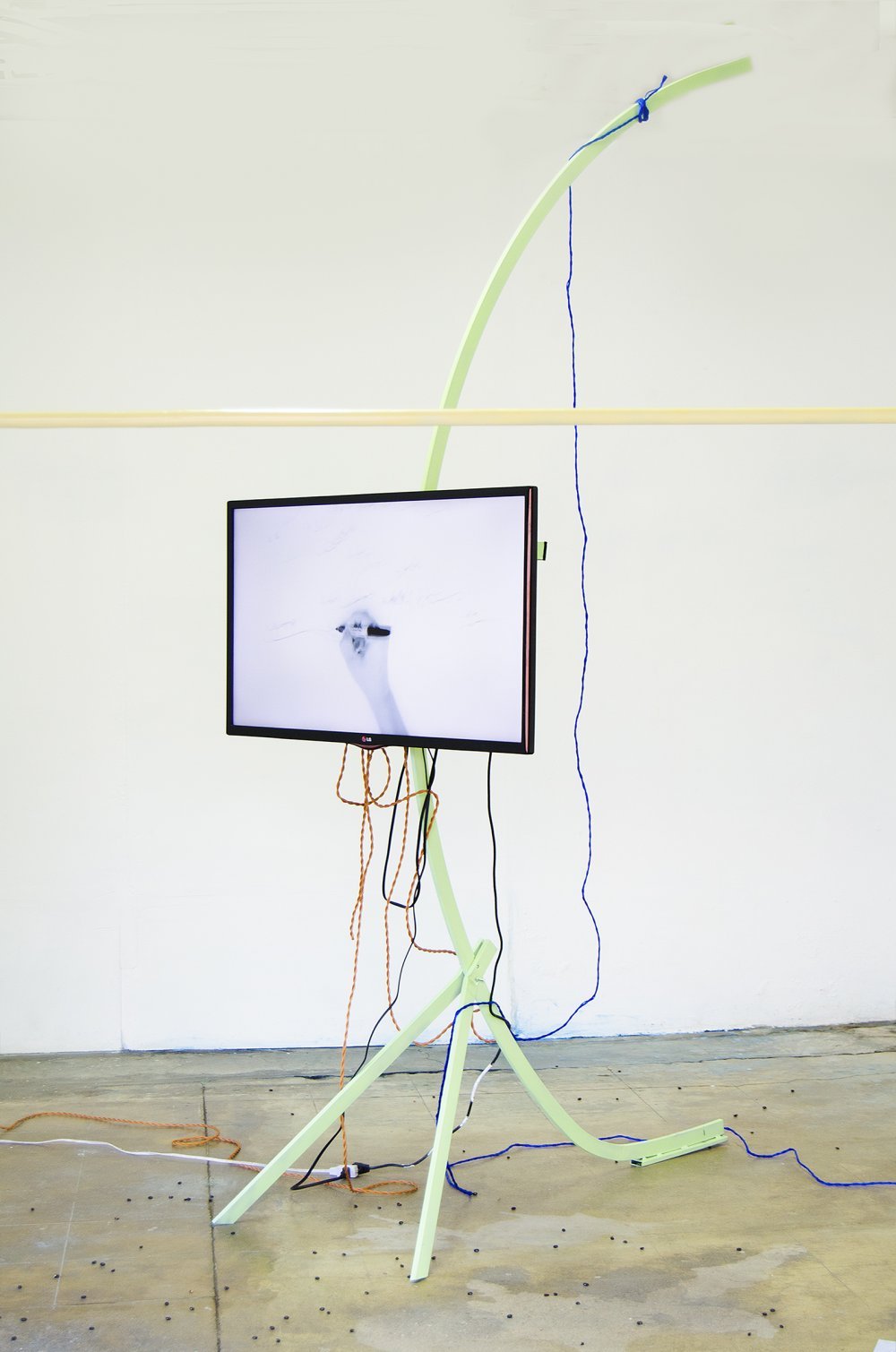 In rejecting stasis in favour of what she calls “doozy decentering and a wish for a body that could expand as gum and get lost into wild spirals of form”, extra-long and rolled-up jeans legs lie flaccid on the floor, a plastic bag weighted with spray-painted raw clay in the shape of frijoles (Mexican beans) is suspended from the curved metallic stand propping up a flatscreen slung with rope. As the hanger moves the ‘beans’ scatter through a hole around the gallery, crackling when you step on them, while the video shows a hand holding a felt tip pen as it competes with the movement of a page that mimics the motion of its ‘Pulling Parallel Turning Diagonal’ (2014) title. Its writing is rendered as illegible as the “mis-communications and material observations” that the exhibition press release notes as Olabarrieta’s preoccupation with “the complexities of written or verbal (in)articulation”.