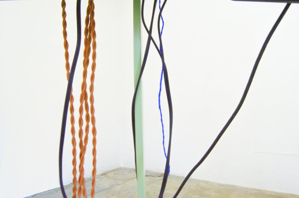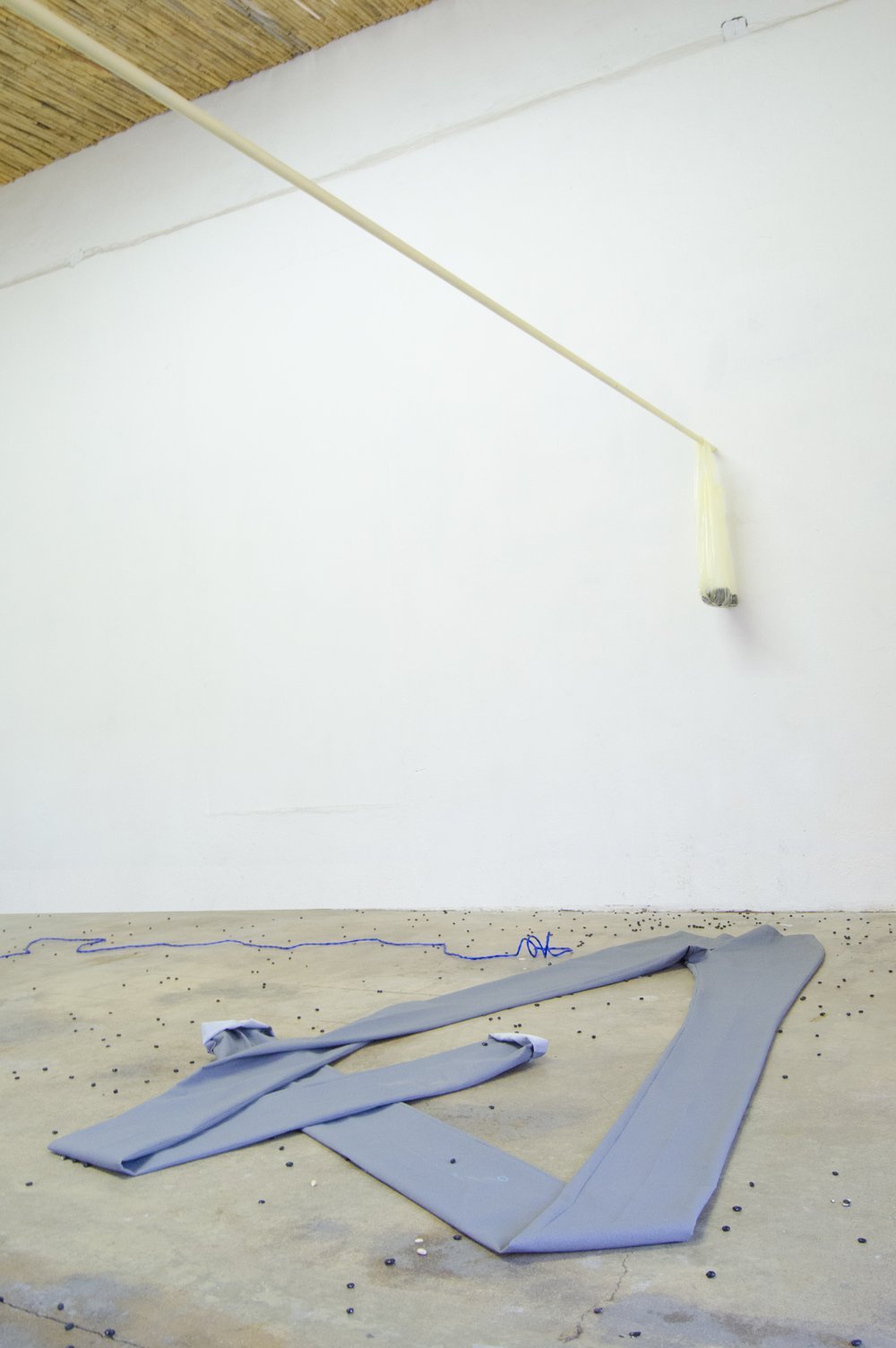 These are complexities the artist also explored during a recent residency at London’s Cell Project Space, culminating in a three-day interactive event Shifty Show (A performance with five voice overs) accompanied by Ellen Mara De Wachter‘s text ‘Shifting thoughts on stringy forms‘. In it the writer and curator questions the value of ‘doing’ in favour of a sort of ‘undoing’, which in Diagonal Z Jeans, Olabarrieta takes further by emptying these actions and objects of their function and developing a new “sculptural semi-abstract language” from all the confusion.**