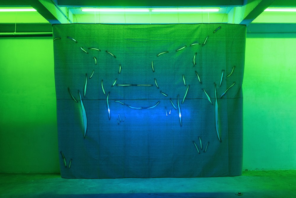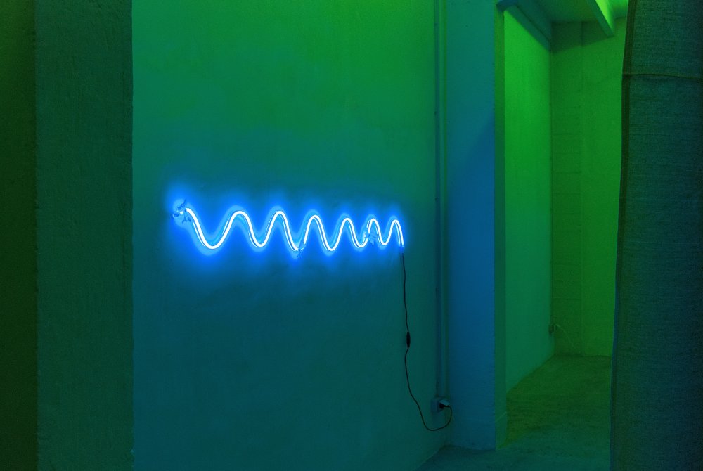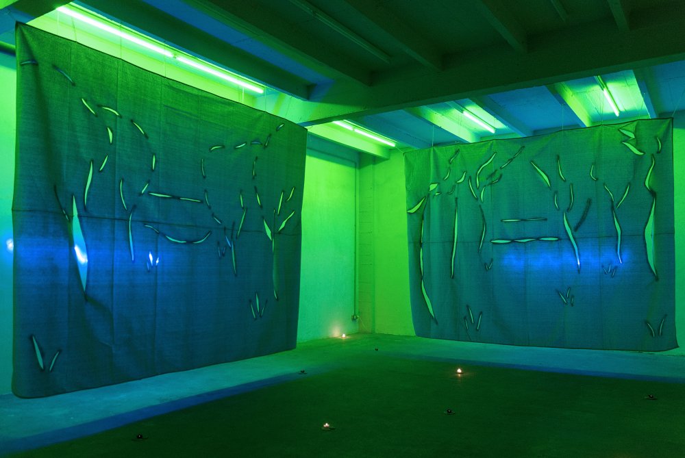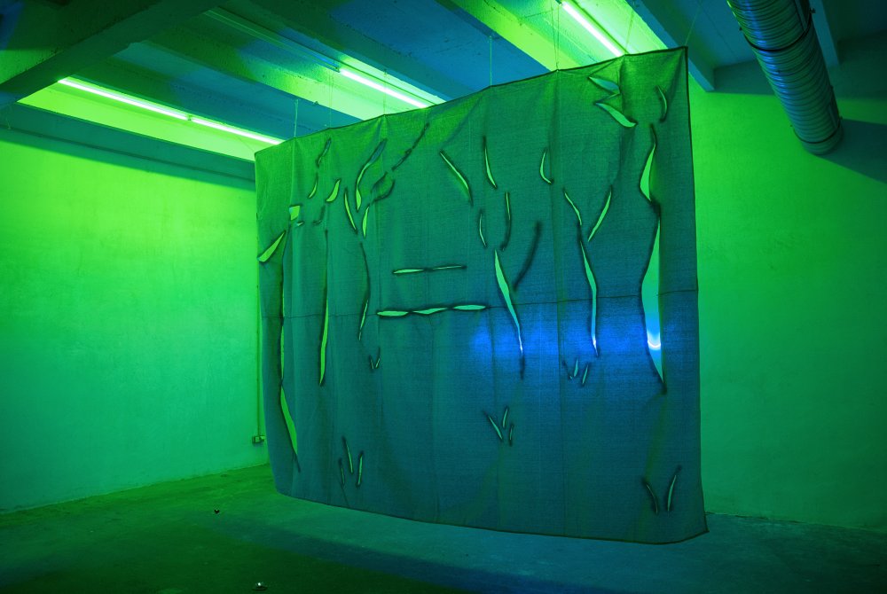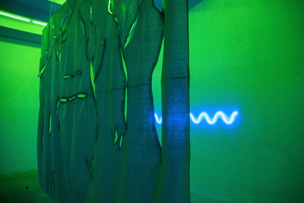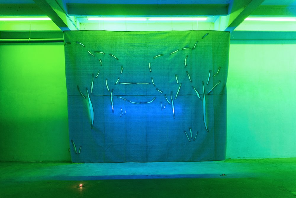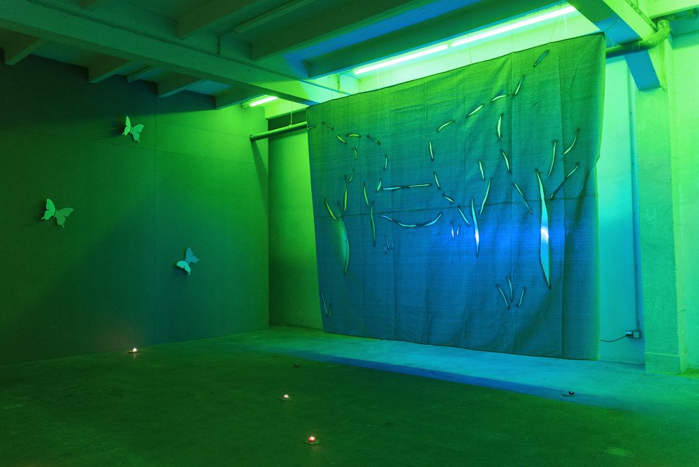The first birthday of Paris-based curatorial program Exo was celebrated by a one-night only show by US American artist Adam Cruces. Un Coucher de Soleil (a sunset) was an installation defined by the natural effect of changing light conditions. Physically, the gallery contains two large pieces of grey-ish drop sheet that had been slashed in certain places, creating a diagrammatic landscape that makes loose reference to 19th century French landscape painting. These canvas-like backdrops were hung parallel to the two main walls of Exo, but with enough space to pass behind. There, attached to each of them are neon works with blue gels, a squiggly line of light for each wall that reflected through the landscapes, blurred like a street sign in the rain. Getting close to these neons, there are small semi-transparent butterflies attached, like kitsch decorations for a bedroom. Yet more are stuck to a third wall, this time a bit larger and carved in light wood. A series of handmade ceramic lilypads holding colourful flowery candles are scattered across the floor, and the window is roughly painted in off-white with a large talismanic swirl chipped out so that the sun shines through the relief. It casts a perfect shadow on the concrete floor inside. Finally, a bunch of standard neons glow from the roof, gelled in slime green.
