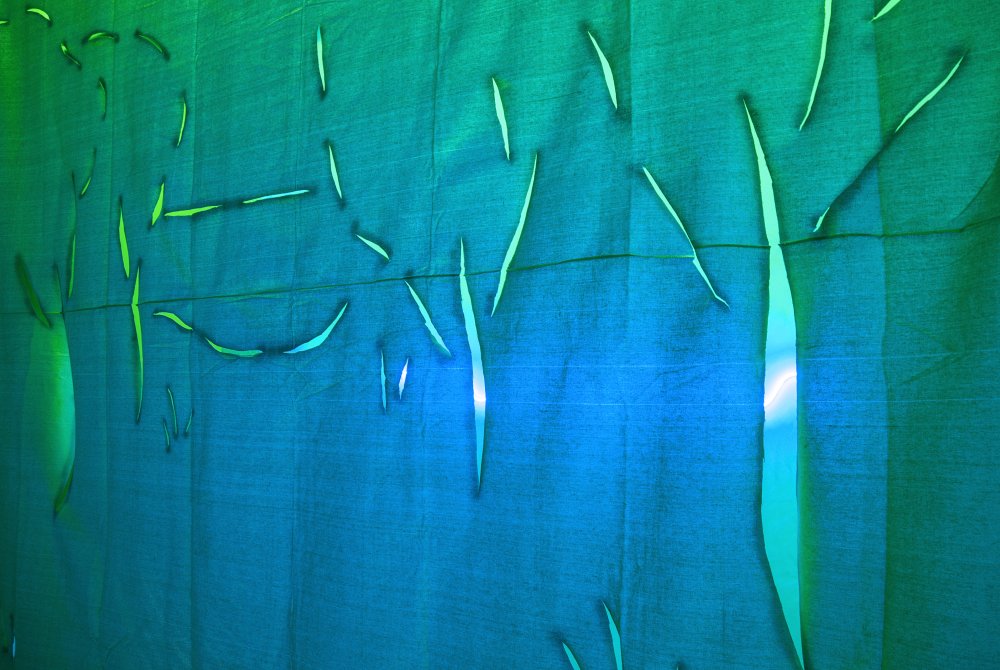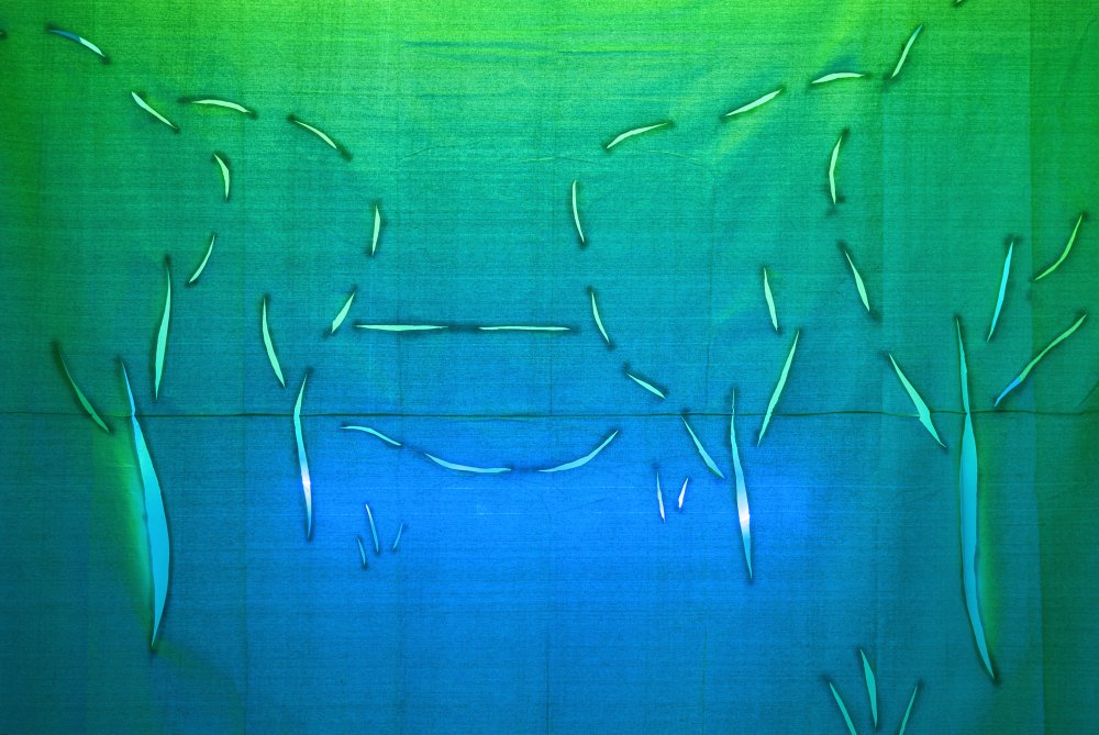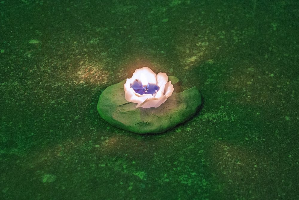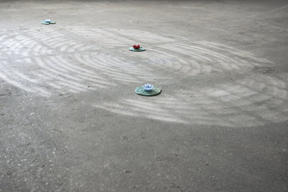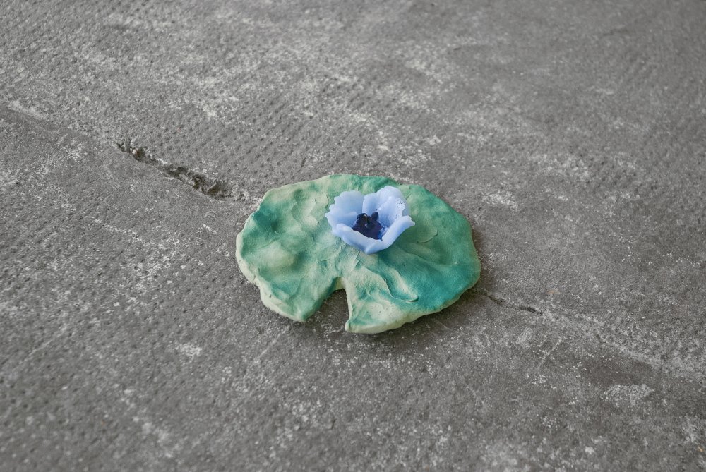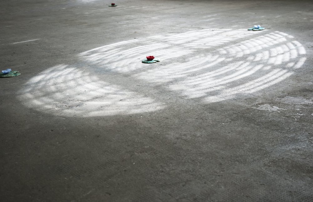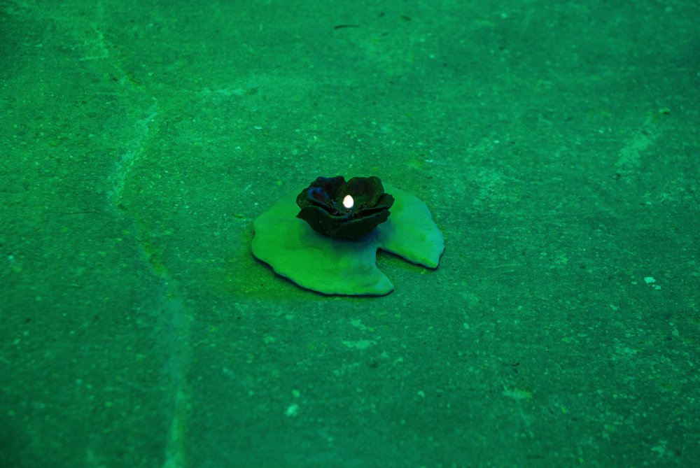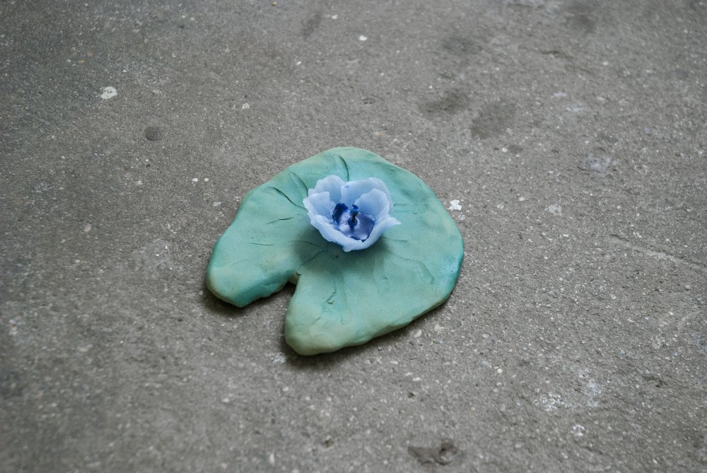The first birthday of Paris-based curatorial program Exo was celebrated by a one-night only show by US American artist Adam Cruces. Un Coucher de Soleil (a sunset) was an installation defined by the natural effect of changing light conditions. Physically, the gallery contains two large pieces of grey-ish drop sheet that had been slashed in certain places, creating a diagrammatic landscape that makes loose reference to 19th century French landscape painting. These canvas-like backdrops were hung parallel to the two main walls of Exo, but with enough space to pass behind. There, attached to each of them are neon works with blue gels, a squiggly line of light for each wall that reflected through the landscapes, blurred like a street sign in the rain. Getting close to these neons, there are small semi-transparent butterflies attached, like kitsch decorations for a bedroom. Yet more are stuck to a third wall, this time a bit larger and carved in light wood. A series of handmade ceramic lilypads holding colourful flowery candles are scattered across the floor, and the window is roughly painted in off-white with a large talismanic swirl chipped out so that the sun shines through the relief. It casts a perfect shadow on the concrete floor inside. Finally, a bunch of standard neons glow from the roof, gelled in slime green.