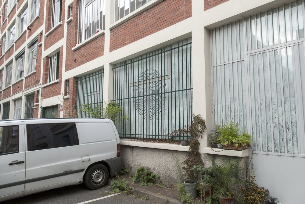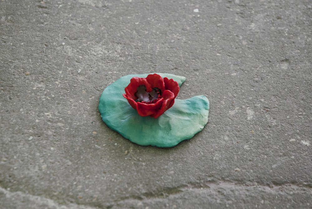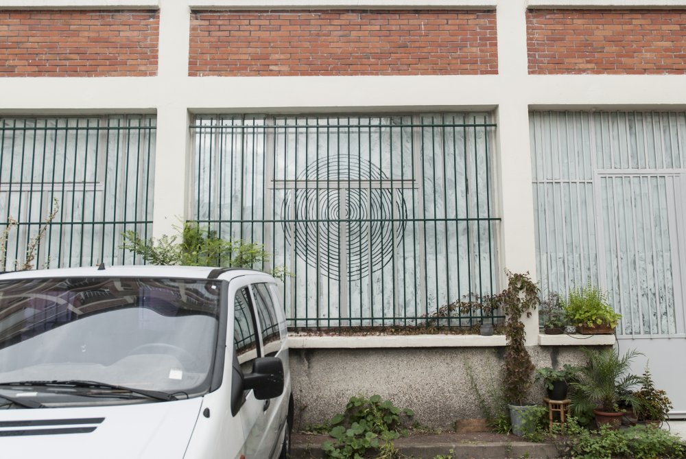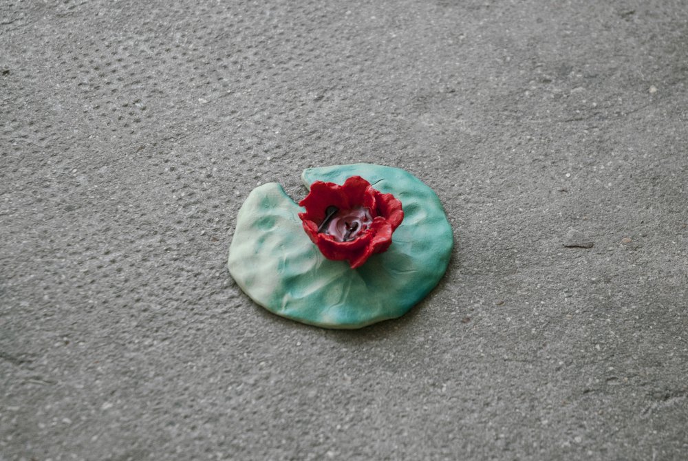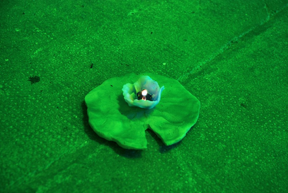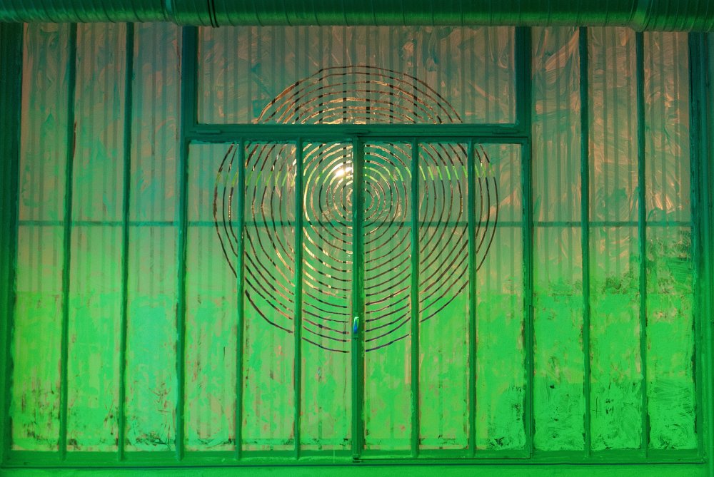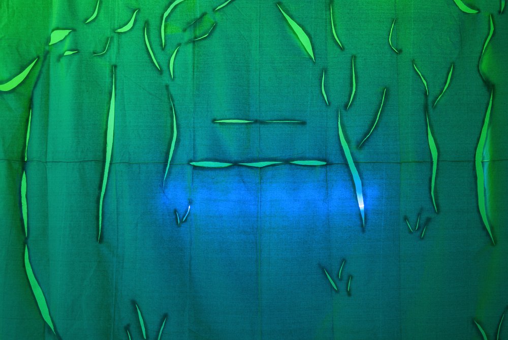 The first birthday of Paris-based curatorial program Exo was celebrated by a one-night only show by US American artist Adam Cruces. Un Coucher de Soleil (a sunset) was an installation defined by the natural effect of changing light conditions. Physically, the gallery contains two large pieces of grey-ish drop sheet that had been slashed in certain places, creating a diagrammatic landscape that makes loose reference to 19th century French landscape painting. These canvas-like backdrops were hung parallel to the two main walls of Exo, but with enough space to pass behind. There, attached to each of them are neon works with blue gels, a squiggly line of light for each wall that reflected through the landscapes, blurred like a street sign in the rain. Getting close to these neons, there are small semi-transparent butterflies attached, like kitsch decorations for a bedroom. Yet more are stuck to a third wall, this time a bit larger and carved in light wood. A series of handmade ceramic lilypads holding colourful flowery candles are scattered across the floor, and the window is roughly painted in off-white with a large talismanic swirl chipped out so that the sun shines through the relief. It casts a perfect shadow on the concrete floor inside. Finally, a bunch of standard neons glow from the roof, gelled in slime green.