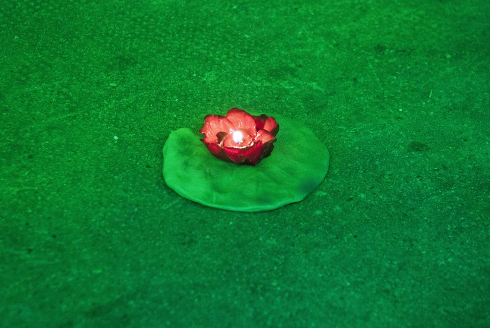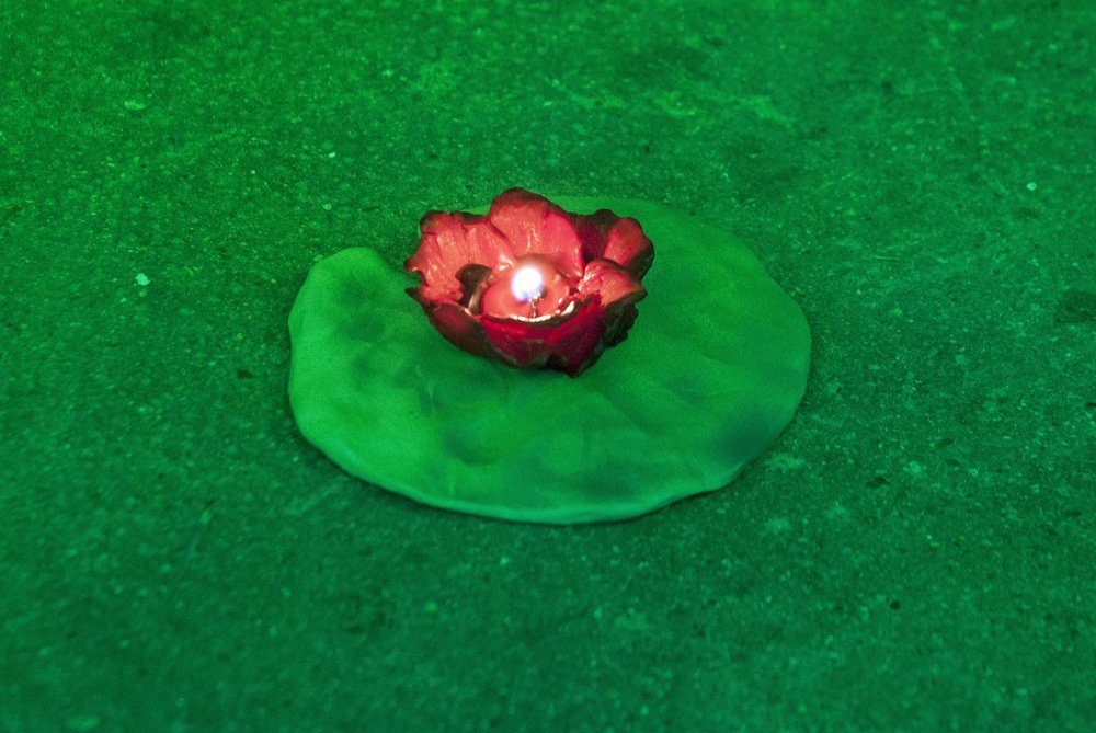 The extreme difference between how these elements work in the daytime, as the sun sets, and at night, is the key interest of Un Coucher de Soleil. The bright sun makes the components of the installation seem incredibly odd, strangely placed, almost nonsensical. At the same time, the harsh shadows that fall through the windows and the slits in the landscapes work to great effect. ‘Everything is constantly changing’, the show seems to say. By sunset, things are different again, the throbbing glow of the fluorescents is clearly felt, and at nightfall the candles are lit, floating as if on a lake that reflects the sky above. Cruces’ aim is to create a landscape, an immersive experience. In the final phase we are left with the clubby effect of clashing coloured light (and by now everyone’s a bit drunk, anyway); the effect is slightly trashy but very well mannered. A happy coincidence: from the courtyard outside, where the punters are lounging and a barbecue cooks, one notices the stairway of the Exo building is lit up with pink neons.