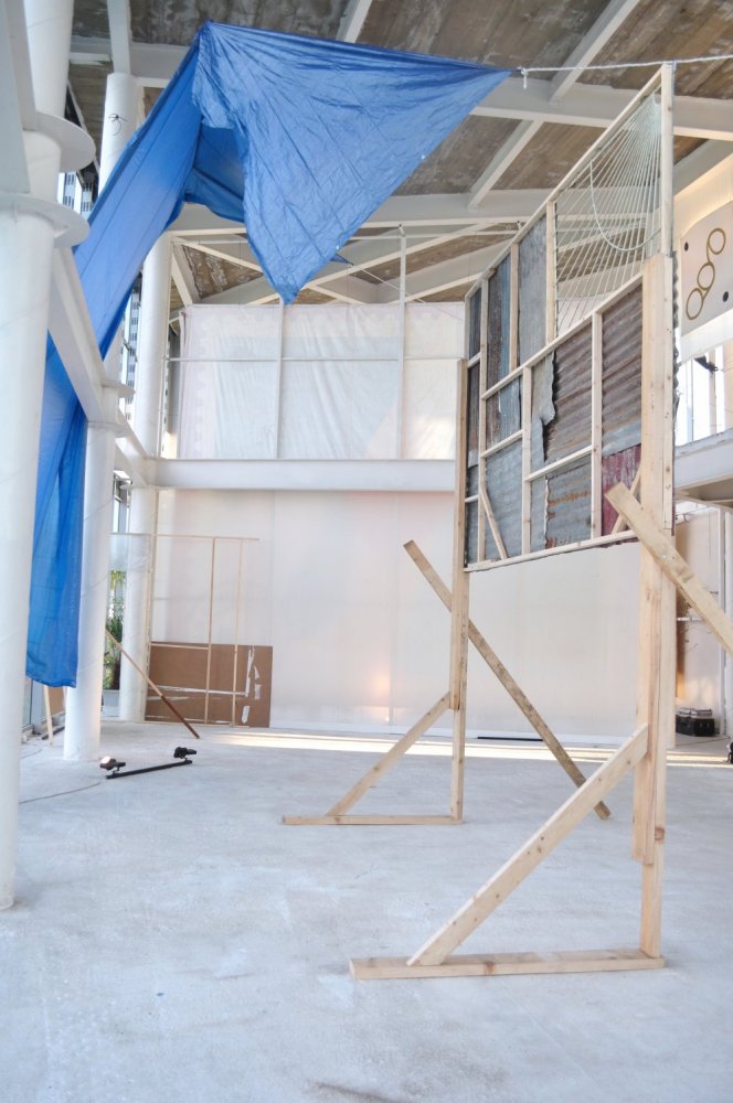In light of all this, we asked the artists to film some of the process, with the assumption that that would include the end point. It didn’t. Instead the three archival folders sent to us featured footage of fragments of Darling and Shiomitsu drinking, fighting, filming a dead bird, as well as welding, hammering and constructing for the exhibition but none of the finished show itself. It’s all process but no product. Having seen the install images though (which you can see in the photo gallery top-right) where top-heavy wooden structures on stilts (jic?) look like they could collapse at any moment and a blue tarp dubbed ‘flag’ in its image file spans CAC41N/41E’s two-storey windows, it makes sense to do it this way. Because as Darling himself described in a presentation at this year’s Extinction Marathon the tetrapods are “maybe like religious artefacts and condoms, and perhaps children, and perhaps artworks. They’re just something to stave off the inevitable.” **