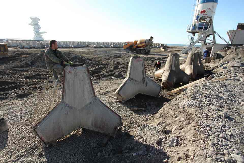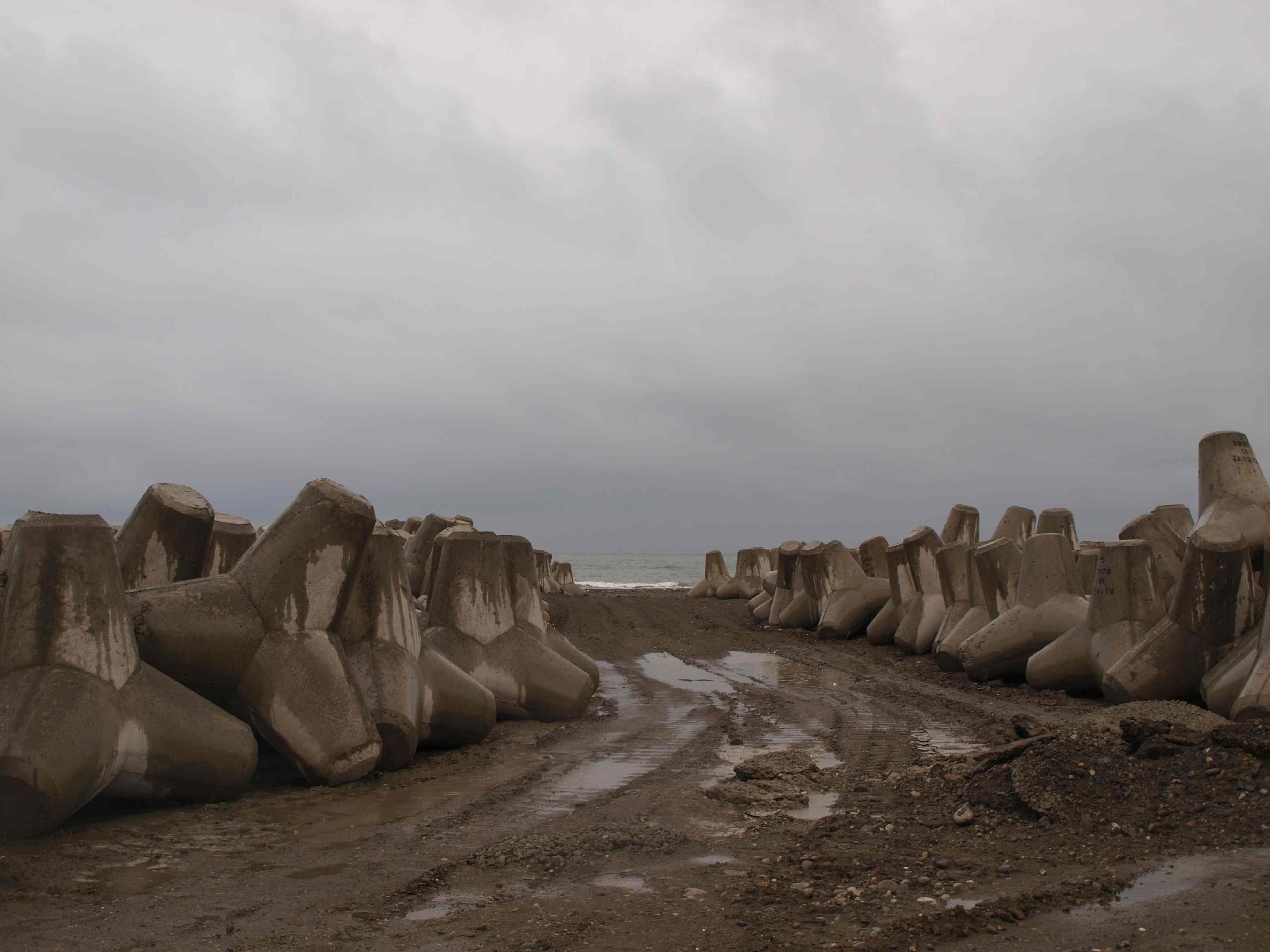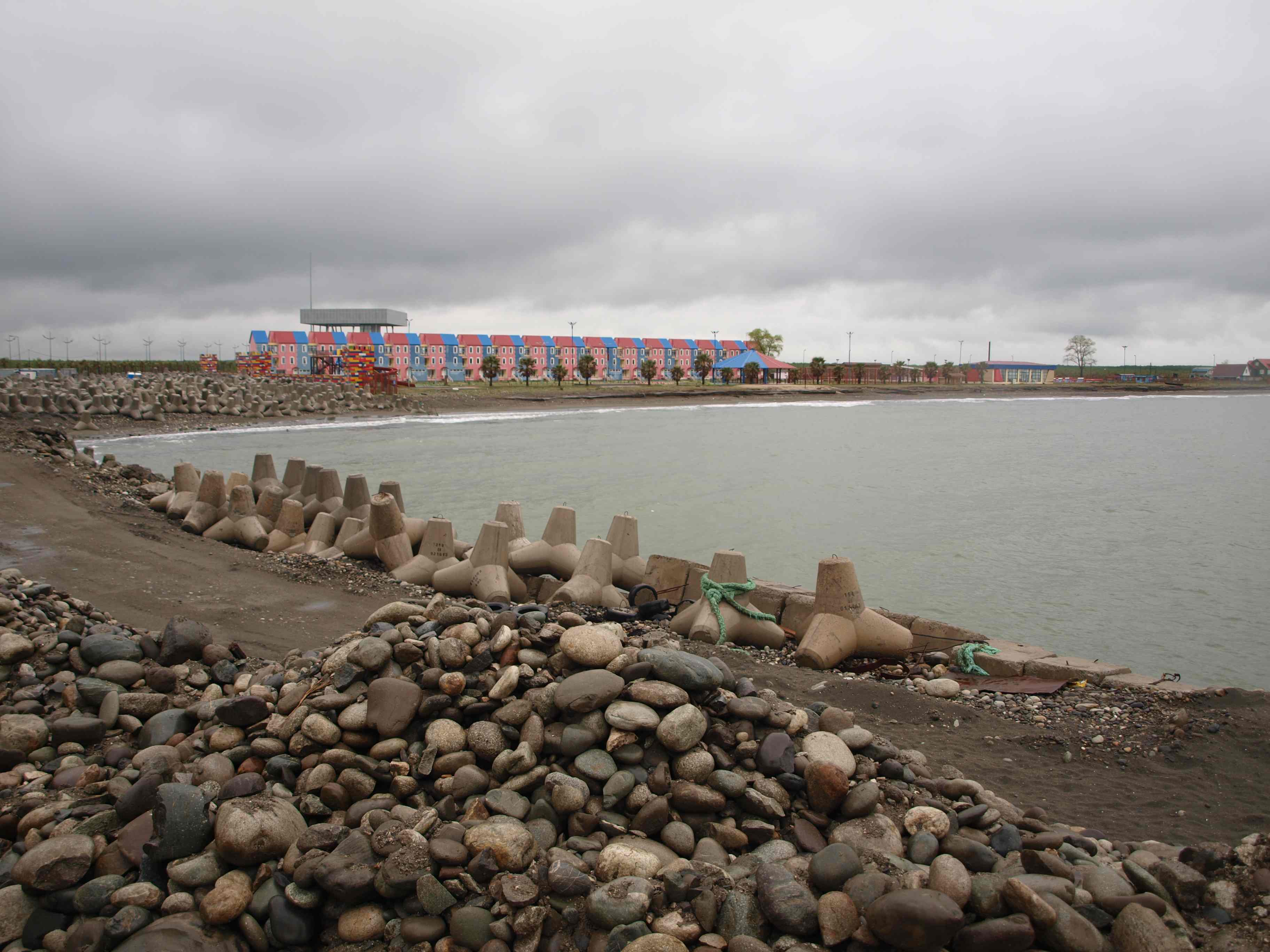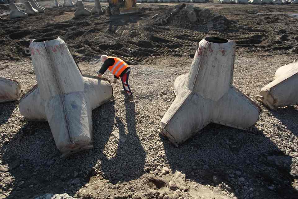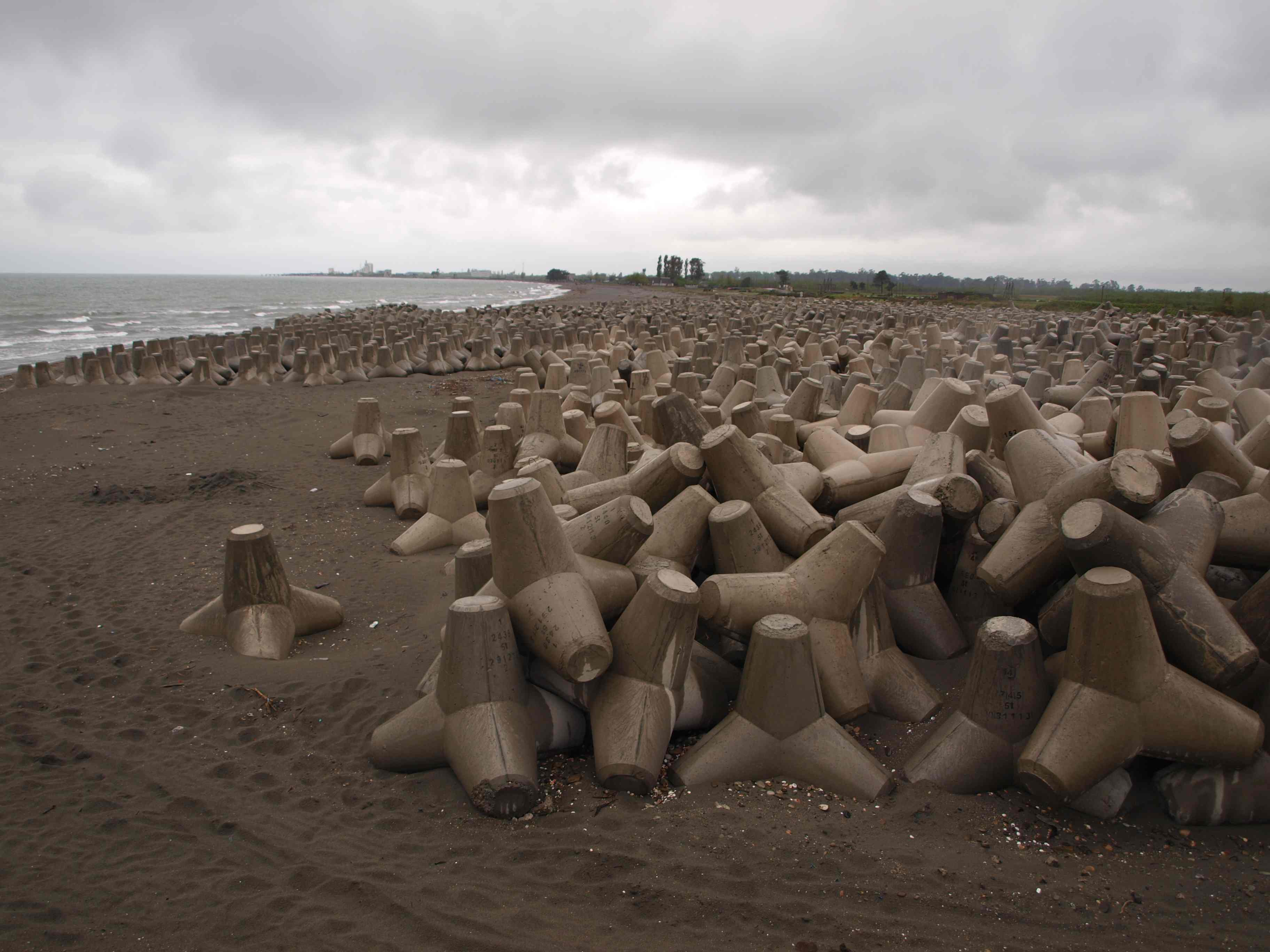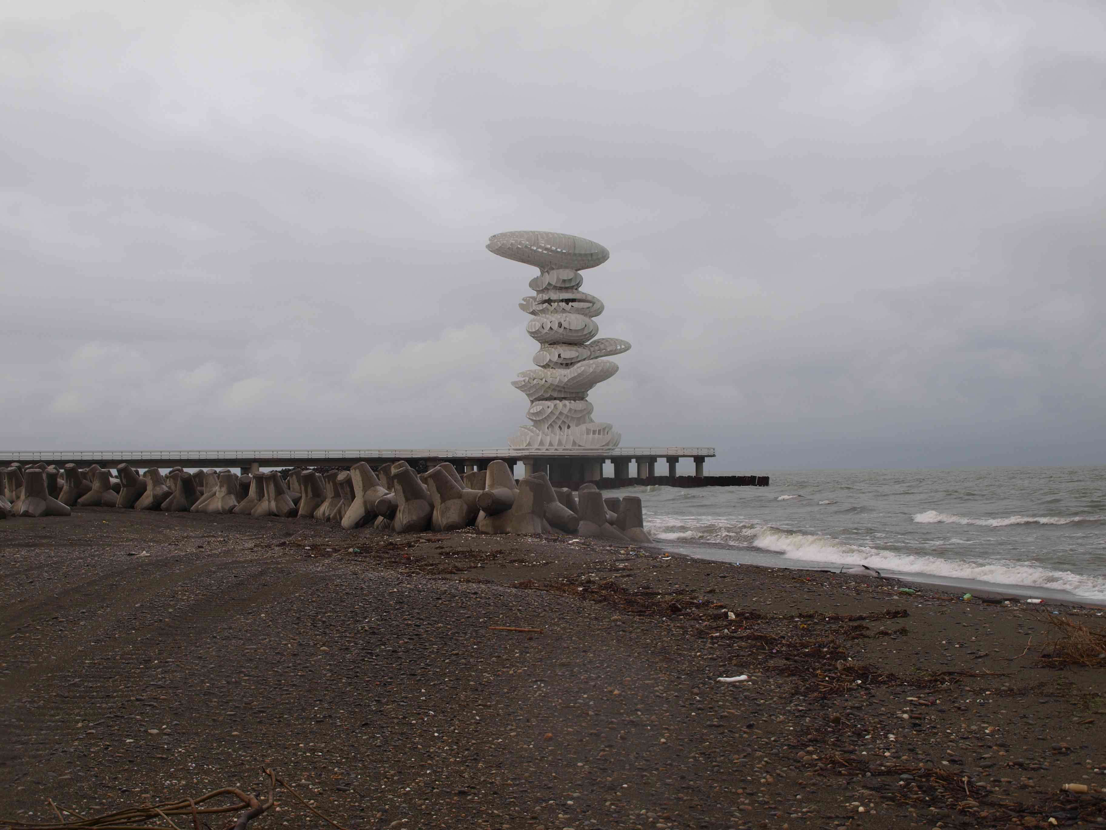 But here’s some more useful information: Darling and Shiomitsu were invited to Georgia to contemplate and make art around these two spaces where one is a gallery where they would (hopefully) produce things, and the other is a construction site where a nationalistic current government is stockpiling tetraeder-shaped shore protection barriers. Otherwise known as tetrapods, they happen to also be used as tank traps in military defence and are being built at the border of a partially recognised autonomous zone under proxy government by Russia, a country which has threatened Georgia with invasion in the past and is implicated in a secessionist conflict just across the Black Sea in Crimea. So why two foreign artists to explore such regionally specific and politically loaded work?