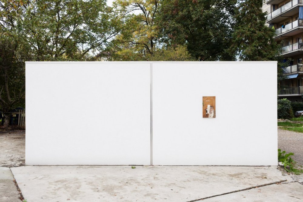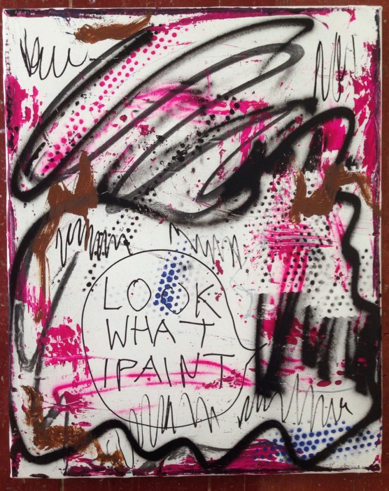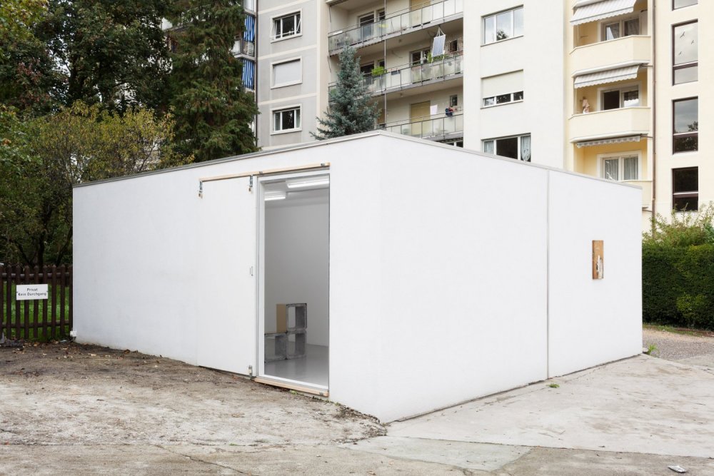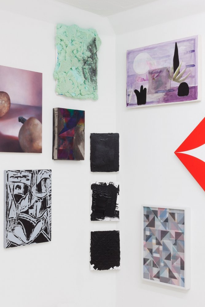 In the photos from Associations New, only a handful of them feature the credited work of individual arists, including Charlotte Herzig‘s ‘Landscape, the sun is actually red’ (2014) and Henning Strassburger‘s ‘o.T’ (2014), that yells “LOOK WHAT I PAINT” in black scrawl through the lurid pink and black noise of oil and acrylic. The rest are reduced to an ‘installation view’ of wall-hung paintings by the likes of Max Brand, Claudia Comte, Thomas Jeppe, Jan Kiefer and more, while a link to Pauline Beaudemont‘s concurrent L’Age D’or exhibition next door comes in two square concrete ‘chairs’, designed for the almost empty garage cubicles outside.