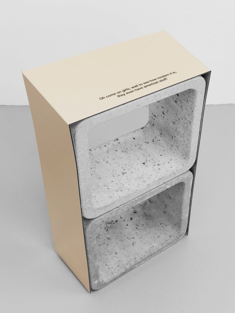 Each block seat features a quote from a film and a fiction work: one from Jacques Tati epic Play Time (1967) on a future vision of Parisian modernity and the other from objectivist Ayn Rand’s famous novel The Fountainhead. It’s taken from the part of the book where vulgar publisher and passionate private art collector Gail Wynand offers indvidualistic modernist architect a contract while announcing, “You will take your spectacular talent and make it subservient to the taste of the masses.”