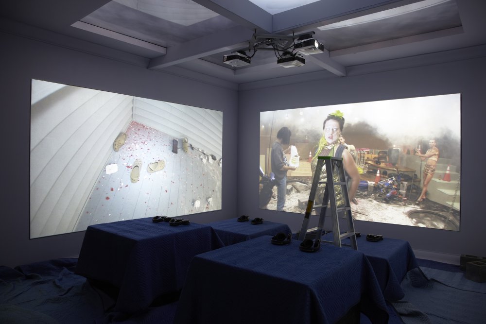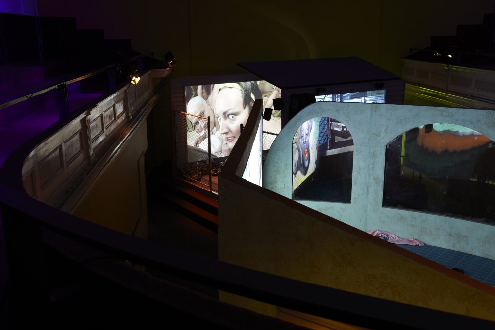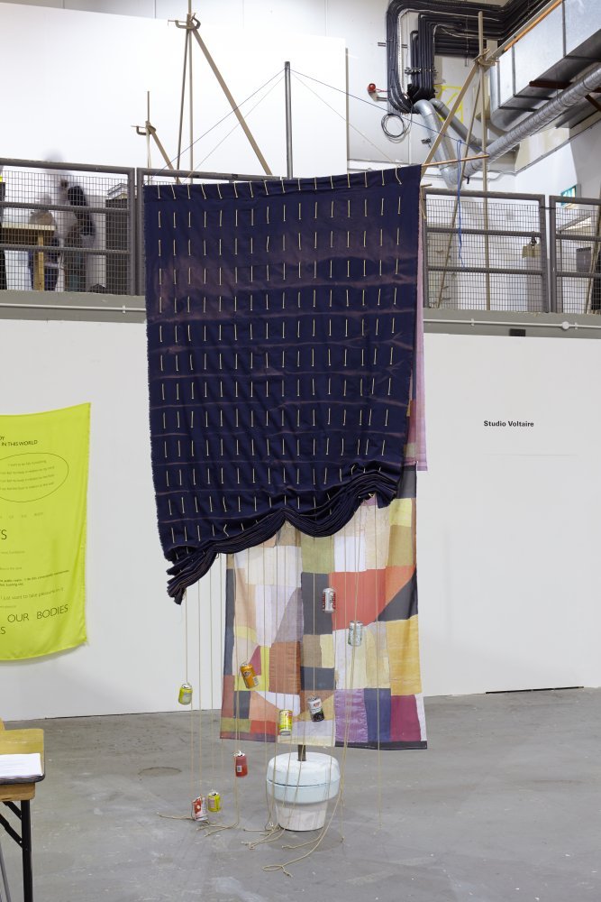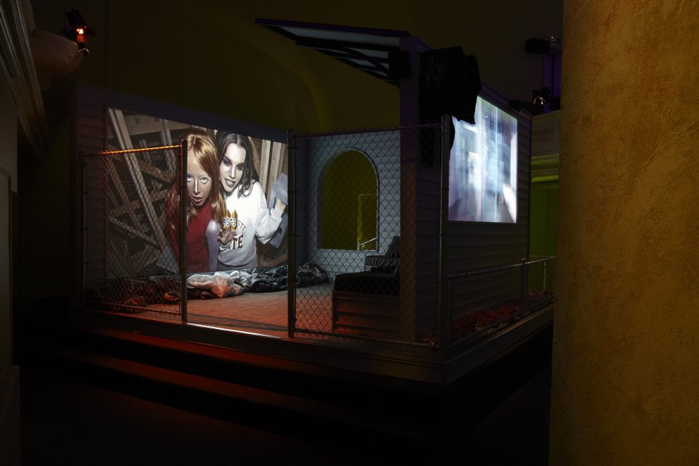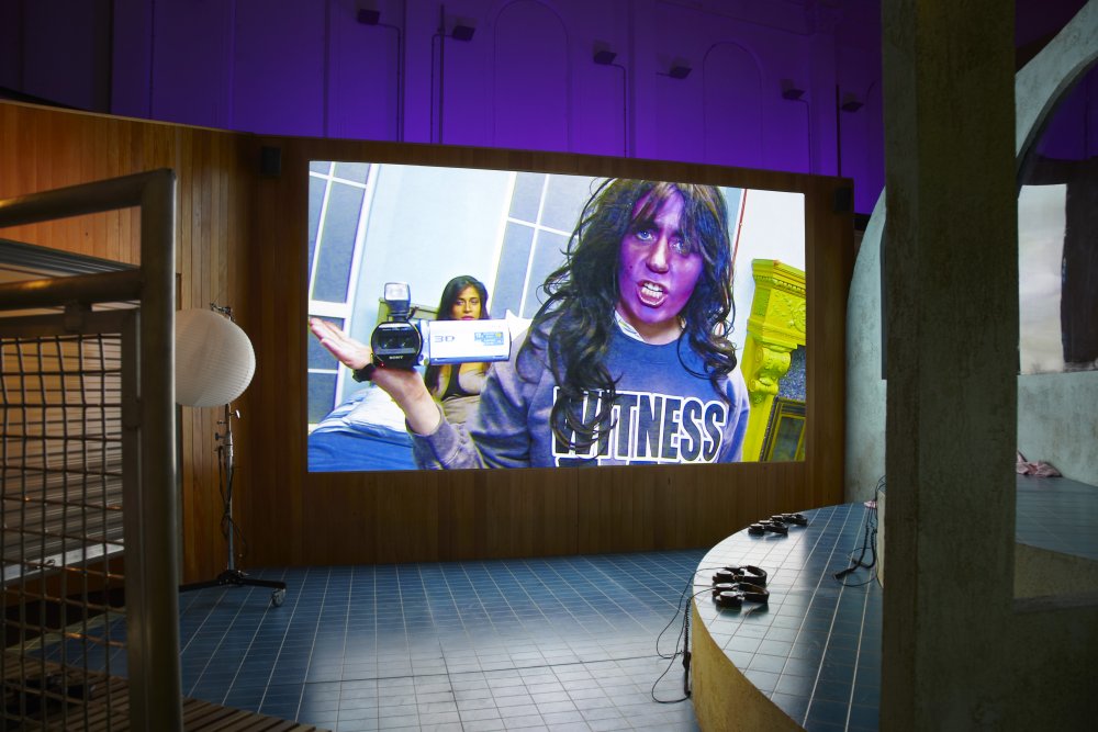 Property. Space. Time. Money. They’re concepts that are thrown into sharp relief and problematised inside and outside the official Frieze week walls as distinctions begin to blur. The video work of Lizzie Fitch and Ryan Trecartin‘s Priority Innfield installations at Zabludowicz Collection takes a starkly, almost absurdly, more menacing turn in its dark labyrinth of diamond fencing, blue tiles and park benches littered with iconic red kegger cups and screening the suburban self-destruction of Trecartin’s Ohio teens in ‘Junior War’. There’s a cover of Radiohead’s ‘Creep’ in a big green room featuring the rolling credits from old video works, while Rachel Lord‘s ‘Basic Jenny’ CGI avatar bounces on a bed. Said artist later materialises IRL at a night of performance called Burning Head Collage, curated by Total Freedom, to play Judas as part of Jesus Christ Superstar‘s ‘Blood Money/ Damned for all Time’ score, with Jesse Darling and Leslie Kulesh filling the roles of the High Priests who suggest: “think of the things you could do with that money/ choose any charity/ give to the poor”.