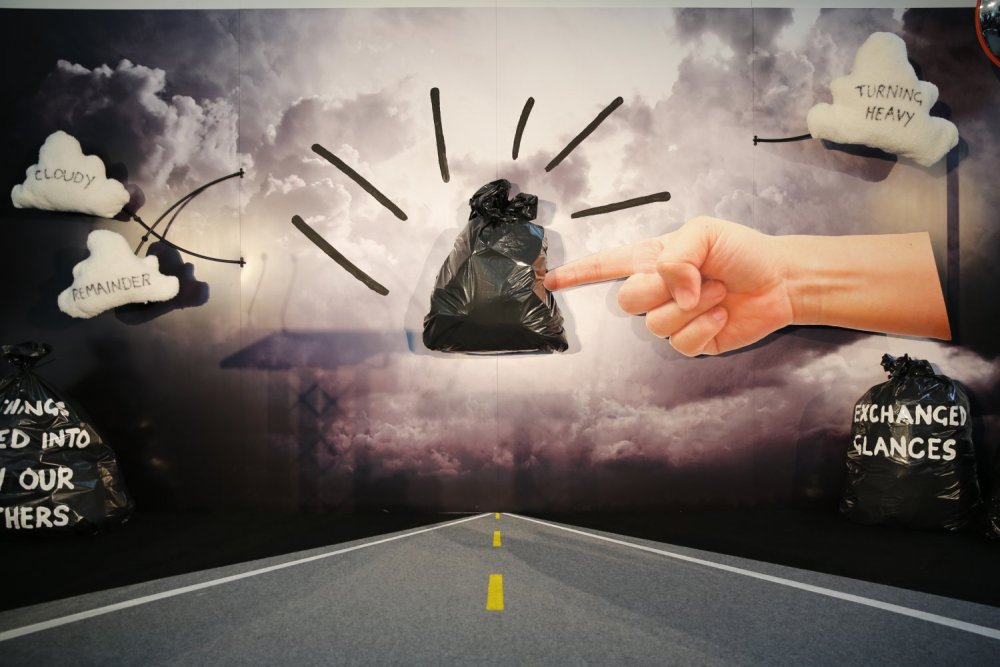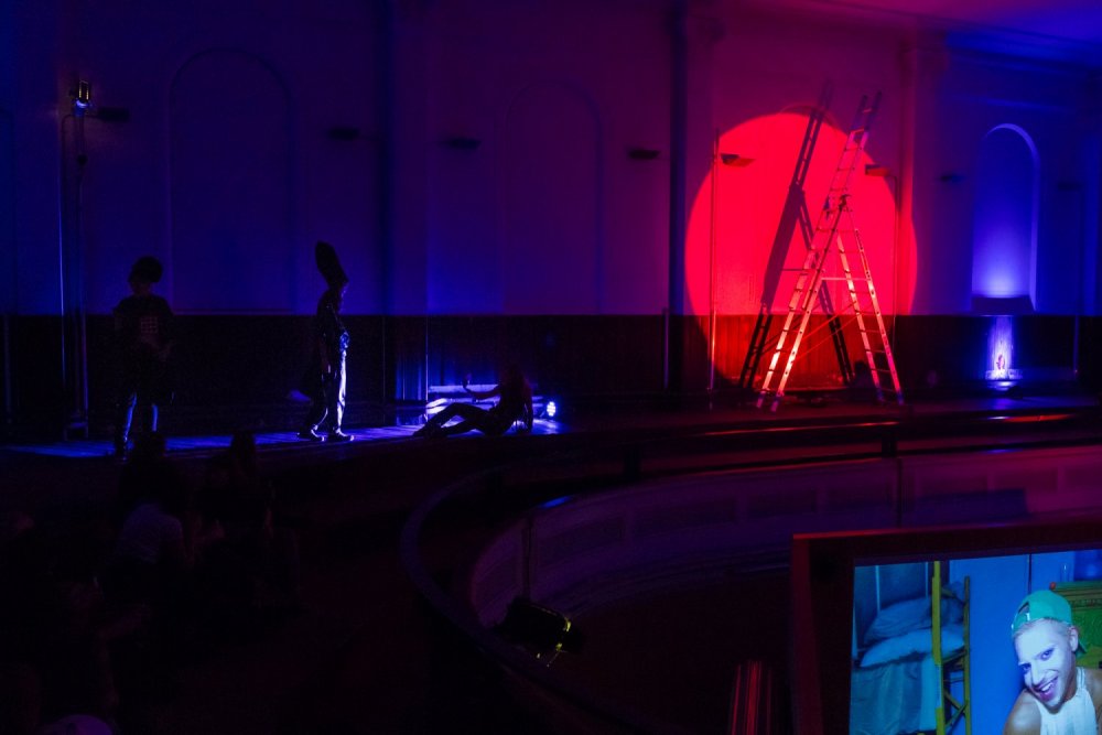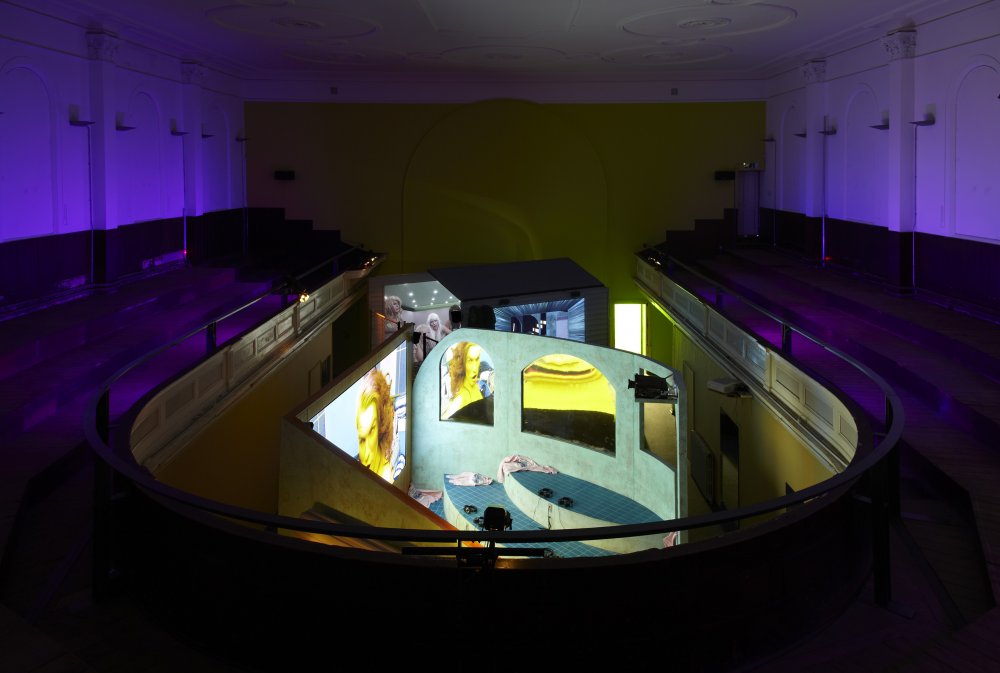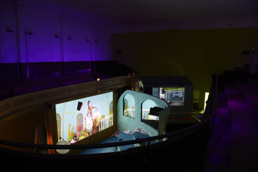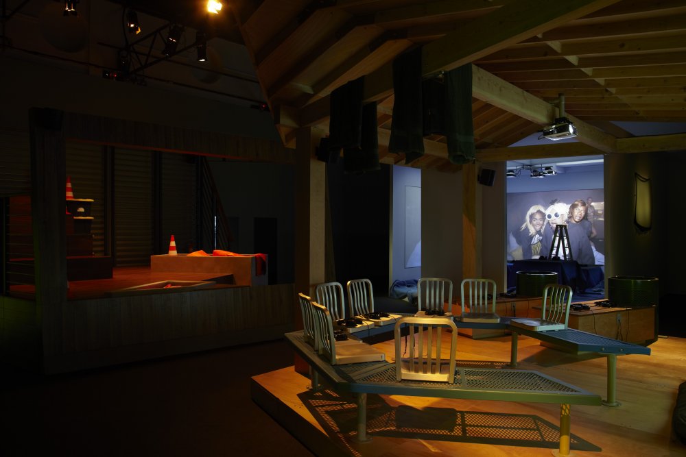 Property. Space. Time. Money. They’re concepts that are thrown into sharp relief and problematised inside and outside the official Frieze week walls as distinctions begin to blur. The video work of Lizzie Fitch and Ryan Trecartin‘s Priority Innfield installations at Zabludowicz Collection takes a starkly, almost absurdly, more menacing turn in its dark labyrinth of diamond fencing, blue tiles and park benches littered with iconic red kegger cups and screening the suburban self-destruction of Trecartin’s Ohio teens in ‘Junior War’. There’s a cover of Radiohead’s ‘Creep’ in a big green room featuring the rolling credits from old video works, while Rachel Lord‘s ‘Basic Jenny’ CGI avatar bounces on a bed. Said artist later materialises IRL at a night of performance called Burning Head Collage, curated by Total Freedom, to play Judas as part of Jesus Christ Superstar‘s ‘Blood Money/ Damned for all Time’ score, with Jesse Darling and Leslie Kulesh filling the roles of the High Priests who suggest: “think of the things you could do with that money/ choose any charity/ give to the poor”.