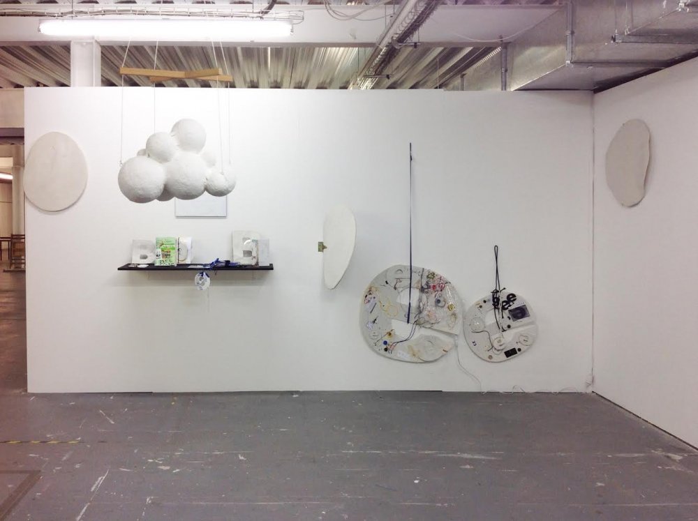 Ceaselessly referred to as the “indie” art fair by major media during Frieze, booths from High Art, Seventeen, The Apartment and Lüttgenmeijer present at the Ambika P3 event, among a Laura Aldridge installation of string, soda cans and prints at Studio Voltaire. Florian Auer‘s digital prints of fibreglass and resin t-shirts – body-free but frozen into the shape of a torso – are hung on a wall at Kraupa-Tuskany Zeidler in one corner. Sandy Brown‘s presentation of an installation from Jean-Michel Wicker and two wall hangings from Aude Pariset are in another. The latter’s inverted whitewash of lurid inkjet prints revealed within the white tiles on ‘Rehabilitated Scribble (blue swallowtail / Vyal one)’ (2012), echoes the similarly noxious, though oddly alluring sterility of Amalia Ulman‘s The Destruction of Experience solo exhibition at Evelyn Yard. There’s a collector at the gallery just off Oxford Street discussing the price for a piece of her performed and embodied Facebook timeline, under a clock circled with self-portraits inspired by Frida Kahlo. It reminds me of one of Matthew Higgs‘ framed prints hanging at the White Columns booth back at Sunday Art Fair. All it says is, “You get what you pay for”. **