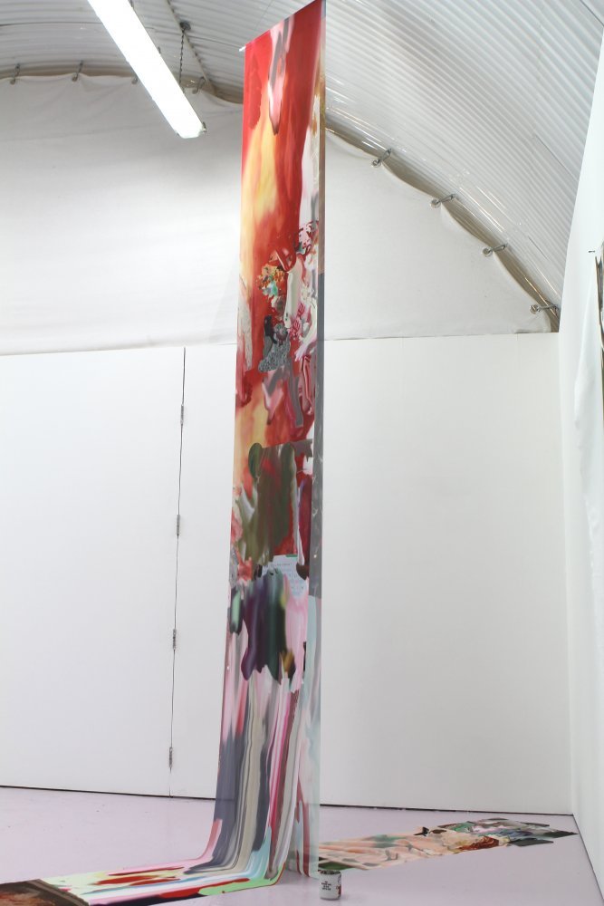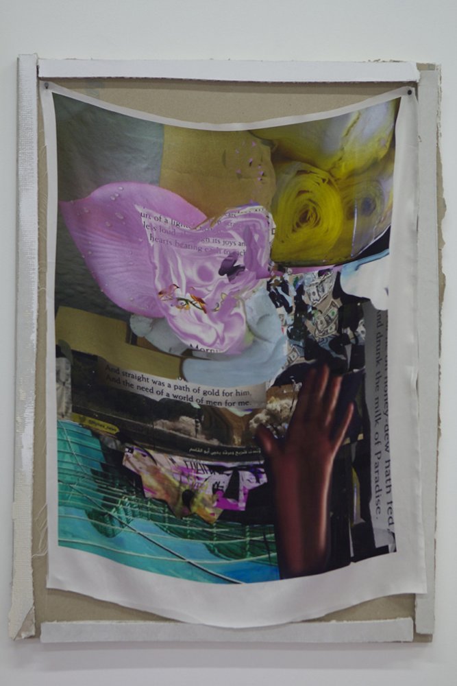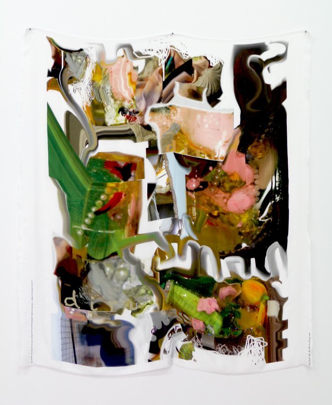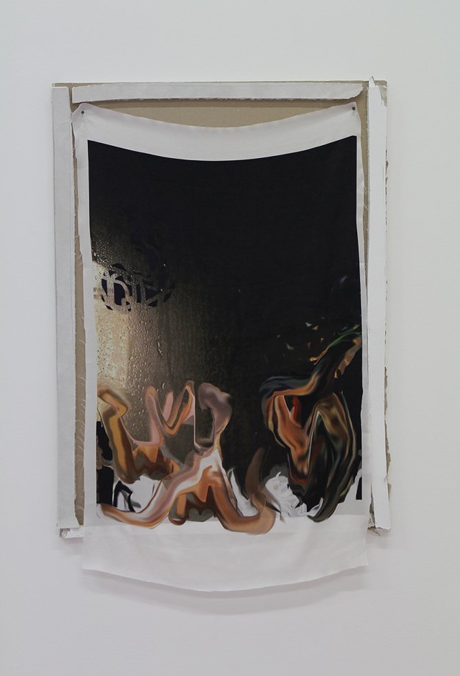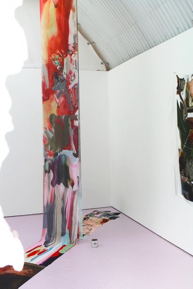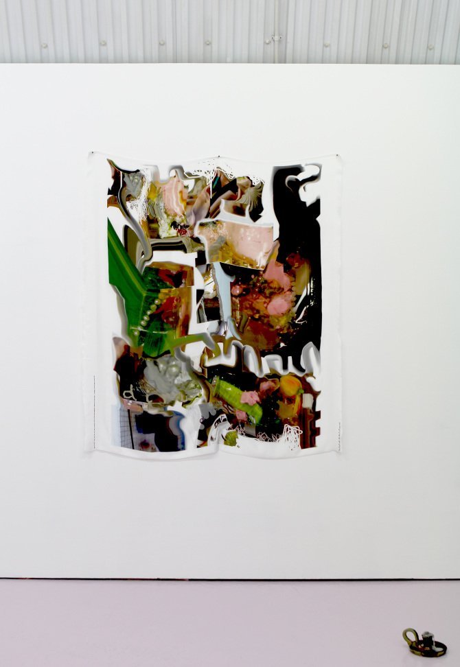 Tubbs’ dazzling stews of synthetic colour drift across loosely hung fabric limping from and falling out of wall-hung frames, a ribbon of motionless-but-abstractly-moving material tumbles down from ceiling to floor. “Feminist repurpose video #gamergate subversion shit” says the press release, as one considers the video raining Emojii and immaterial images of torn out fragments of words in ‘untitled (the sea)’. It’s at eye level and blocking the hole in the gallery wall, while announcing, “It’s hard for girls”. On the floor in the corner, ‘Vulgar Latin‘ (2014) projects screenshots of a YouTube window with a view into industrial sludge that’s suspended in time, floating across space. The soundtrack travels from pensive piano to crackling and crunching synth lines that slice across 2D gradient rectangles giving the illusion of 3D cylinders. Sometimes they bounce back from, other times bouncing out of, its frame. Bit coins. Coinye. Spilt milk. A wavy strip of snakeskin.