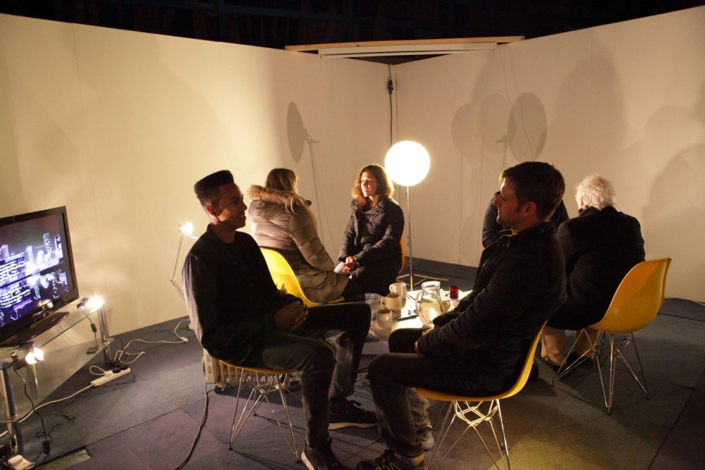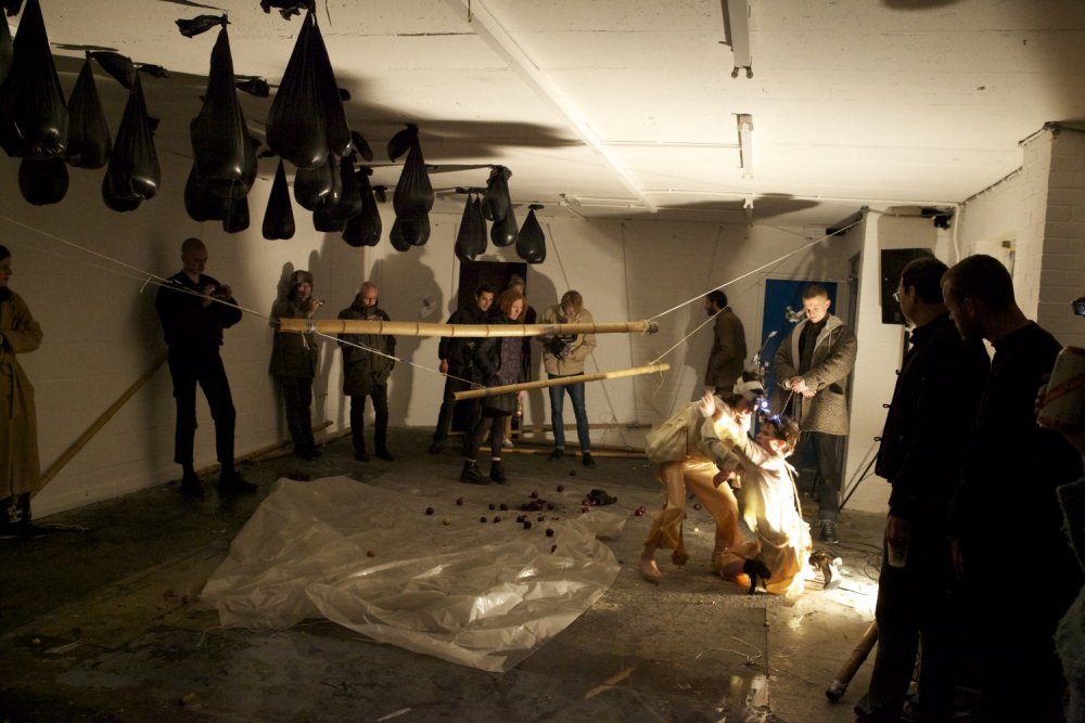 A DIY fountain made from black bags leaking water and being buffeted by bamboo only to burst on to its audience. A film of an Afghan refugee journey to Greece being intercepted by metal sheets reflecting the film back out into reality. A six-person focus group on ‘independence’ exploring the individual voice and its mass mediation. These are some of the ways the night-long event interrogated the idea of “the way in which our relationship to assets, from property to services and natural resources, is changing in a climate of scarcity”. It’s the first in a series of live events, curated by Helen Kaplinsky and Maurice Carlin of the  #temporarycustodians R&D project, looking to create a “share economy” space among its ‘islands’ of storage.