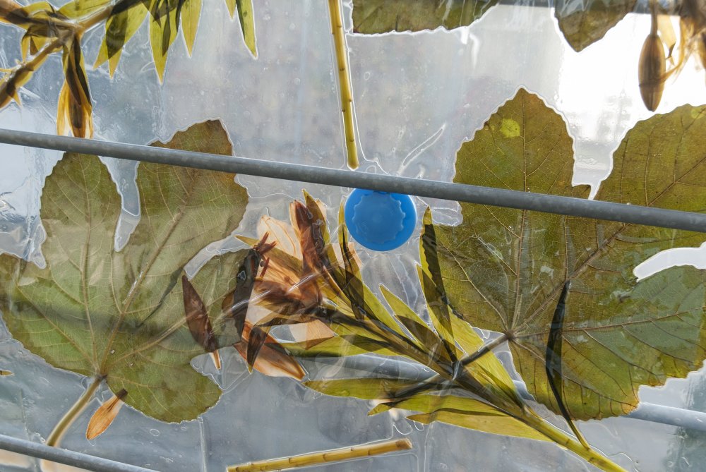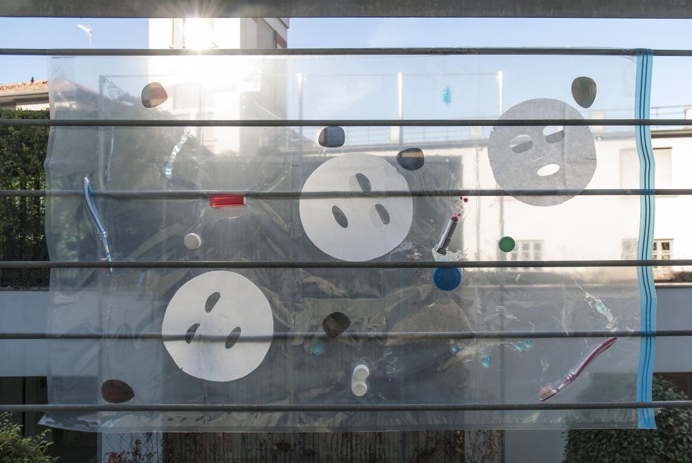 Consider the 208 words, 1863 characters of the press release text, in opposition to the exhibition images (viewable in the gallery top right). One gives a far clearer indication and greater insight into the intentions of its artists than other in the idea of an exhibition as the sum of its parts. In this case that sum is in the interaction of works and ideas by Donzeaud and Cruces, who inspire and respond to each other in a dynamic conversation. The Paris-based artist’s series of works with polythene (a chemical and organic compound used for everyday plastic packaging and containers) is set alongside the US-born Cruces’ meshen image-objects and vacuum-sealed still lifes. Playing with the idea of transparency as a material quality (say, in see-through containers and screens), as well figuratively (as in the expression, ‘we’re in the clear’, or ‘everything is ok’), the In the Clear, Caring, Curing title points to the all-too-human obsession with preservation and protection across all its composite works.