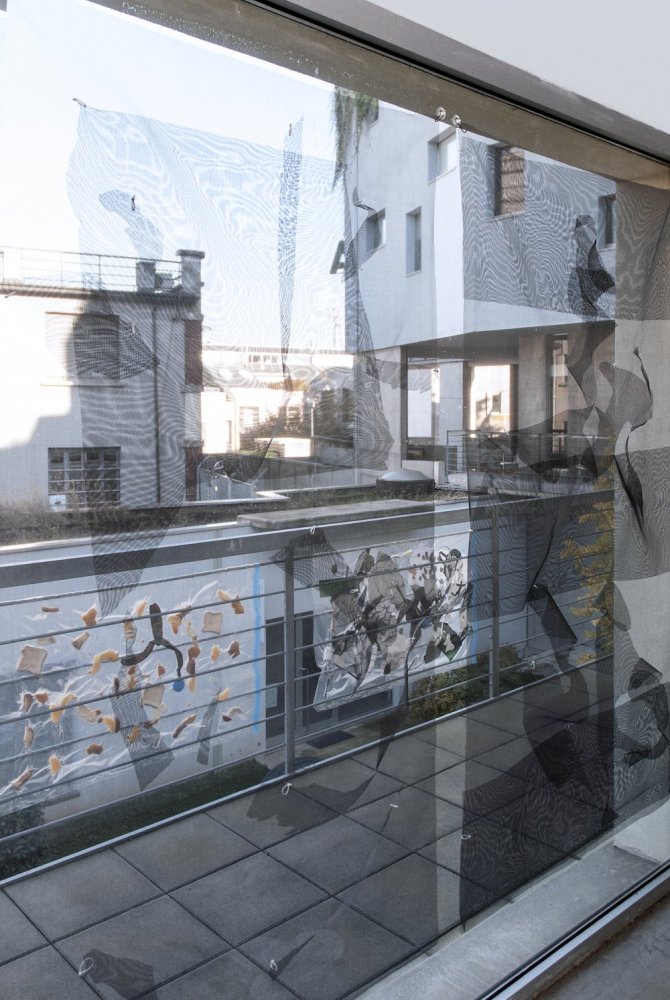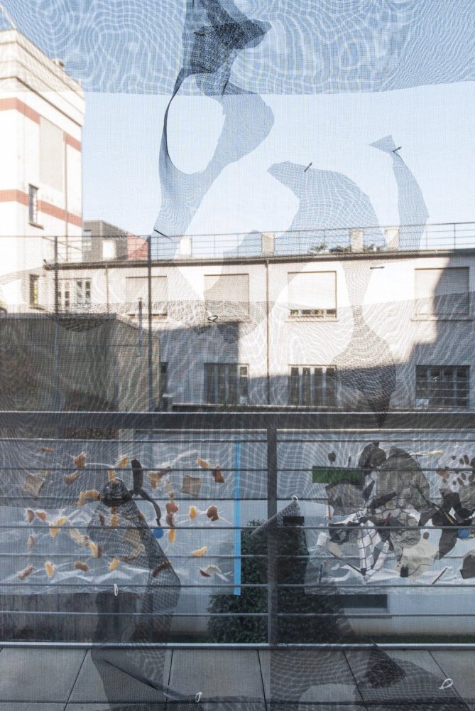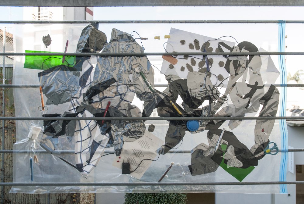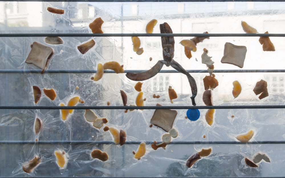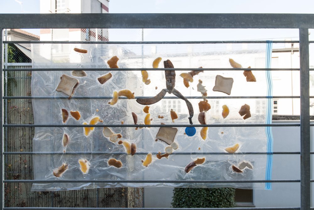 The outcome is the slightly nauseating, unnatural images of Cruces’ cryo-vac bags woven through the cables of the NAM project space’s outdoor terrace railings. Bits of bread, orange pieces and a banana peel hang in suspended animation as ‘Still Life’ (2014), next the leaves and flowers of ‘Landscape’ (2014) and the lifeless objects of an artist’s practice in ‘Studio’ (2014). These can be seen from inside the gallery through the mesh, zip ties and suction cups of ‘Camouflage Alphabet (Alpha and Beta)’ (2014) on a wall-length window, no doubt generating a moiré effect as one walks past it. It’s a similar fascination with light and its effects on his materials that Cruces explored in his Un Coucher de Soleil solo exhibition earlier this year, and no doubt feeds into these installations where an audiences’ reception of a work becomes almost entirely dependent on a moment in time.