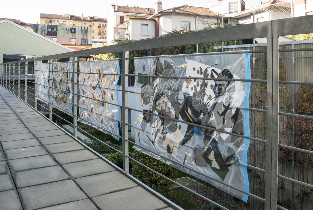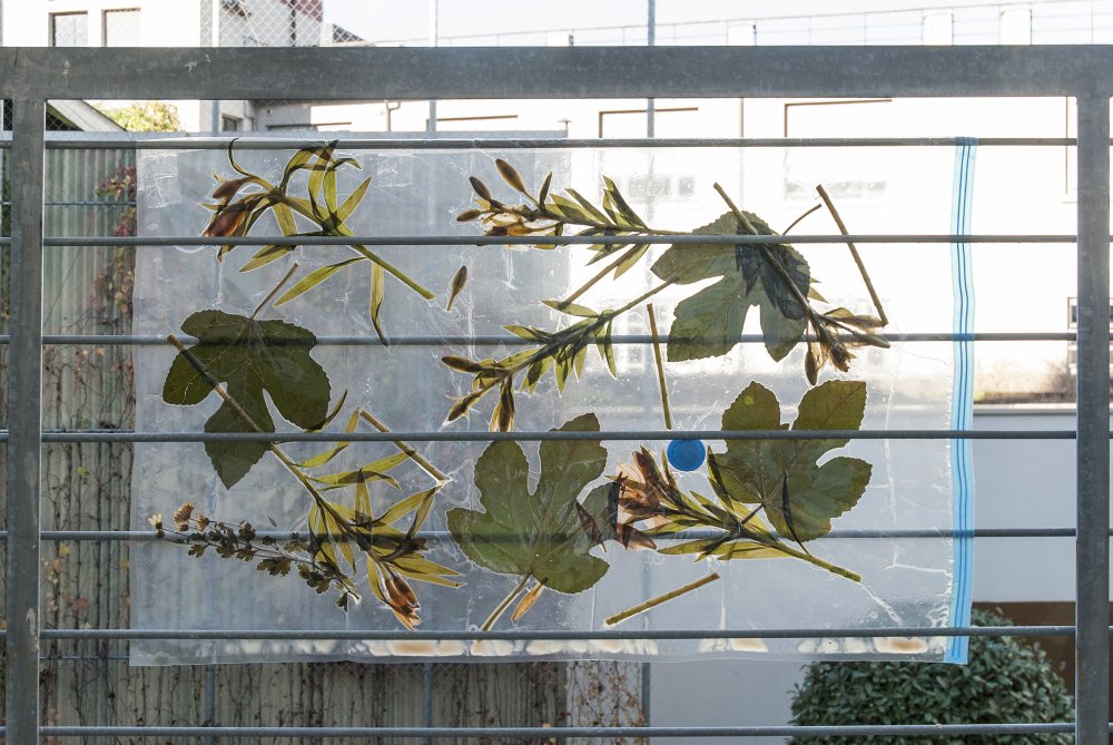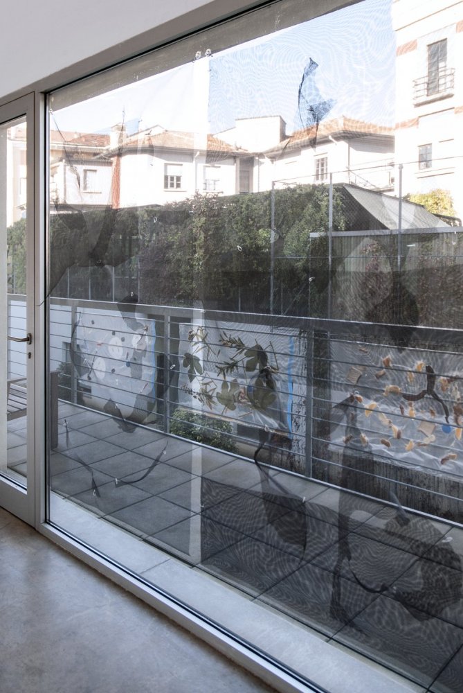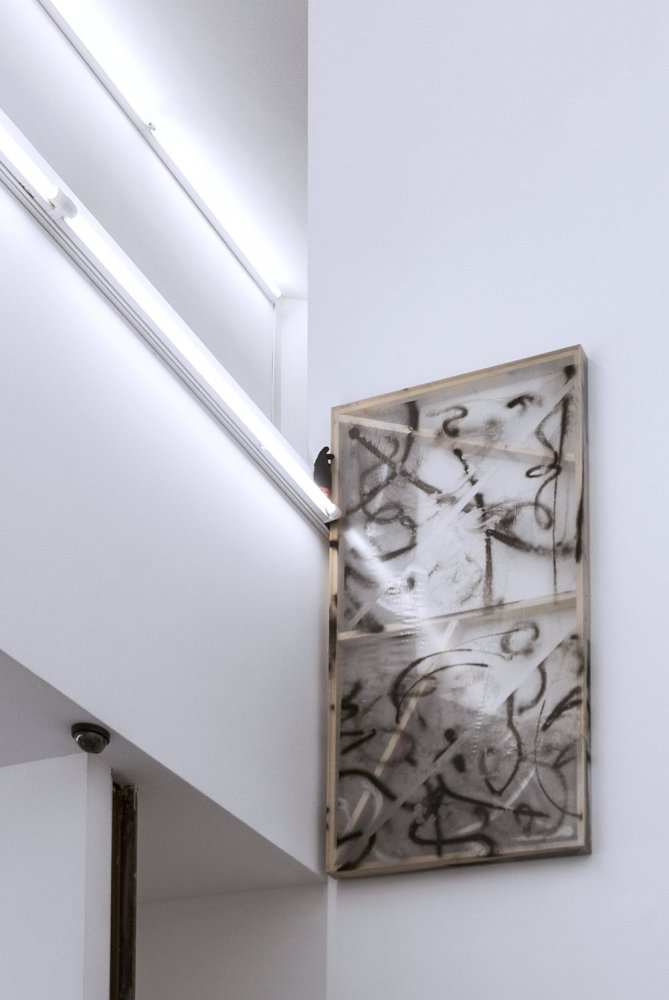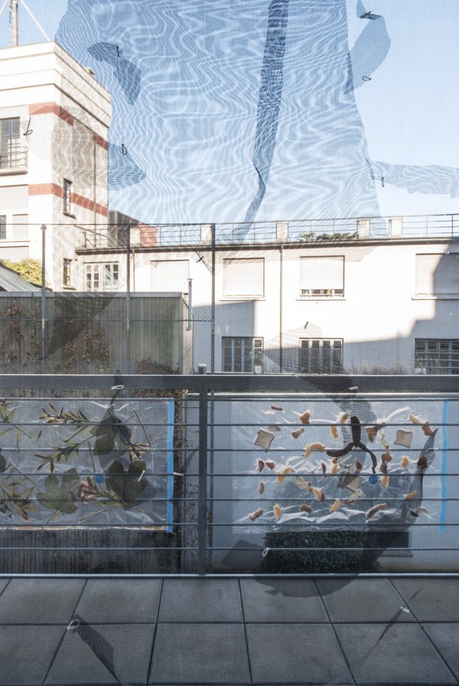 The outcome is the slightly nauseating, unnatural images of Cruces’ cryo-vac bags woven through the cables of the NAM project space’s outdoor terrace railings. Bits of bread, orange pieces and a banana peel hang in suspended animation as ‘Still Life’ (2014), next the leaves and flowers of ‘Landscape’ (2014) and the lifeless objects of an artist’s practice in ‘Studio’ (2014). These can be seen from inside the gallery through the mesh, zip ties and suction cups of ‘Camouflage Alphabet (Alpha and Beta)’ (2014) on a wall-length window, no doubt generating a moiré effect as one walks past it. It’s a similar fascination with light and its effects on his materials that Cruces explored in his Un Coucher de Soleil solo exhibition earlier this year, and no doubt feeds into these installations where an audiences’ reception of a work becomes almost entirely dependent on a moment in time.