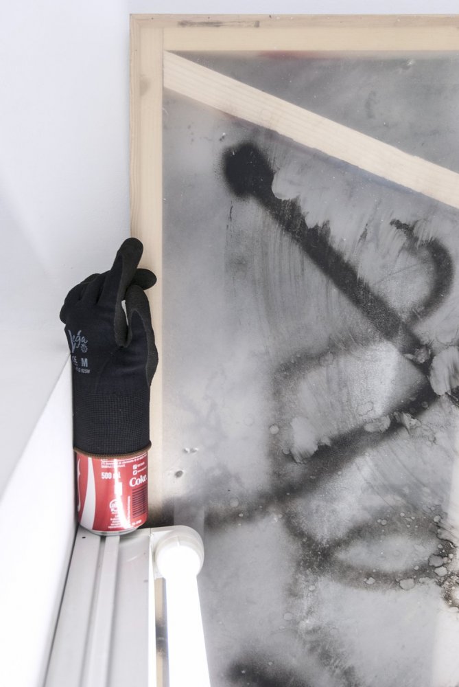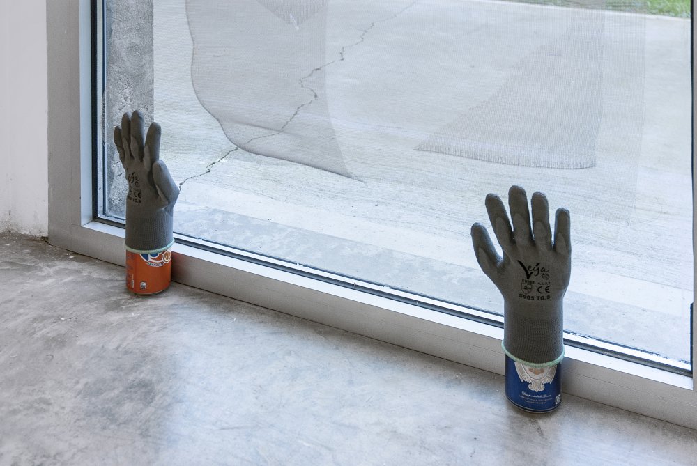 This is an exhibition that is anything but static, however hard it might try to be. Donzeaud’s experiments in turning a plastic used for containers into flat screens that adapt to the walls of the indoor space are stretched out and over a frame; sometimes hanging like a canvas in ‘Untitled PE (Caring 01)’ and ‘Untitled PE (Caring 02, 03, 04)’ or jutting out of wall and becoming a sort of installation-sculpture in ‘Untitled PE (Caring 05, 06)’. The view to these works shift and change depending on the angle from which you look at it. Meanwhile, the potential pun of the gloves, bubble wrap and canned drink sculptures Cruces calls ‘Handy Cans’ (2014) frame these images, nodding to a human hand but containing only a synthetic simulation of it. Like a photo or a moving image made by a handycam, being alive is one thing, the anatomy of how that life lives is another. **