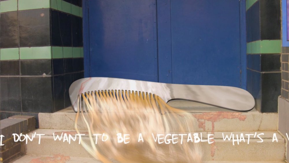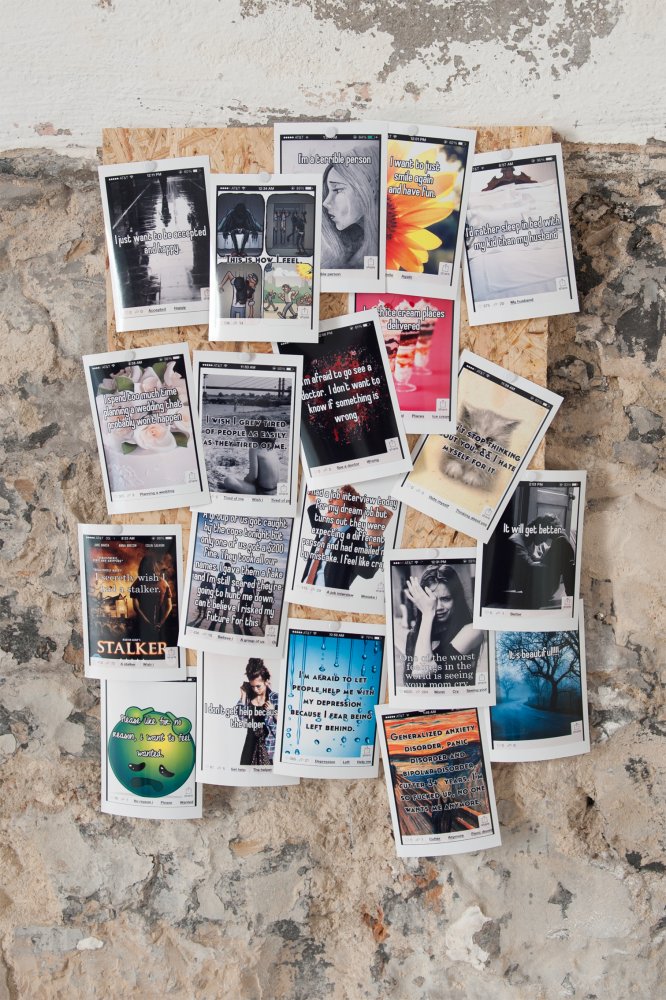 Jasper Spicero‘s wall-hung iPad featuring a generic looking bedroom is tangled up inside a web of taut and tied-together shoelaces. Cecile B. Evans‘ dancing animated scissors are singing Sade’s ‘No Ordinary Love’ through the stilted tonal blocks of a Vocaloid application in a projection of ‘How happy a Thing can be‘ (2014). Matthew Landry‘s ‘Whisper’ collection of personalised image-board posts tacked to a couple planks of wood announce “MY BEST FRIEND MAKES ME UNCOMFORTABLE” and “Ummm”. Amalia Ulman‘s slide show presentation ‘The Future Ahead’ (2014) video – also shown at the artist’s The Destruction Of Experience solo exhibition in London last year – takes Justin Bieber as a starting point to exploring femininity in terms of masculinity and teen girl fandom: “he’s still monetizing on their prepubescent love-business”.