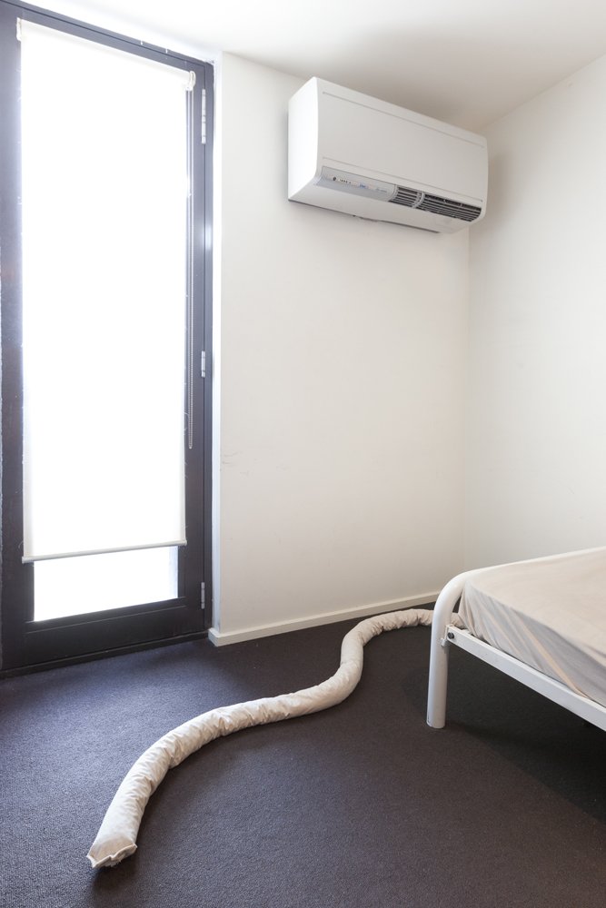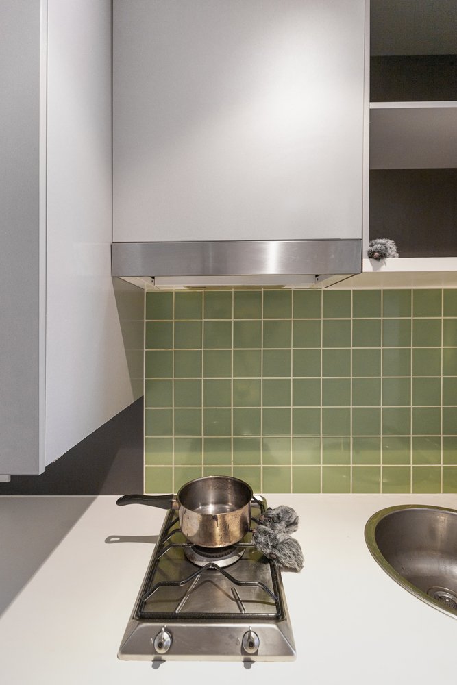 There’s a temptation to put Aiden Morse‘s name after, rather than before, Anna Crews‘ in the title of their latest Quiet Enjoyment (photos, top right) project for the sake of subverting male privilege. Except that that would kind of defeat the purpose of the pair’s practice, which is all about not so much playing with but essentially mimicking normative gender roles in an effort to expose them. Installed and then dismantled in their shared home in Melbourne’s Barkly Place the day before moving out back in January 29, the show is viewable only via its documentation of stove tops, plush toys and heartshaped sandwiches in a rather spartan though swish-looking studio apartment.
