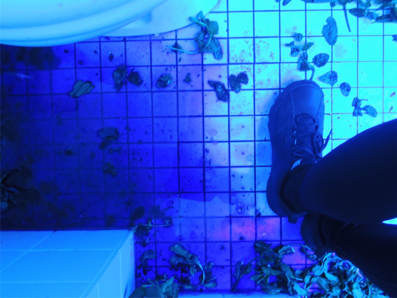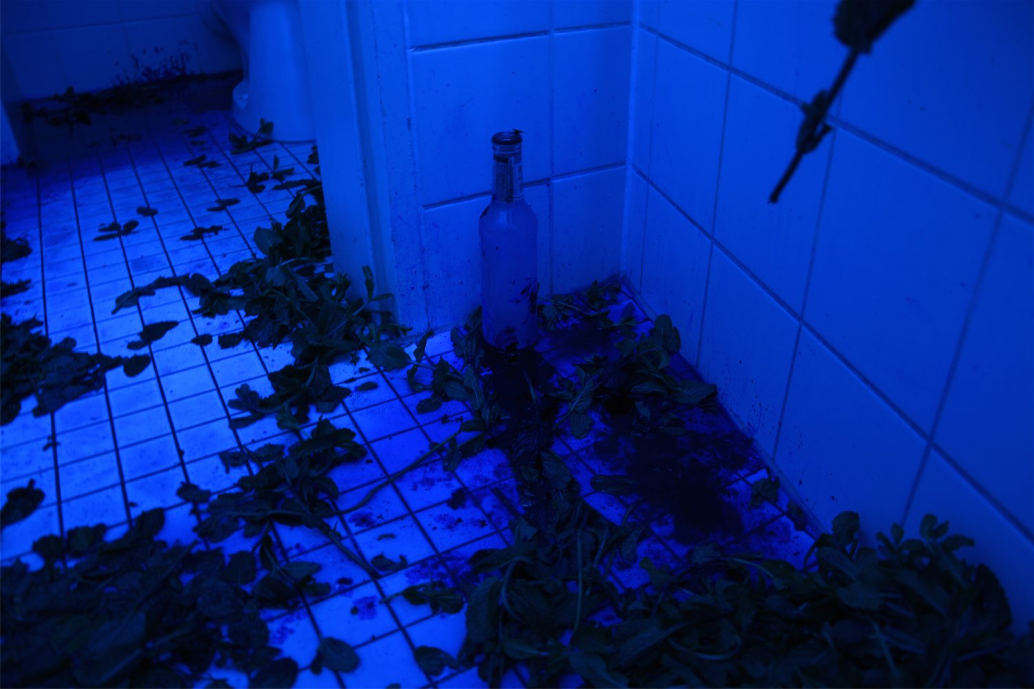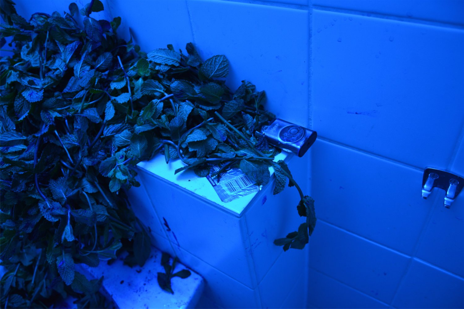 A suspended watermelon rotates at the centre of a shifting circle on a large LED screen in a corner as a monstrously distorted voice quotes an Apple Store description of a product that configures “an entire computer system on a single chip” in Renard’s ‘iWatch HD’ (2015). Pink and white walls are met with pink and white ceiling lights, while Wallert’s site-specific installation ‘Amanda’ (2015) hides in the bathroom. Fresh mint leaves and their stalks fill the sink and the floor, lying squashed and stepped on over white tiles daubed with blue ink and scattered with soda bottles. Dense and dirty imitation Dove body lotion containers made up of clear resin and sprinkled with “girlfriend dust” are perched next to low black metal benches, their milky body cream contents smudged across wall-length windows that someone’s signed with a finger. A diptych of digital prints by Renard and Sandra Vaka Olsen hang on a wall, the shattered screen picture fragments made up of lines of electricity that collide in shared tones and become form within their frames.