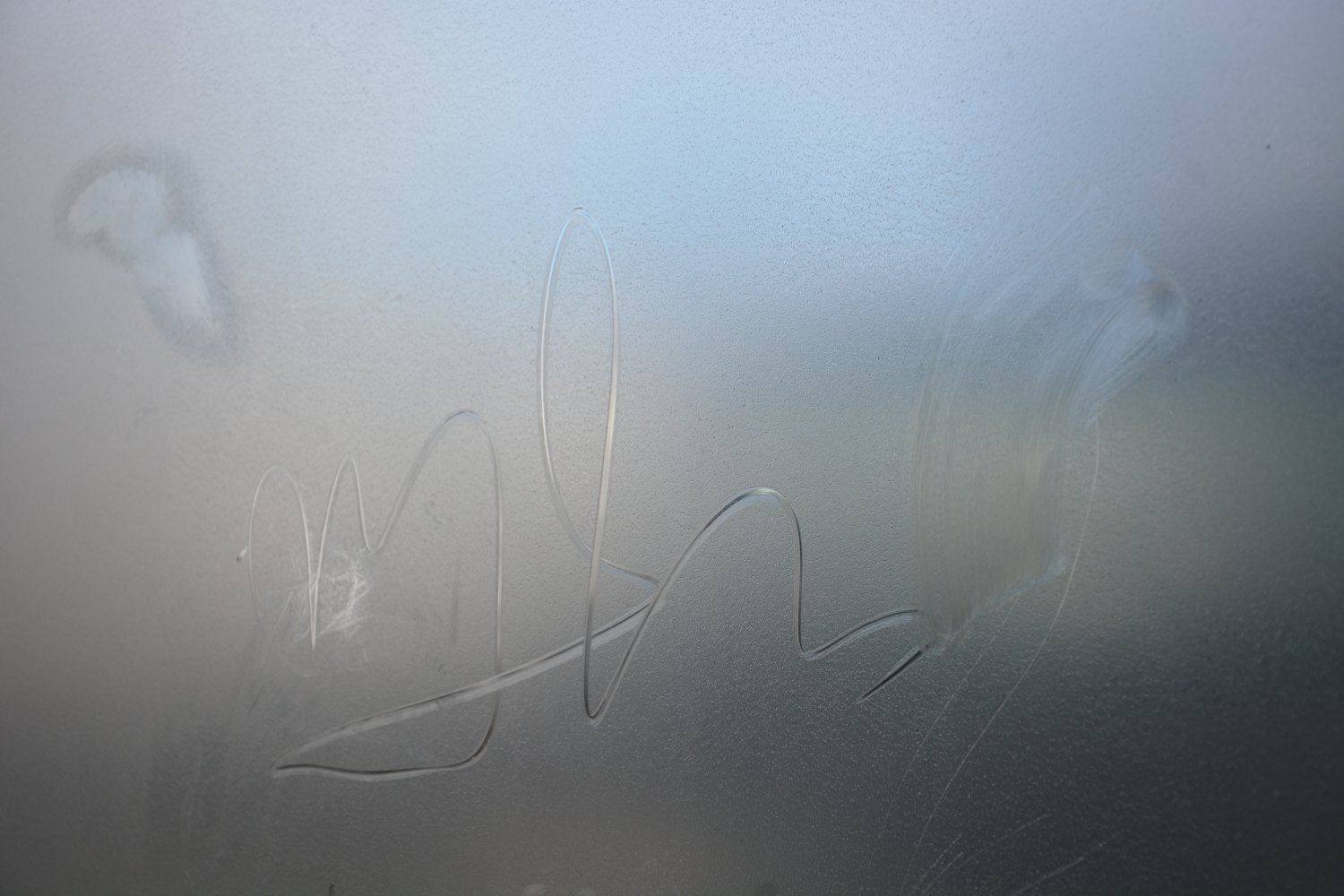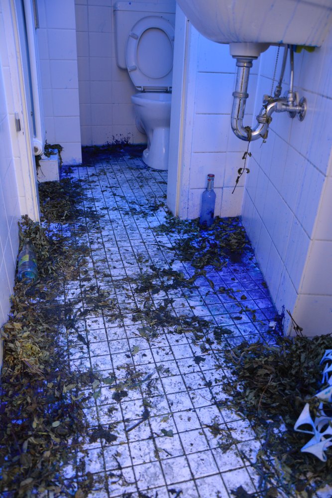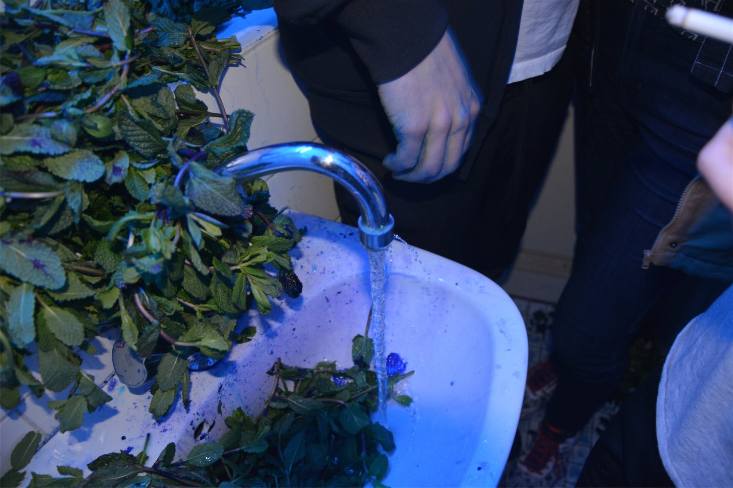 A suspended watermelon rotates at the centre of a shifting circle on a large LED screen in a corner as a monstrously distorted voice quotes an Apple Store description of a product that configures “an entire computer system on a single chip” in Renard’s ‘iWatch HD’ (2015). Pink and white walls are met with pink and white ceiling lights, while Wallert’s site-specific installation ‘Amanda’ (2015) hides in the bathroom. Fresh mint leaves and their stalks fill the sink and the floor, lying squashed and stepped on over white tiles daubed with blue ink and scattered with soda bottles. Dense and dirty imitation Dove body lotion containers made up of clear resin and sprinkled with “girlfriend dust” are perched next to low black metal benches, their milky body cream contents smudged across wall-length windows that someone’s signed with a finger. A diptych of digital prints by Renard and Sandra Vaka Olsen hang on a wall, the shattered screen picture fragments made up of lines of electricity that collide in shared tones and become form within their frames.