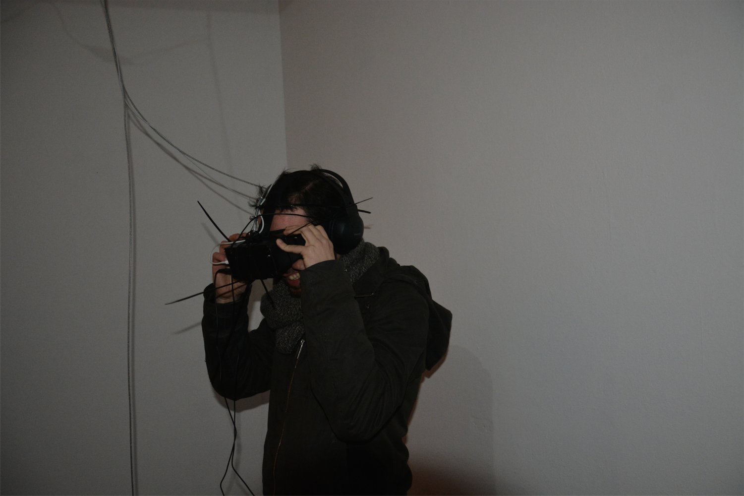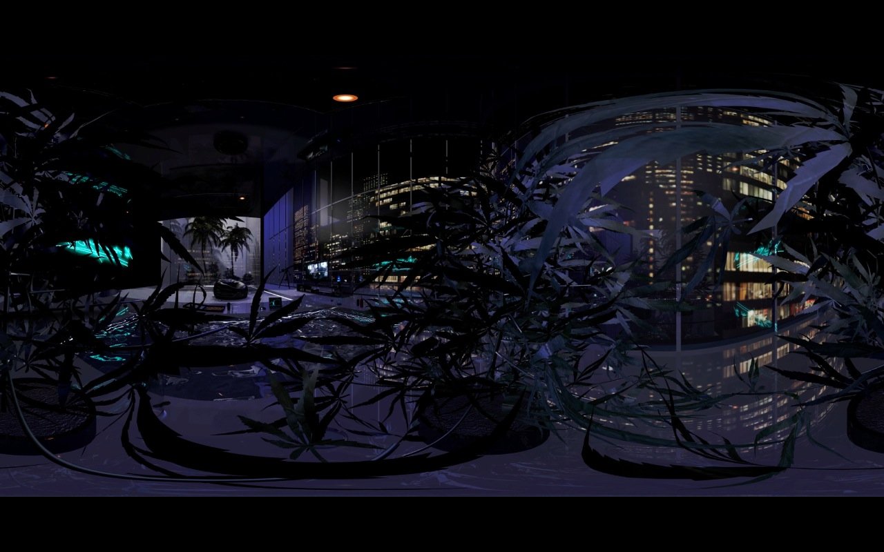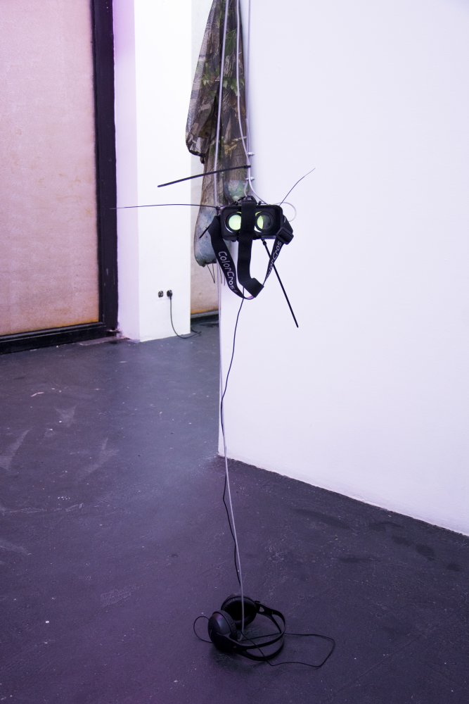 Camouflage-themed VR goggles hang by wires from the ceiling across from a matching jacket –dubbed ‘geek dress’ in its image file –with virtual views to Kate Sansom and Timur Si Qin‘s ‘Nissan Yoghurty’ (2015) rendering of a vast and empty gallery. There’s an eerie montage of violent home footage in Anthony Salvador‘s ‘DONTBRINGAKNIFE2AFISTFIGHT’ (2014) digital video, where you’re not just a viewer but an accomplice, while Grégoire Blunt and Emmy Skensved‘s (who recently completed eStamina) ‘center_H264_2000px_1500kbps_ACC’ (2015) presents a CGI room with a view. You can watch through the plant leaves that look like they’re weed, across to a simulation of water that swells to the icy beats and melodic computer-chimes of a corporatised environment that’s completely lost touch with what’s real. **