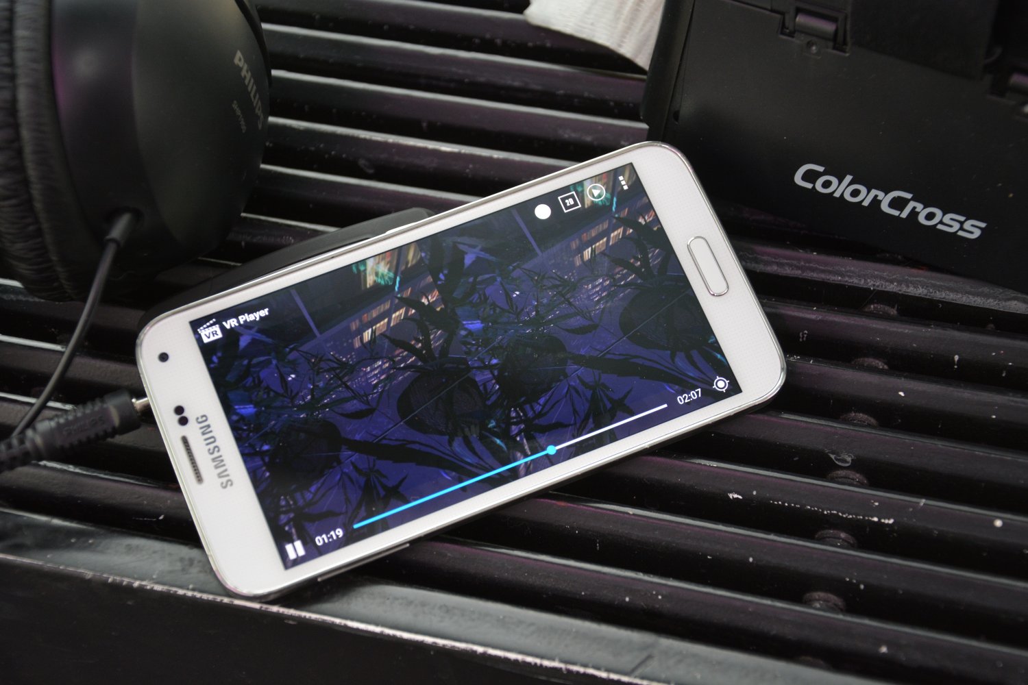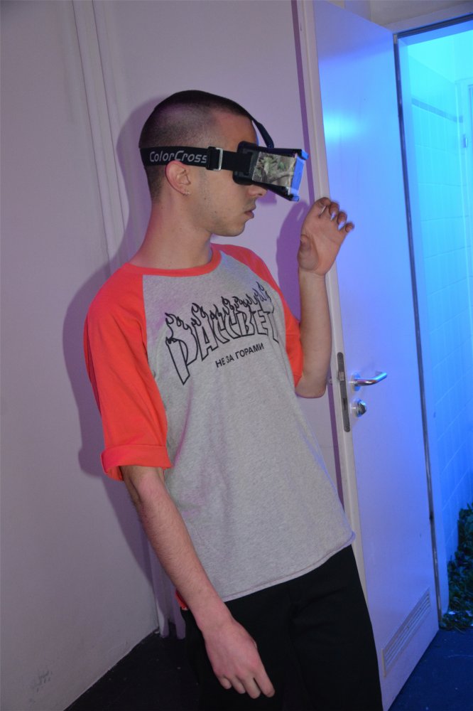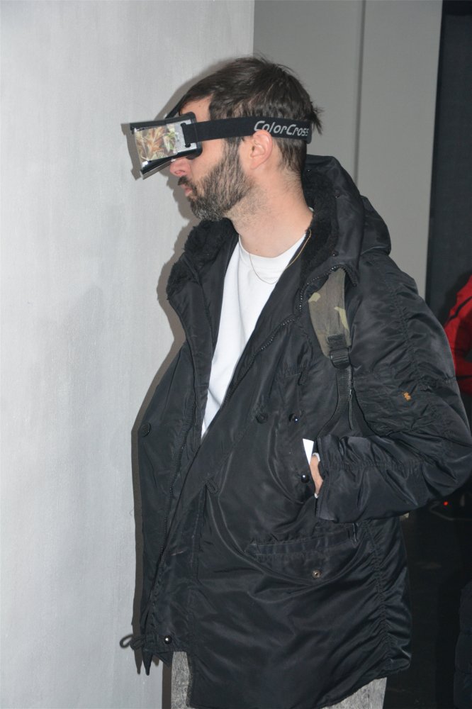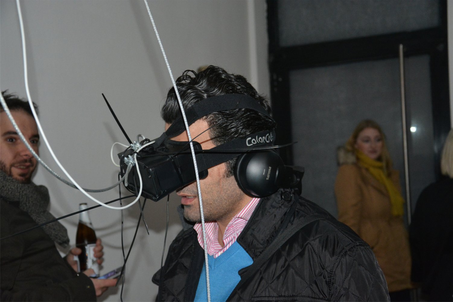 Camouflage-themed VR goggles hang by wires from the ceiling across from a matching jacket –dubbed ‘geek dress’ in its image file –with virtual views to Kate Sansom and Timur Si Qin‘s ‘Nissan Yoghurty’ (2015) rendering of a vast and empty gallery. There’s an eerie montage of violent home footage in Anthony Salvador‘s ‘DONTBRINGAKNIFE2AFISTFIGHT’ (2014) digital video, where you’re not just a viewer but an accomplice, while Grégoire Blunt and Emmy Skensved‘s (who recently completed eStamina) ‘center_H264_2000px_1500kbps_ACC’ (2015) presents a CGI room with a view. You can watch through the plant leaves that look like they’re weed, across to a simulation of water that swells to the icy beats and melodic computer-chimes of a corporatised environment that’s completely lost touch with what’s real. **