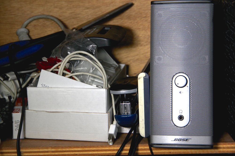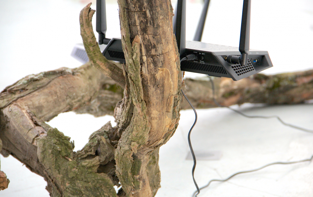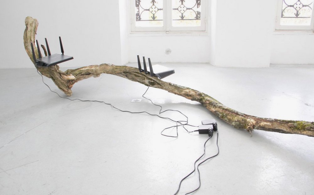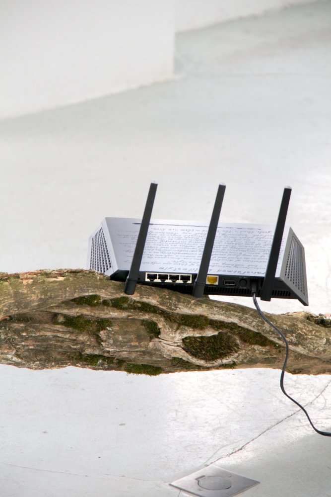 Examining curation as an active, dynamic practice, they set up a landscape or “micro ecosystem” of signs and signals composed in hand-engraved text on various objects, like routers, silent speakers, laser pointers, and organic matter. “In this landscape,” they write, “the works co-habit the space harmoniously. This landscape however, harbours a system of signification that is not always visible, at times manifesting a disruption that destabilises this found harmony.” **