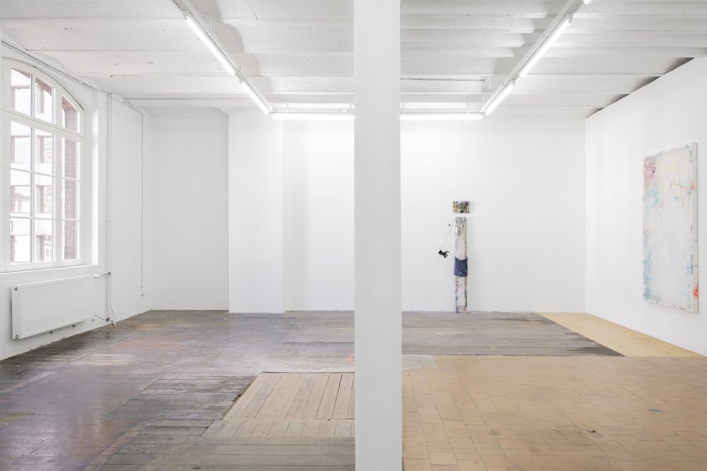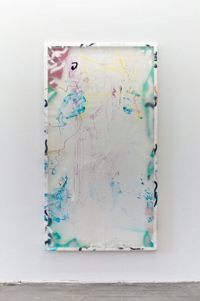 These are works here that show traces of colouring on translucent canvas with light projecting through the opposite side. A painting like ‘Untitled PE (Raising 1)’ (2015), shows unstructured shapes, of lines, dots and surfaces; shapes sprayed and scattered with aerosol paint. Its see-through film exposes a frame of a canvas. It enhances the fragility of paintings that implies a vulnerable state of ruins, like a broken window of a disowned home. Those elements conjure an image of demolished modern houses, or vandalised cities with their multi-layered traces of travel through time, from the past to the present.