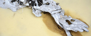 Nearby on the ground Tore Wallert’s Sponsored by Destiny (2015) stretches like the prostrate body of a barely discovered deep-sea creature, the kind that live in darkness and feed on oil. From this scrunchy package of toxic usables—plastic, epoxy, resin, fibreglass, permanent ink, polyester fabrics—ratchet straps snake out like the treacherous stinging tentacles of a Blue Bottle jellyfish, its nose points towards the wall where Clemence de La Tour du Pin’s two prints hang. Worked and layered, these textured prints bare leaf impressions like tattoos on skin, wearing their tread marks like bruises. One of the prints, Tean_Crimson Blood (2015), sheds its rusty crust onto the floor below, toxic like body fluids and powdery like uranium-enriched pollen.