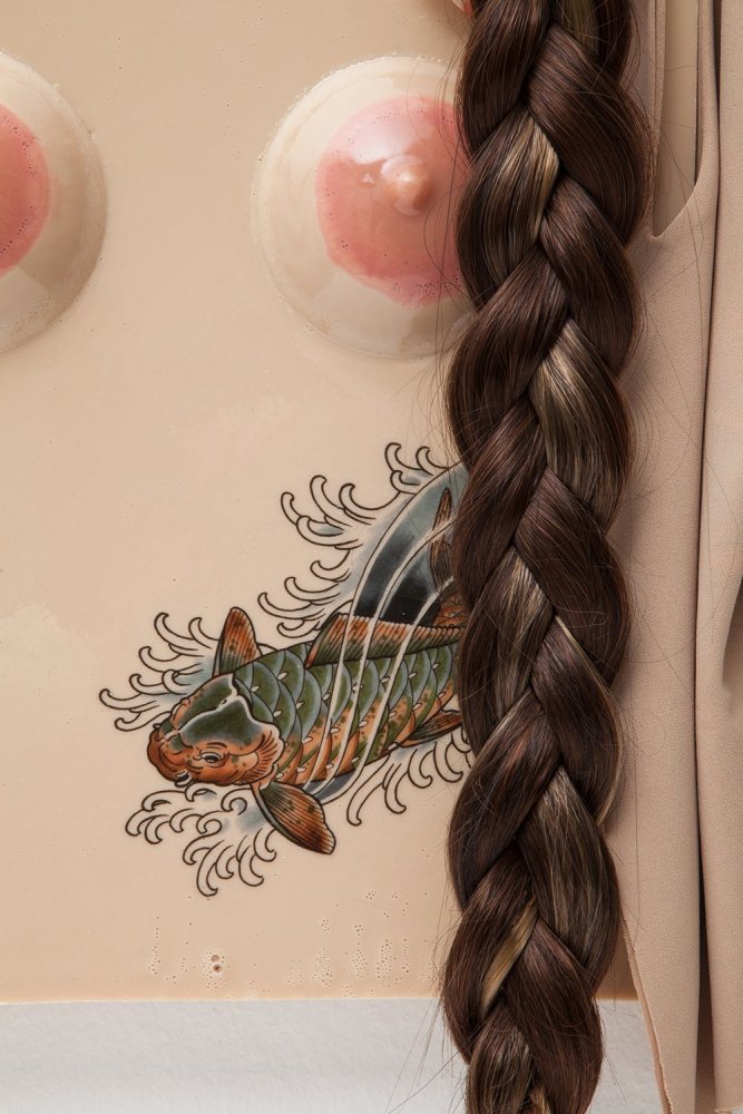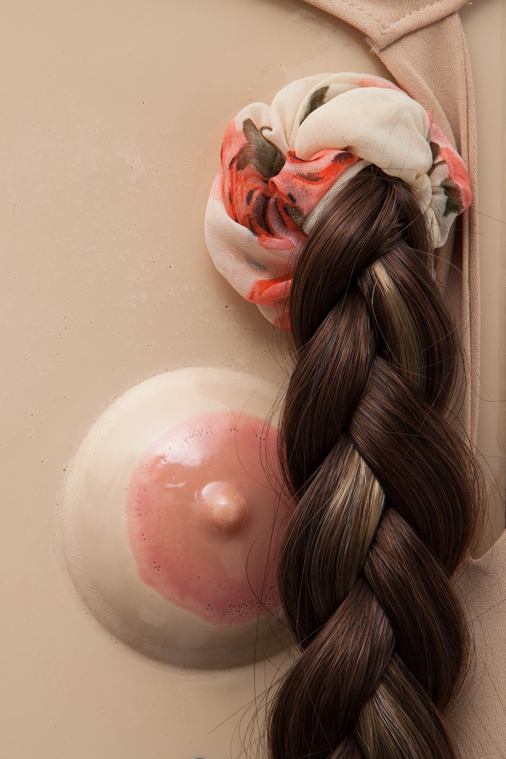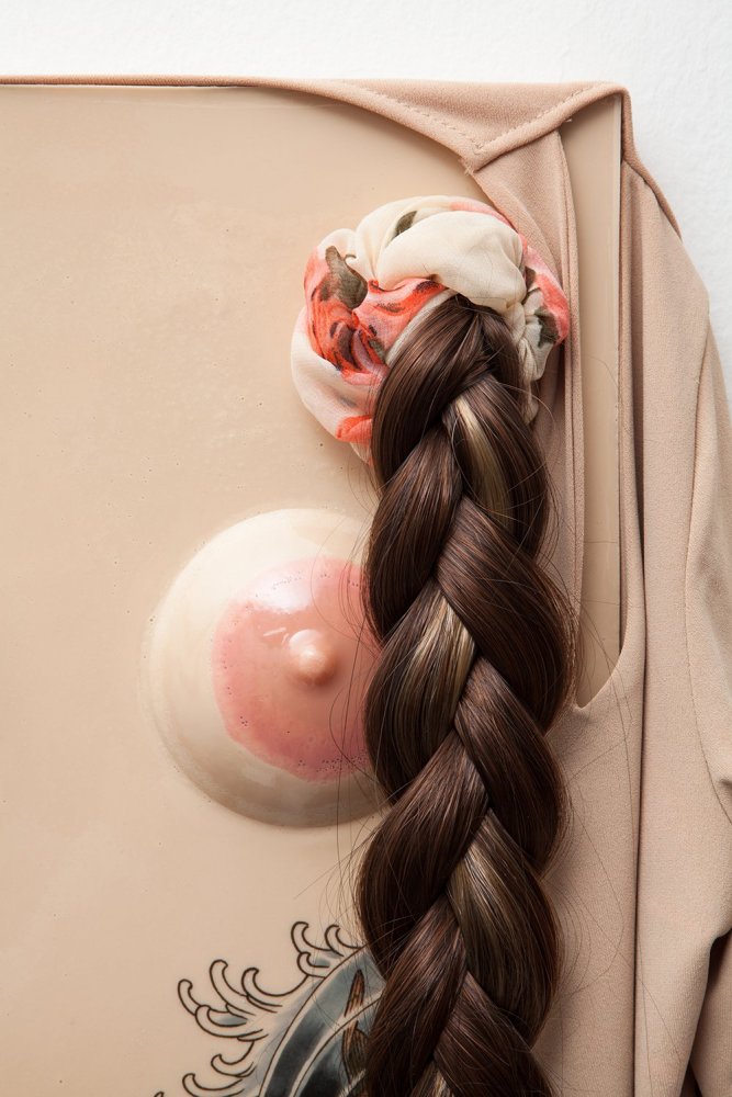 The solo exhibition is introduced with a short text describing textually the girl that we are to see visually represented in the exhibition: “She is a romantic girl,” it begins, “in fact, one morning while soaking a biscuit in her cappuccino, she felt touched.” Painting the picture of a girl with a white iPhone, racially sensitive emoticons, and tight Lycra clothing, Rose is just contradictory enough to be convincing. “Rose is Rose,” the text ends, and the exhibition, showing the supposed Rose’s long braid held together with a flower-patterned scrunchie and the “pretty tits” she gets lost drawing, picks up where the text left off.