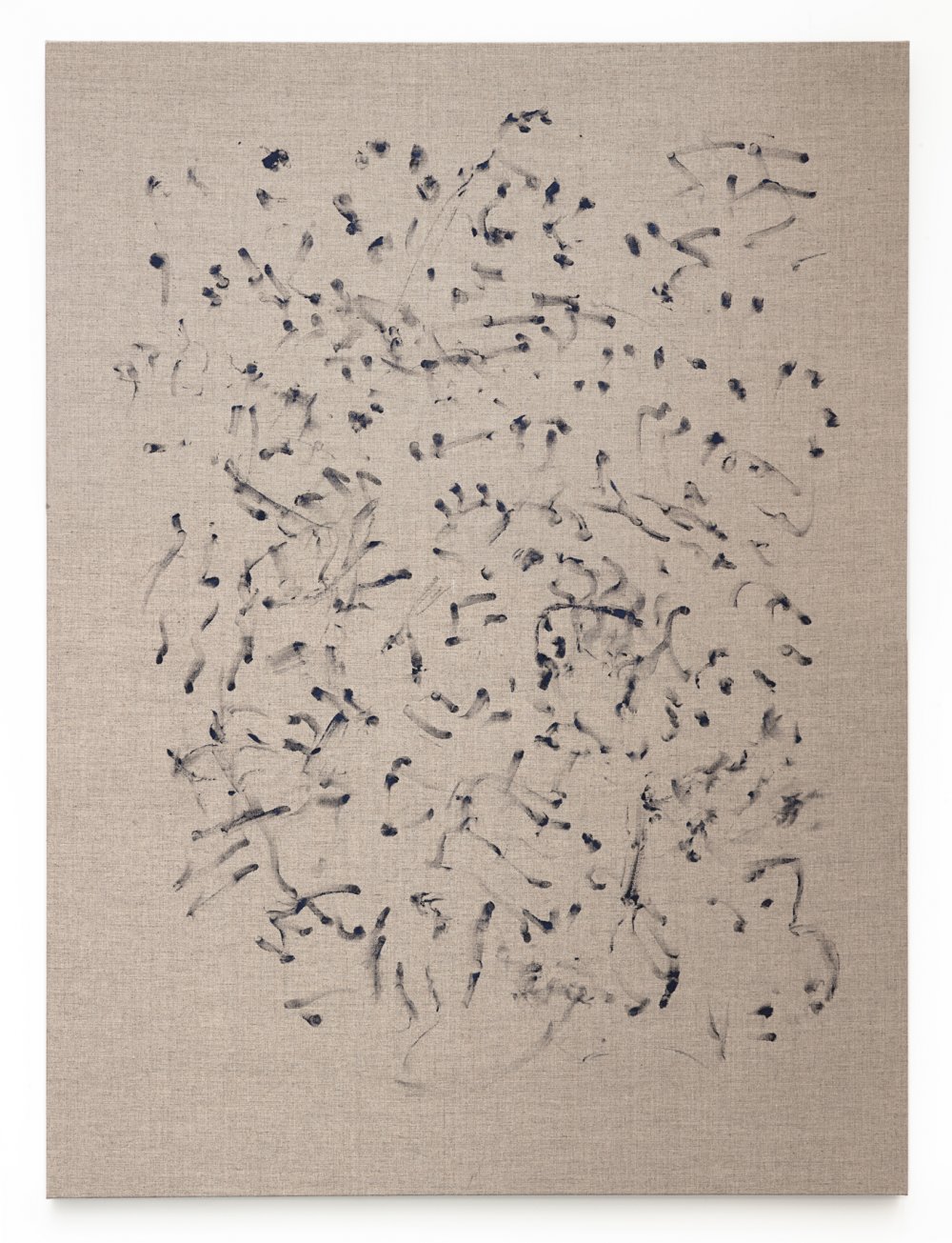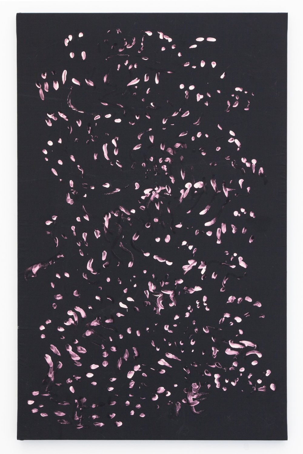 Huanca paints her model’s bodies in smoothe pools of blended colour mixes, thereby reducing their humanness and masking them in a lack of definition. In ‘Finger Paintings (YSL, faux CILS)’ (2015), with black coloured traces of fingertips on the brownish canvas , these fingers are used as mere mediators that make aimless traces on canvases. It can be seen as a mimicry of animal’s footprints on earth. However, they’re hard to trace because of their aimlessness. **