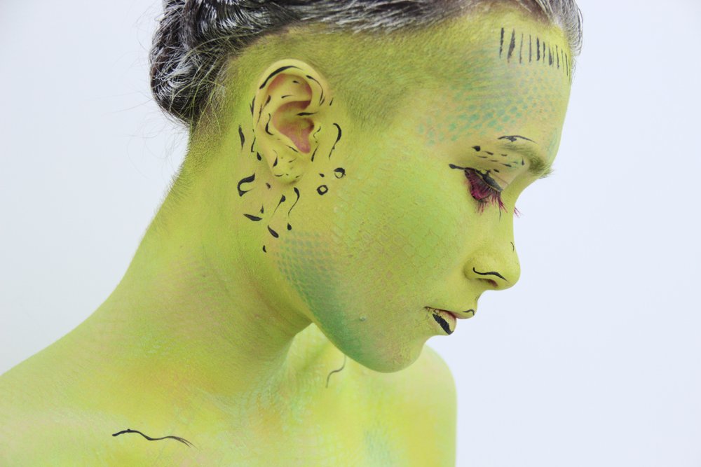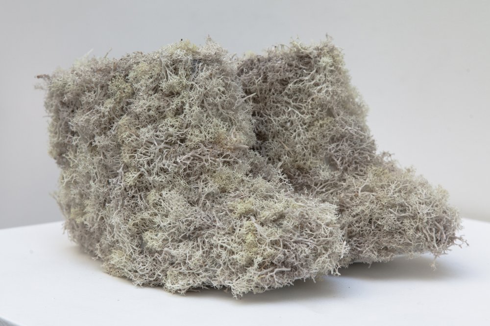 In ‘Nudity’ (2015), the artist emphasises the strangeness of these objects with the use of pale colours, but in a nature-friendly way, that is, by downgrading these civilian clothes into ancient forms made from animal furs or leather. Most objects in the exhibition, including the physical form of models Giulia Munari and others, are dim and faint in colour, located middle-gray. If these models or objects were to hide in a natural landscape, they might be difficult to discern but when displayed in the gallery space, with its white walls and smooth cement floor, they’re highlighted and foregrounded. The only way that bodies and objects can survive in the white cube then, is to adapt with similar colours in the hope that they too can be camouflaged here.