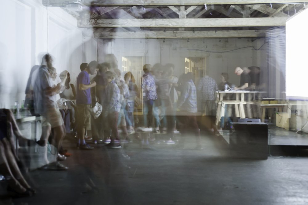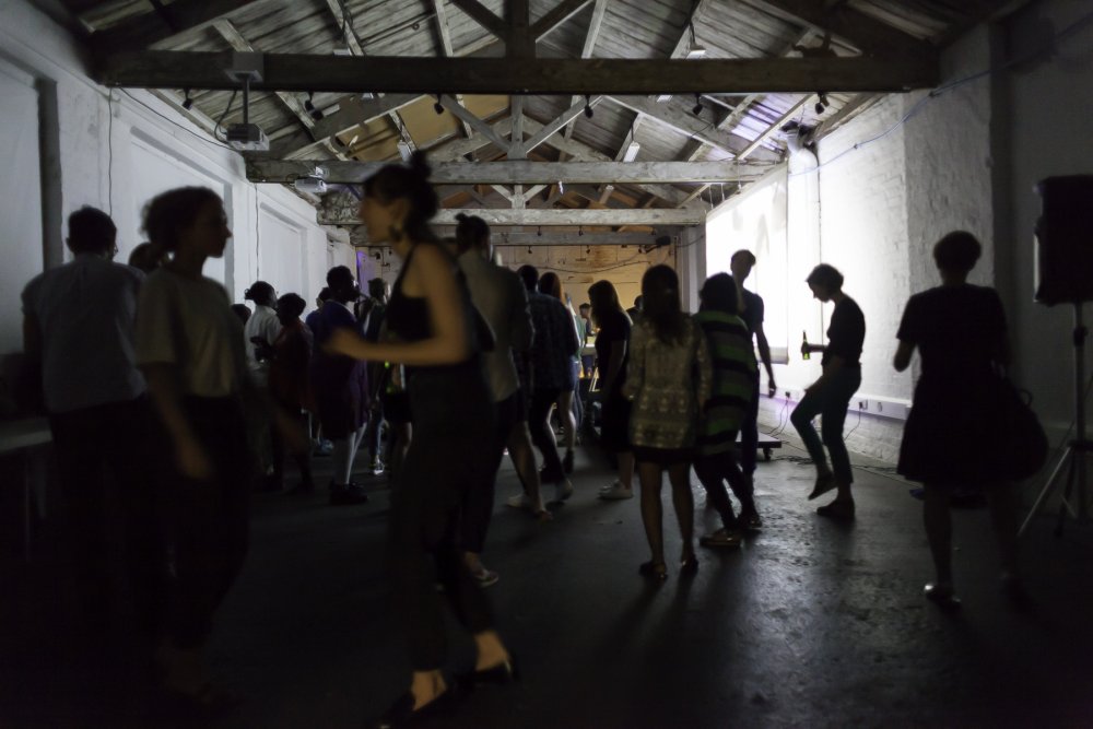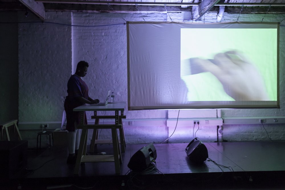 Evan Ifekoya’s ‘Let the rhythm keep pulling you towards ur edges (after Marlon Riggs)’ (2015), is a rich multi-channel audio-visual performance. Spoken-word recordings, music and remixes are cued over a projected video montage and live-updated twitter feed. The video weaves together viral YouTube dances, Fred Astaire’s notorious tap dancing scene as ‘Bojangles of Harlem’ in Swing Time and archival film of works by Harlem Renaissance-affiliated sculptor Richmond Barthé, alongside video of Ifekoya combing their hair and setting up a mirrorball in a green-screen studio. Their twitter feed is live-updated with the content of the spoken-word recordings, a story of a romantic encounter on a night out, played alongside a heterogeneous selection of modern pop and not-so-pop music. At one point Spice Girls collides with Snoop/Pharrell tongue-clicks. I hear X-Ray Spex’s ‘Identity’ playing half-speed, sounding strangely like stoner metal.
