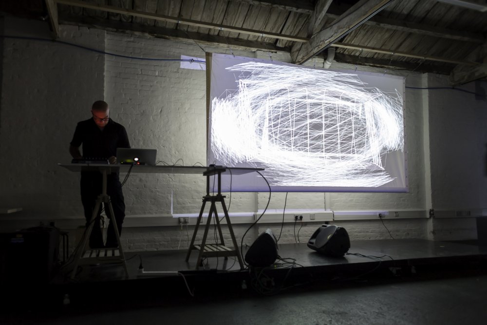 To close the evening, Julien Bayle performs ‘ALPHA’ (2014), an audio-visual show conducted on proprietary software synthesisers and sequencers, developed by the artist himself. It is sonically industrial, with driving kicks and crescendos of noise, but aesthetically minimal. Hypersensitive wireframe 3D geometries jitter and pulse in response to the sound, the projector often strobing along with the deep distorted kicks. Its simplicity and phenomenally tight synchronization creates a hypnotising and enveloping experience.