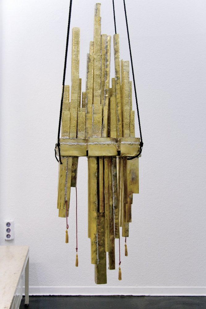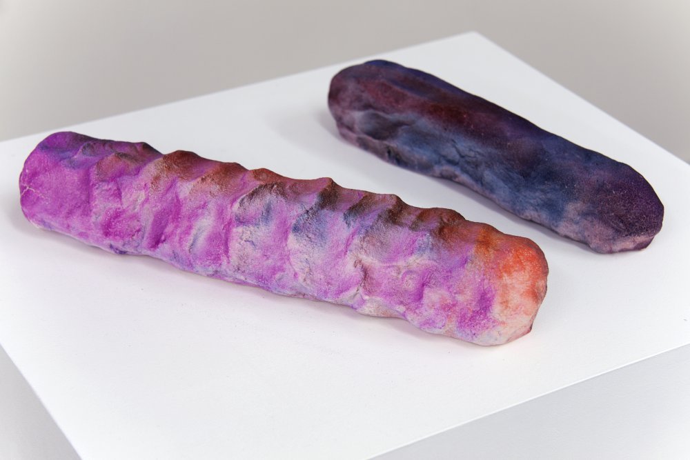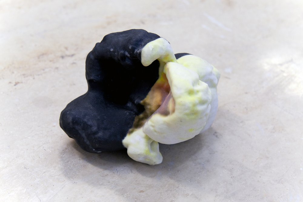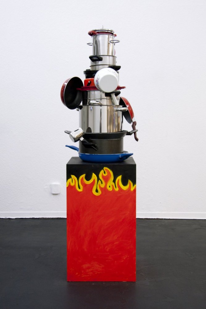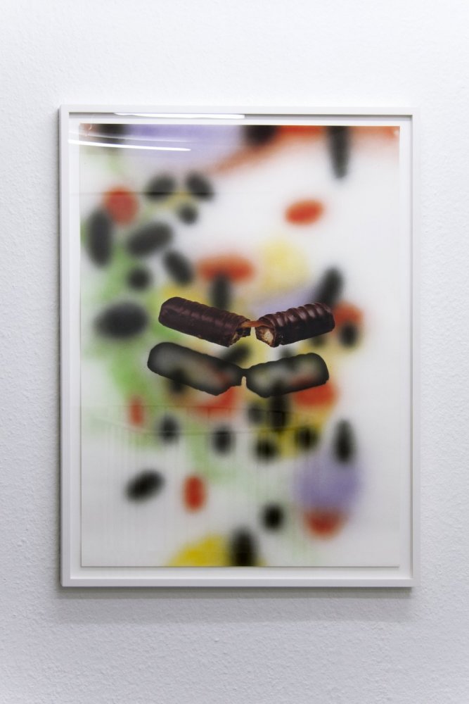 The group show, which brings in the works of seven different artists—including Katharina Fengler, Carlos Reyes and Korman himself—may or may not be moon-themed; the works do little to relieve this question. Popcorn-shaped objects—moon rocks?—coloured black and white lie on a marble countertop. A gilded sculpture reflecting a golden skyline—moon city?—hangs from the ceiling with black ropes. A precarious tower of cooking pots—moon dining?—rests on a black platform painted with red and yellow flames. On the walls, tie-dye coloured prints hold floating chocolate bars—the orbit of Mars?—in their midst.