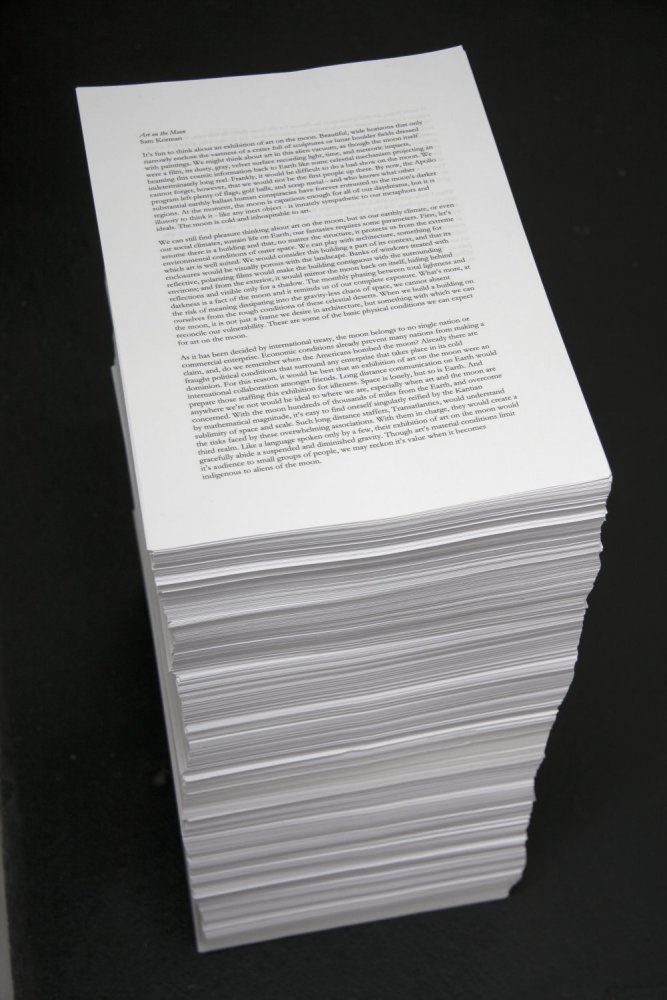 “Space is lonely, but so is Earth,” writes Korman further along in ‘Art on the Moon’. “And anywhere we’re not would be ideal to where we are, especially when art and the moon are concerned.” He recommends that an exhibition of art on the moon is an international collaboration among friends: “some friends, a student, someone from our hometowns, and a few artists with whom we’ve gained an intimacy through their work. If this exhibition,” he continues, “is to represent such interstellar collaboration, then it should exist as odd constellations, equally geometric as perspectival and interpretive.”