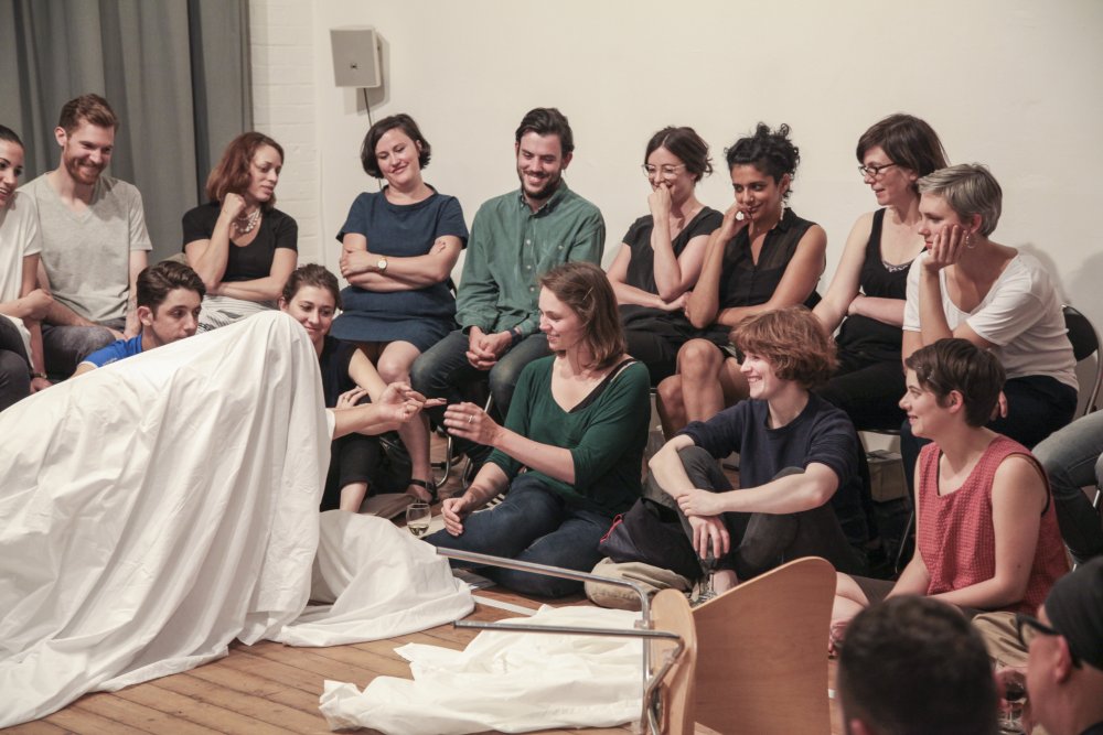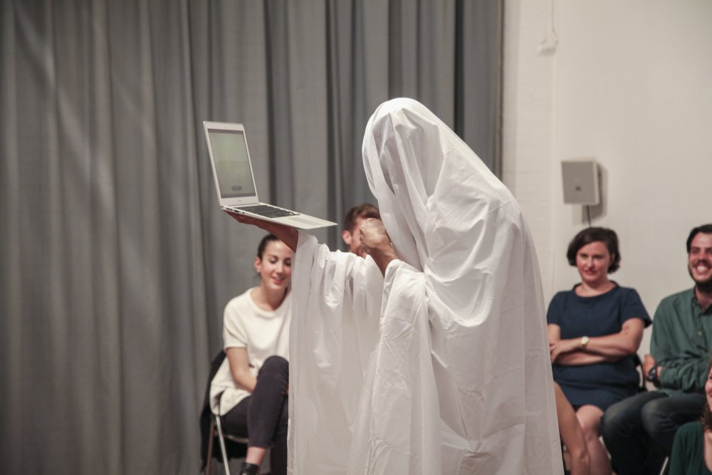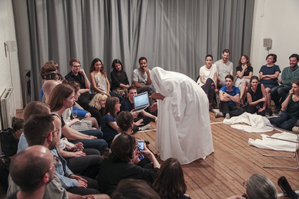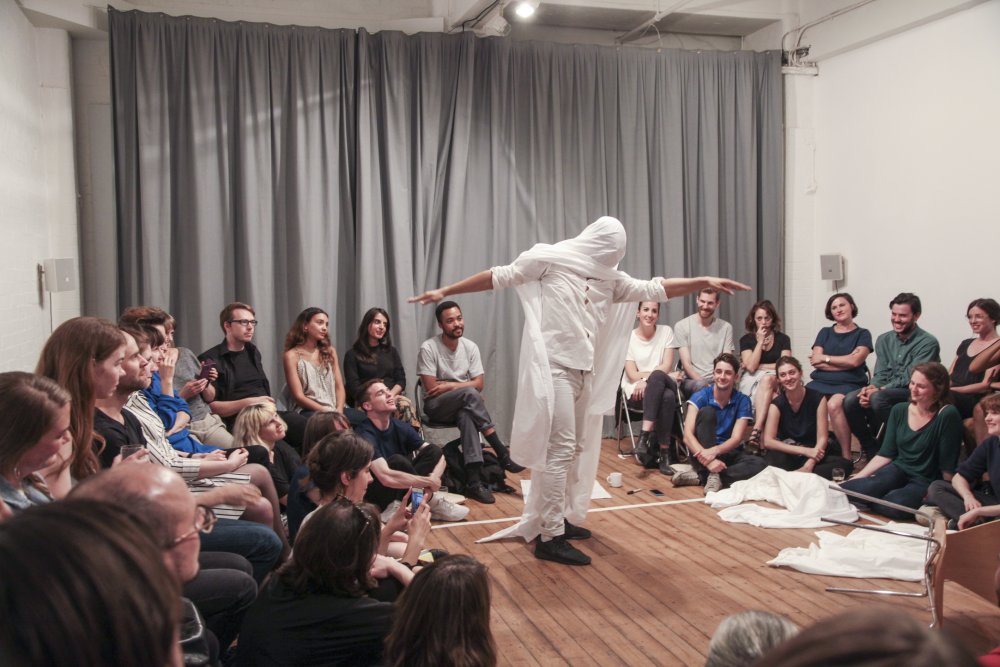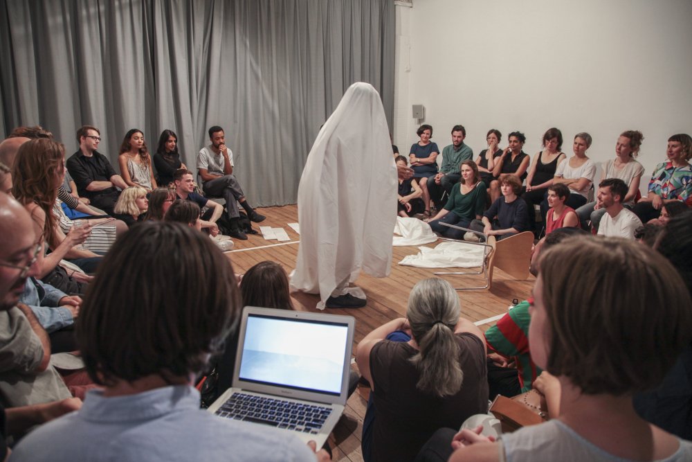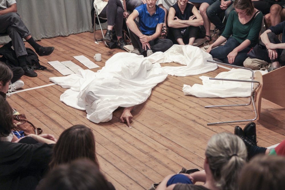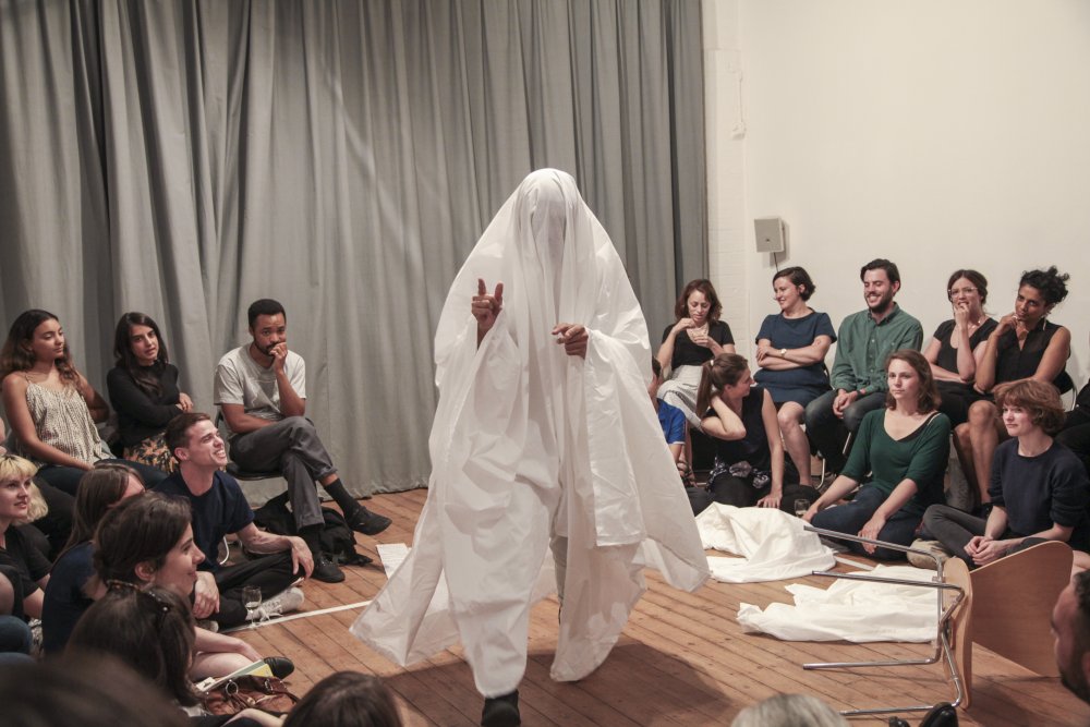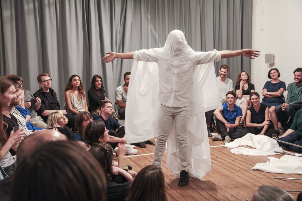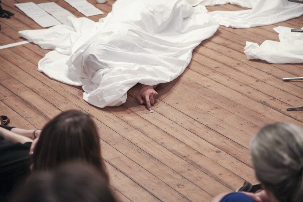 Fuata sets a timer on his phone, then changes into his performance clothes – a white shirt and jeans. After stepping into the middle of the room, he covers himself with a king-size white bedsheet. Suddenly, he is the kitsch archetype of a ghost: the laziest halloween costume or the lowest-budget film extra. It doesn’t matter. Fuata no longer has a face or a living human form. Instead, he has soft, flowing edges. He has less weight somehow. His body is no longer placed firmly in this moment.