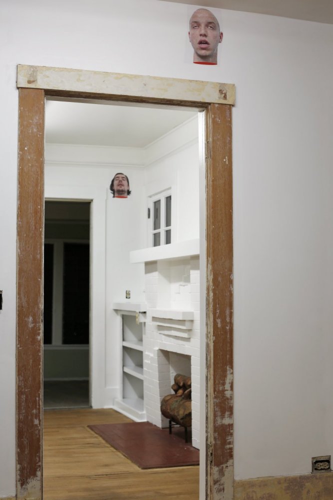 The readymade is also reimagined in the form of two commissioned written pieces ‘Dear Westminster Kennel Club’ and ‘Beyond the Forest of Disinclination’ (by Becket Flannery and David Steans respectively) which are stapled to the screen door at the entrance of  3401 Lee St. Text typically serves as an entry point into art, a preface which we believe will give us answers and insights before looking at the work. Like the other pieces in Most Loathed these texts (which present themselves as angry ‘letters to the editors’ written by animals and a bizarre fantasy style narrative) once again leave us in the conceptual dark. Davis’ pins, Buckley’s heads, and Beckwith’s Jack-o’-lantern exemplify the fantastic and absurd trends throughout the show that don’t allow us to view the work within a traditional sculptural lens. The presence of these unavoidable details acts as the pat on the back that lets us know it’s ok to stop at the obvious, that sometimes the very point is ‘not getting it’. **