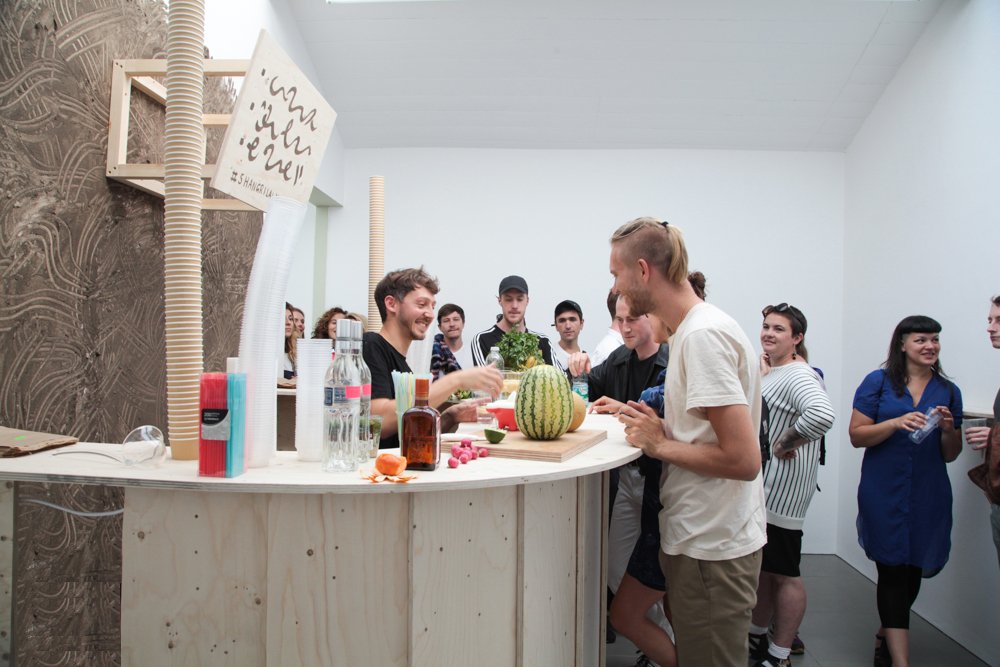 As though to absorb the event of an art show preview inside a single-bodied artwork, Jonny JJ Winter’s handmade juice bar offers “~~_`~~” (drinks), inscribed in a non-language in mud on a menu hanging above the jigsawed wood. It exists around the back of the rest of the show where it stays: a mess untouched until the close of m-Health. Rotting – but local(!!) – blended fruit sits still after a week with stale olives. The reverse side of Giles’ olive green wall has had a mud face-mask but maybe one that is left too long. It’s crumbling. ‘Hangover Drink’ (2015), which is described by the artist as something “reverse spherified” and includes an “aggressively added pinch of watercress” could have been you, intoxicated on the inside trying to physically un-do the absorption.