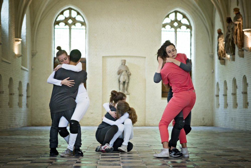 “Six dancers arrive in the space, they run around, they clear the space, they start to call each other’s name, they gather together, they touch, they bind, they squat, they build the team, they do several handstands; they tackle each other to the ground, they embrace, they roll around, they fight the wall. I think I need to change my tactics.” **
